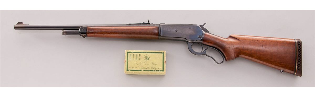 Winchester Model 71 Lever Action Rifle, #18842, converted to .450 Alaskan cal., 20'' barrel, blue finish, walnut stock, rubber butt pad, with large buckhorn rear sight and brass bead front. Originally mfg'd in 1941. Complete with reloading dies. Condition is fine as modified, retaining approx. 92% original factory blue. Stock shows moderate field use, with scuffs, nicks and scratches. Action is crisp, bore is mirror bright. The ultimate brush gun. Est.: $600-$800. (C&R)