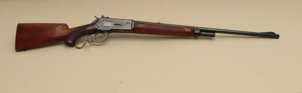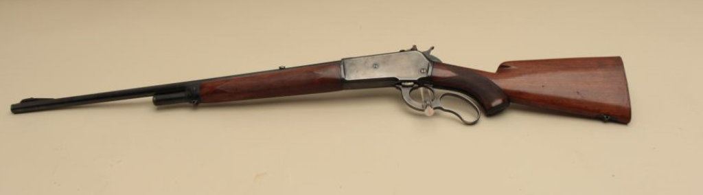 24” round barrel, ¾ magazine, checkered wood stocks with butt stock having been reduced in length with non-factory hard rubber butt pad added, bolt peep sight, S/N 2568, in overall good to very good condition showing considerable original blued finish remaining, very good bore, crisp action, sharp markings and good to very good wood as modified. (C&R). Est.: $800-$1,600.