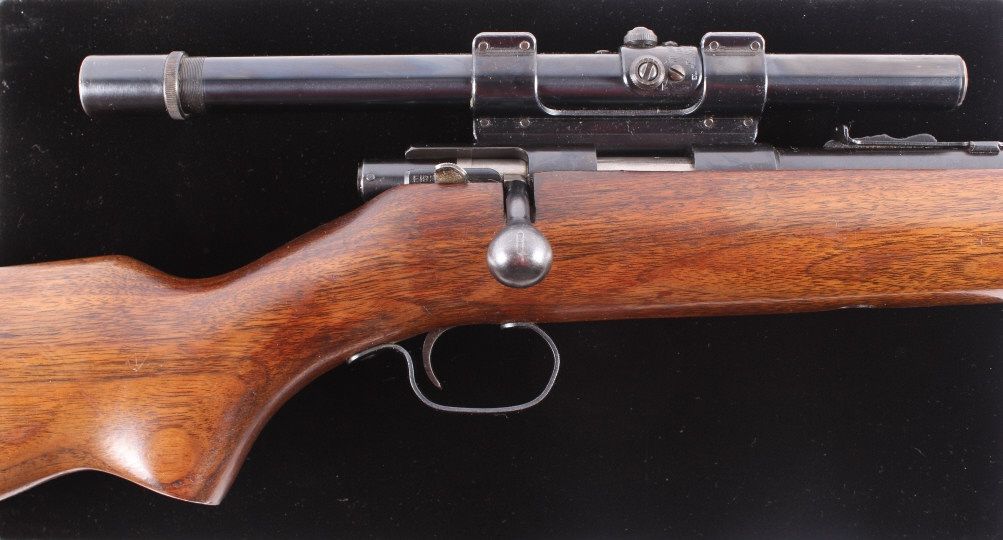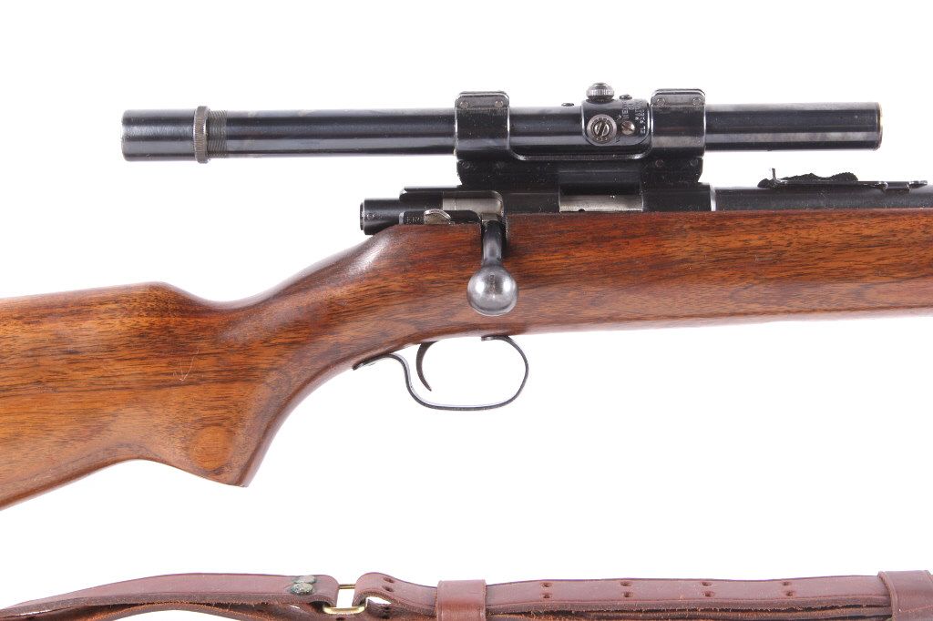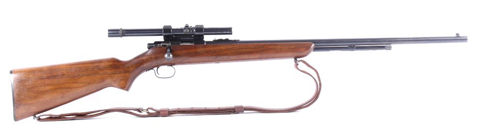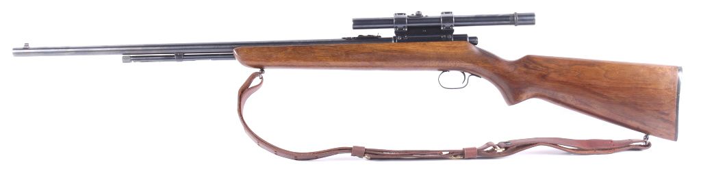 This is a Winchester Repeating Arms Company Model 72 .22 Short Long and Long Rifle bolt action. The rifle was manufactured from 1938-1949 and shows good condition with original leather sling. This one owner rifle also has the Weaver 04 scope. Tube Fed.