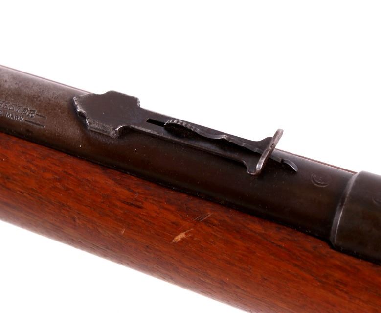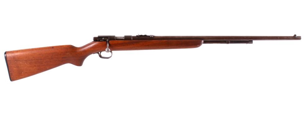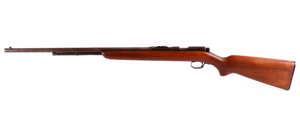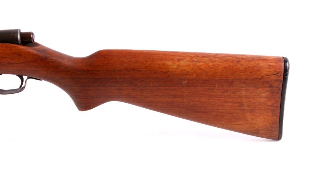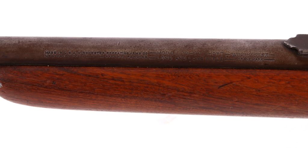 This is a Winchester Model 72 bolt action rifle chambered in the .22 Short, Long and Long Rifle caliber. The rifle features a round blue'd steel barrel and receiver with open sporting sights and a straight grain walnut hardwood stock. The left side of the barrel is marked "Made in U.S.A. Winchester Repeating Arms Co. New Haven, Conn. / Model 72 22 Short, Long and Long Rifle". The rifle is in good condition. No serial number present. This firearm qualifies as a Curio & Relic Long Gun, and requires FFL Transfer or NICS Background Check.