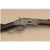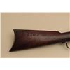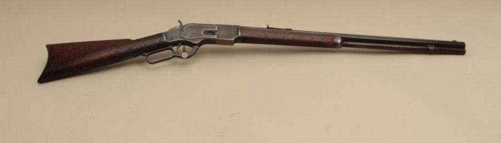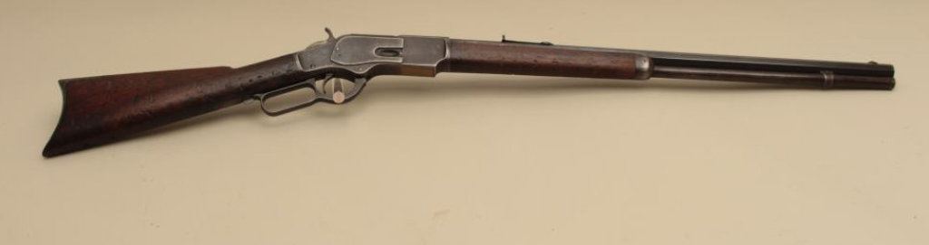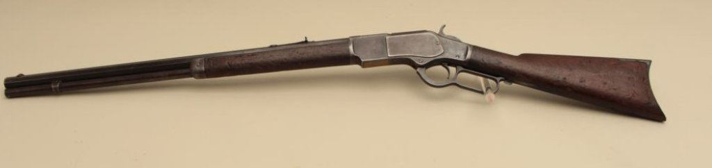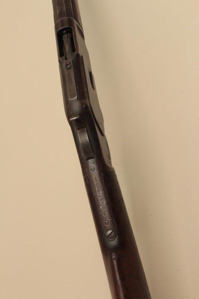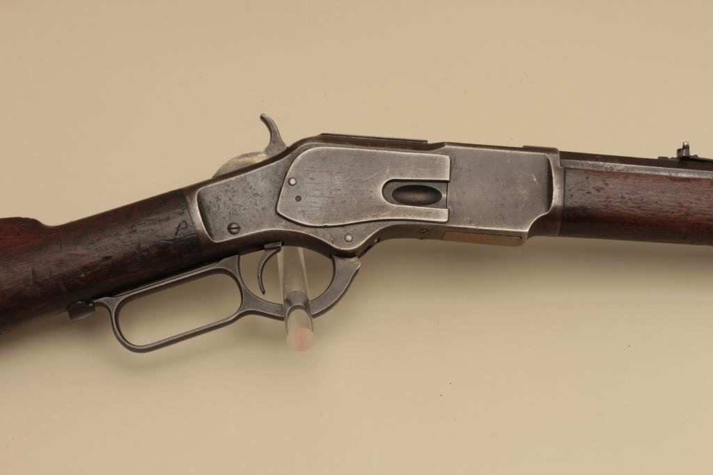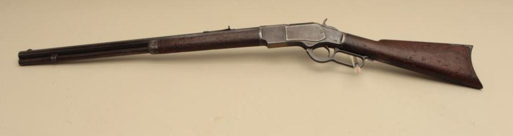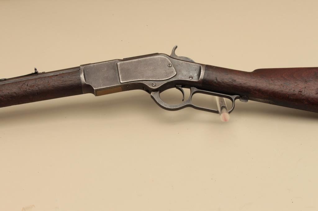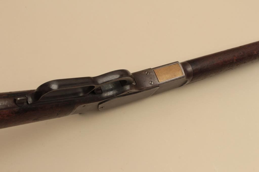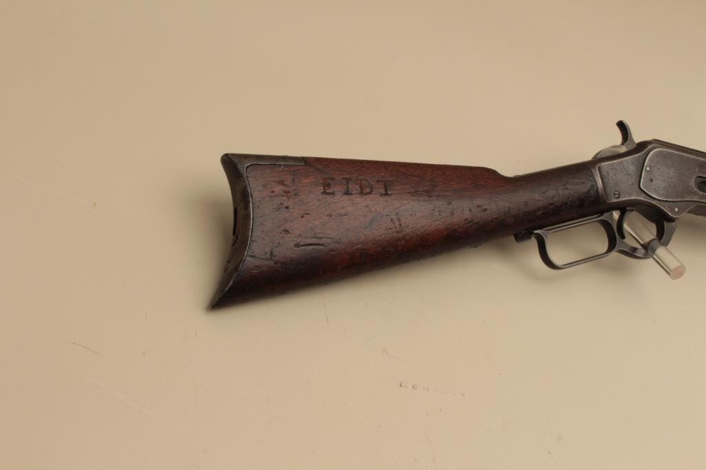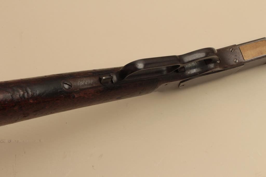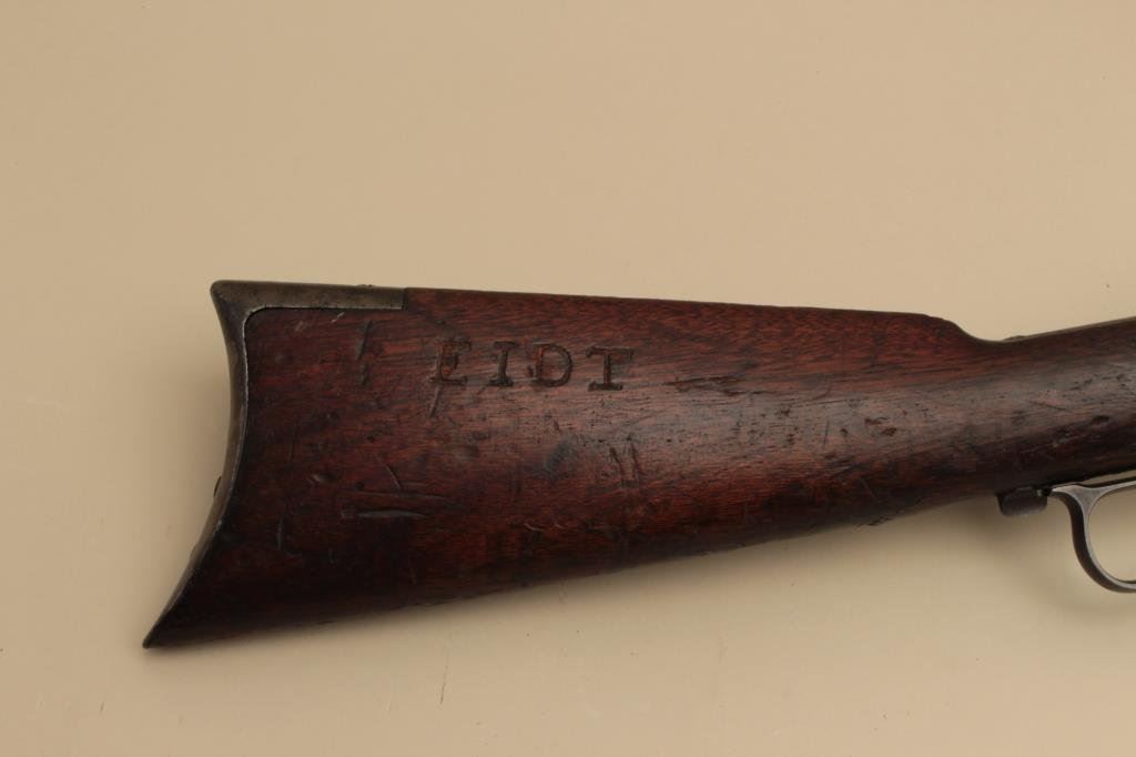 The rifle is in good overall condition with a 24” octagon barrel. The barrel and full-length magazine retain a significant amount of thinning blue finish with the remainder going to plum patina. The barrel shows sharp edges and some small scratches. The receiver has blue in the protected areas with the remainder a plum patina and the dust cover is missing. The barrel is marked, “W.C.C.O.” (Western Costume Company) and “HOP 690” in front of the ring. These could represent old rack designations or perhaps a studio gun. The smooth wood stocks show heavy use and wear. There are significant dents and bruising with, “EDIT” carved into the left side of the butt. The bore is fair, the action crisp and markings are legible. The rifle has the look of an old movie gun and should be further researched. (Antique). Est.: $800-$1,600.
