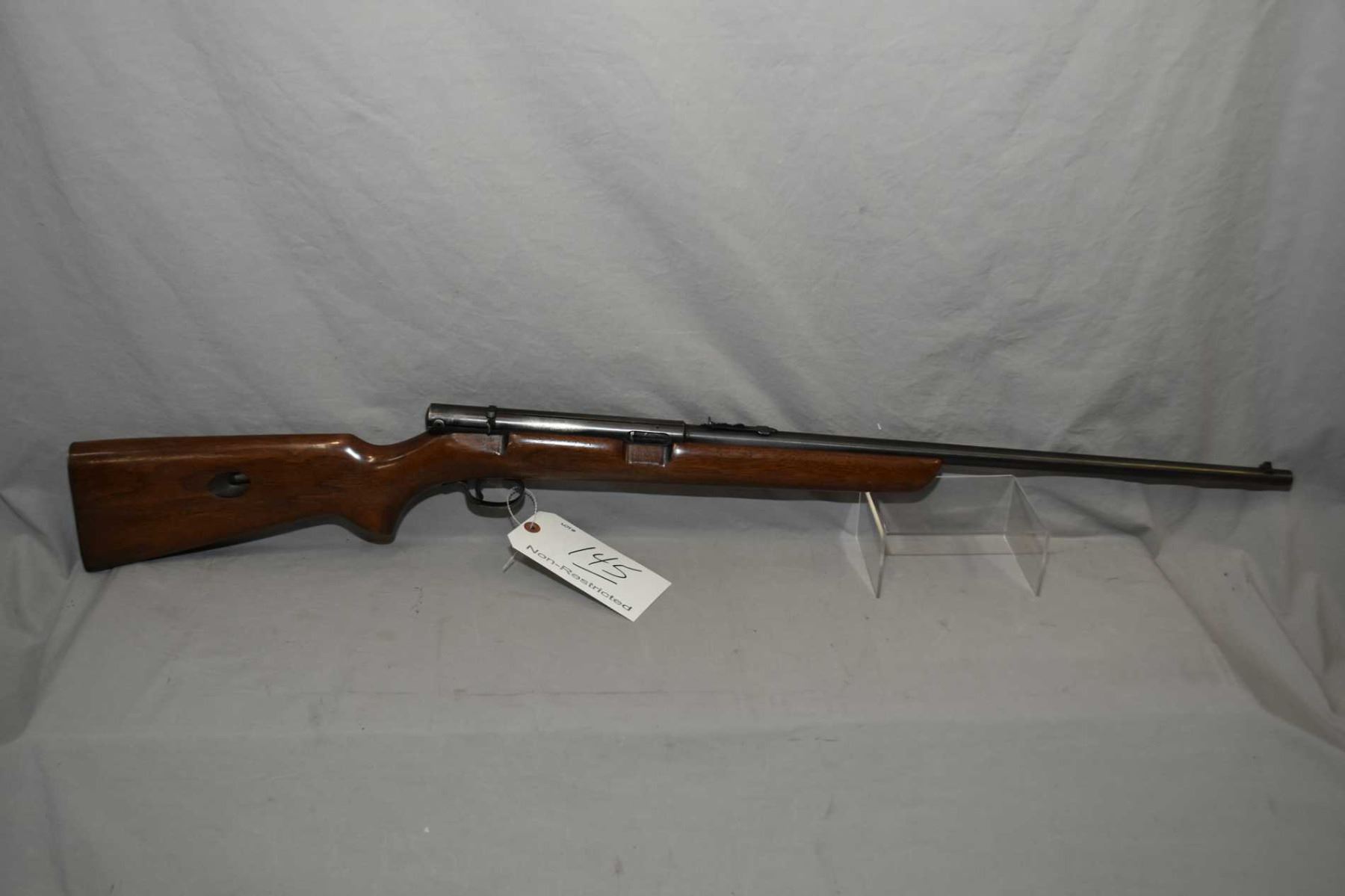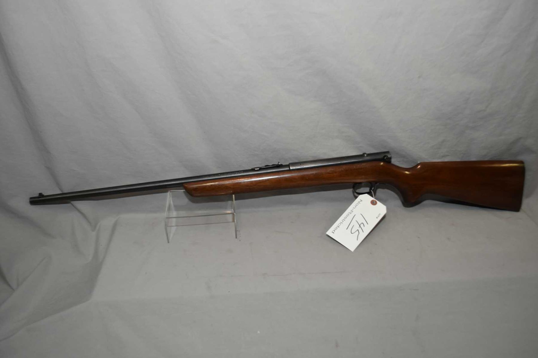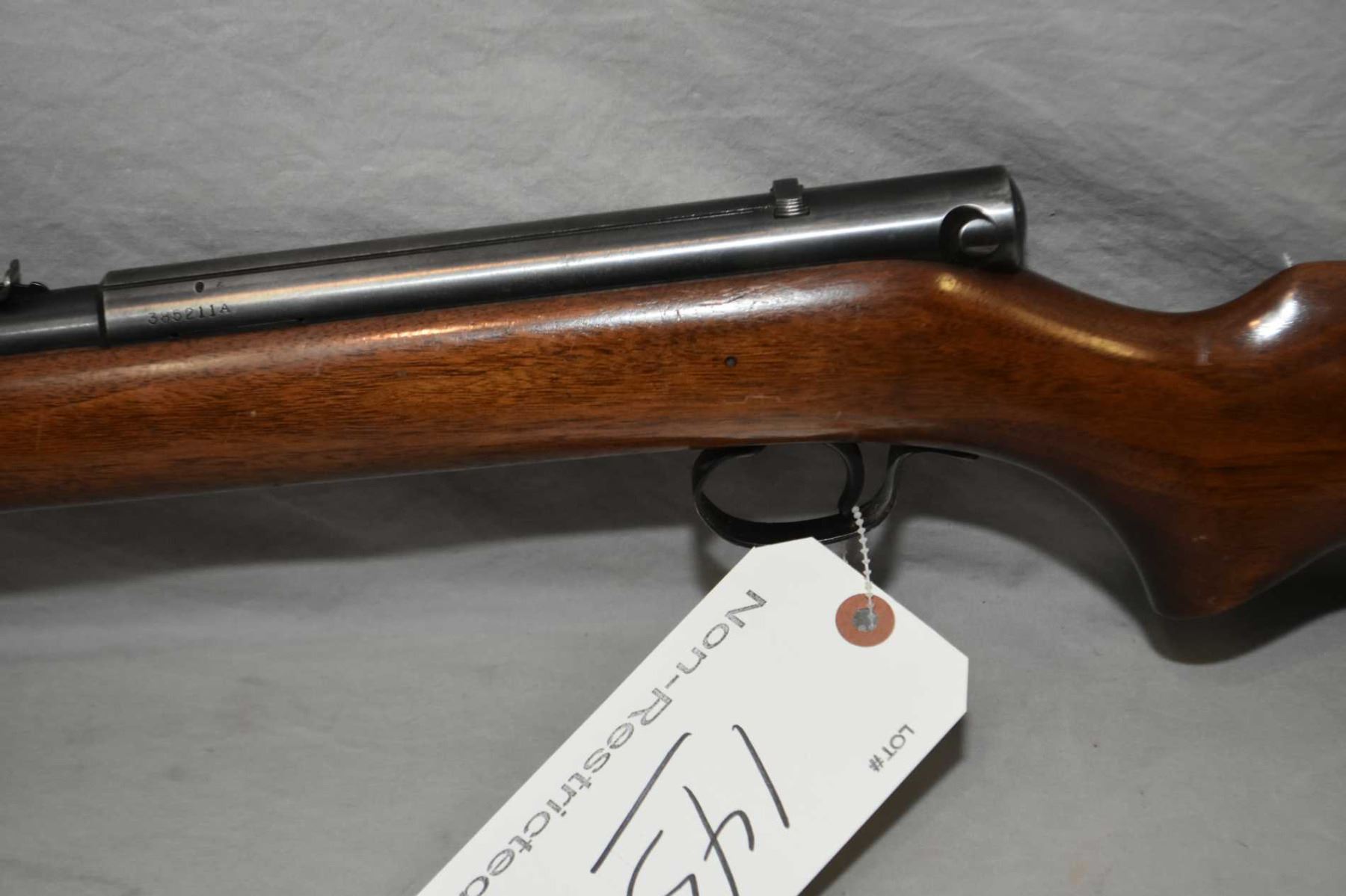 Winchester Model 74 .22 LR Cal Tube Fed Semi Auto Rifle w/ 22" round barrel [ blued finish starting to fade, more in carry areas, good walnut pistol grip stock, checkered metal butt plate, with mag tube, barrel sights, Circa 1954 ] Ser # 385211A