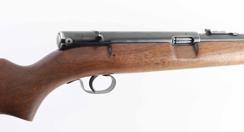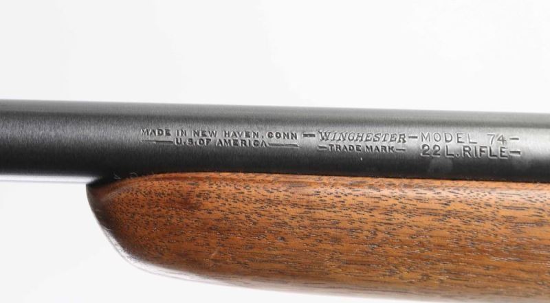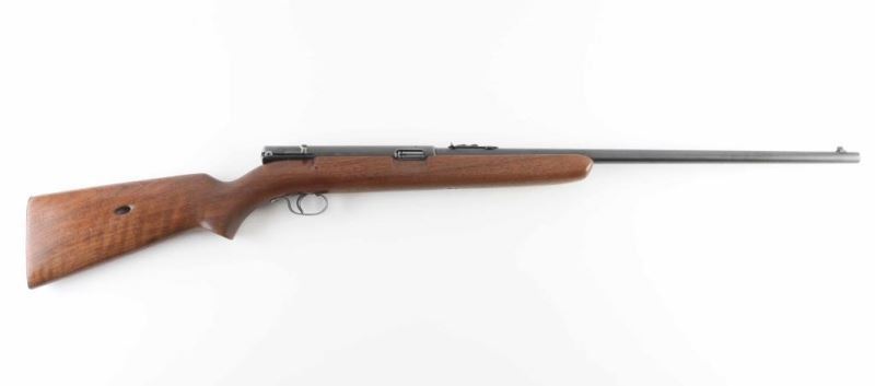 Semiautomatic rimfire rifle manufactured circa 1950. Features blued finish, wood stock, magazine tube in butt, blade front sight, sporting rear sight, 22" barrel, manual safety on top of receiver. Bore is good condition, dirty, might improve with cleaning. Retains 70% blue, thinning in breech area, showing bare metal on edges & corners, some patina on barrel. Stock is good condition with handling marks, some thinning of finish on handguard. Condition is NRA Good *** C&R Firearm ***