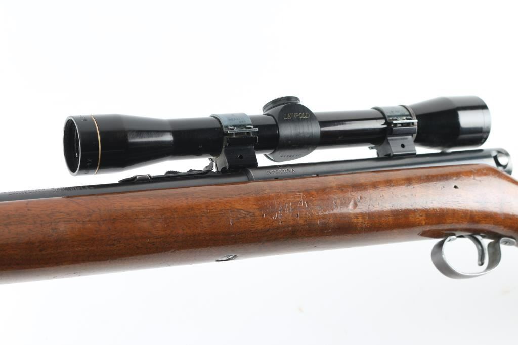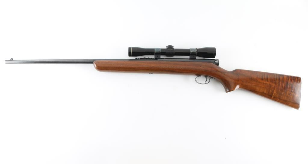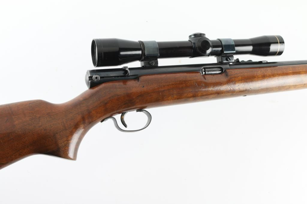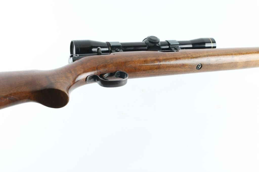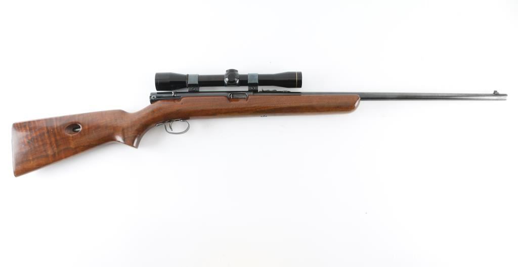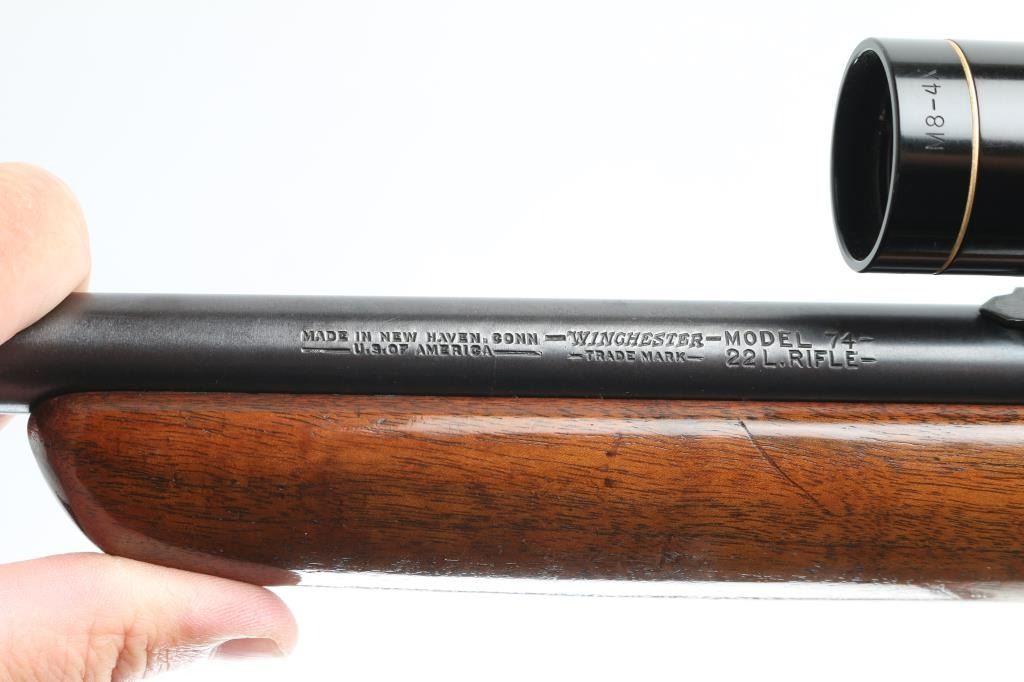 Semiautomatic rimfire rifle manufactured circa 1953. Features blued finish, fancy figured walnut stock with fiddle grain in butt, checkered steel buttplate, magazine tube in butt, blade front & sporting rear sights, 22" barrel, manual safety on top of receiver. Bore is very good condition. Retains 90% finish with edge losses, some fading to brownish color on triggerguard and barrel near muzzle. Stock is very good condition, possibly lightly sanded, coated with varnish. Markings are crisp. Mounts a Leupold M8-4x scope, duplex reticle, in good condition with clear view. Condition is NRA Very Good+ *** C&R Firearm ***