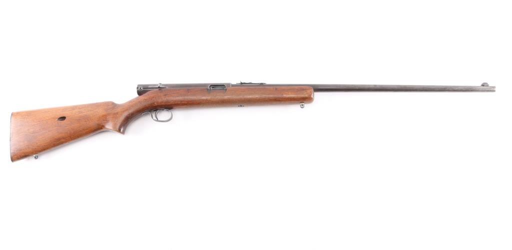 Semiautomatic rimfire rifle manufactured circa 1939. Features blued finish, smooth walnut stock, magazine tube in butt, blade/brass bead front & sporting rear sights, 24" barrel, manual safety on top of receiver, steel buttplate, sling swivel studs. Bore is very good bright condition. Finish is about 20%, turning a brown/gray patina. Wood is very good condition, minor scratches.