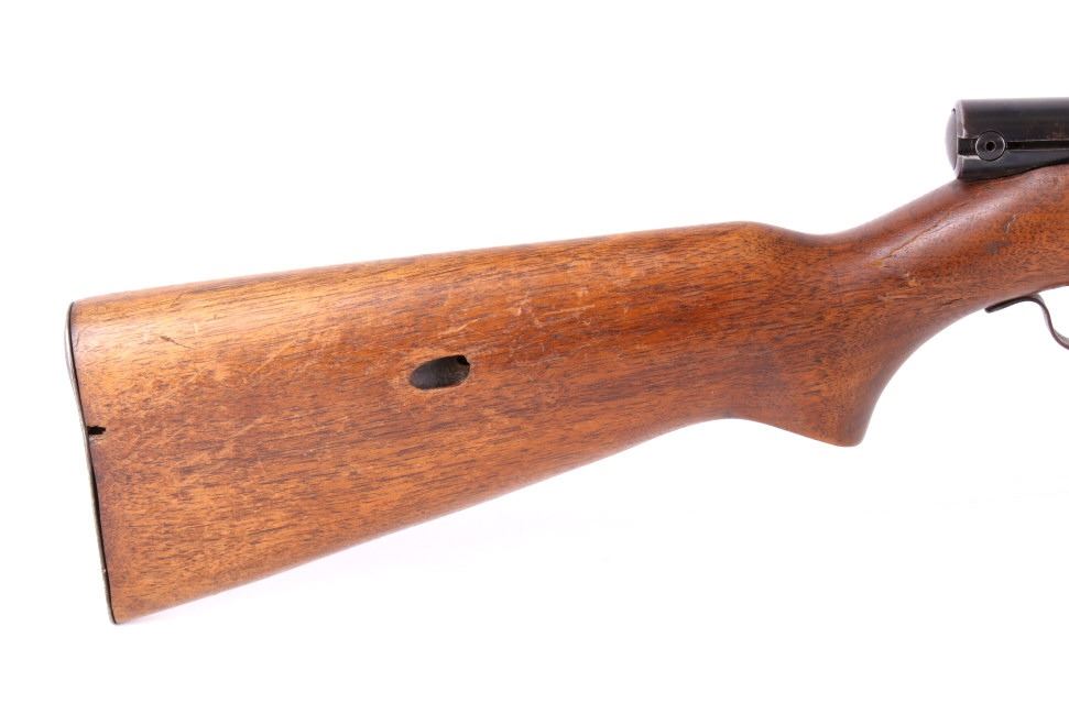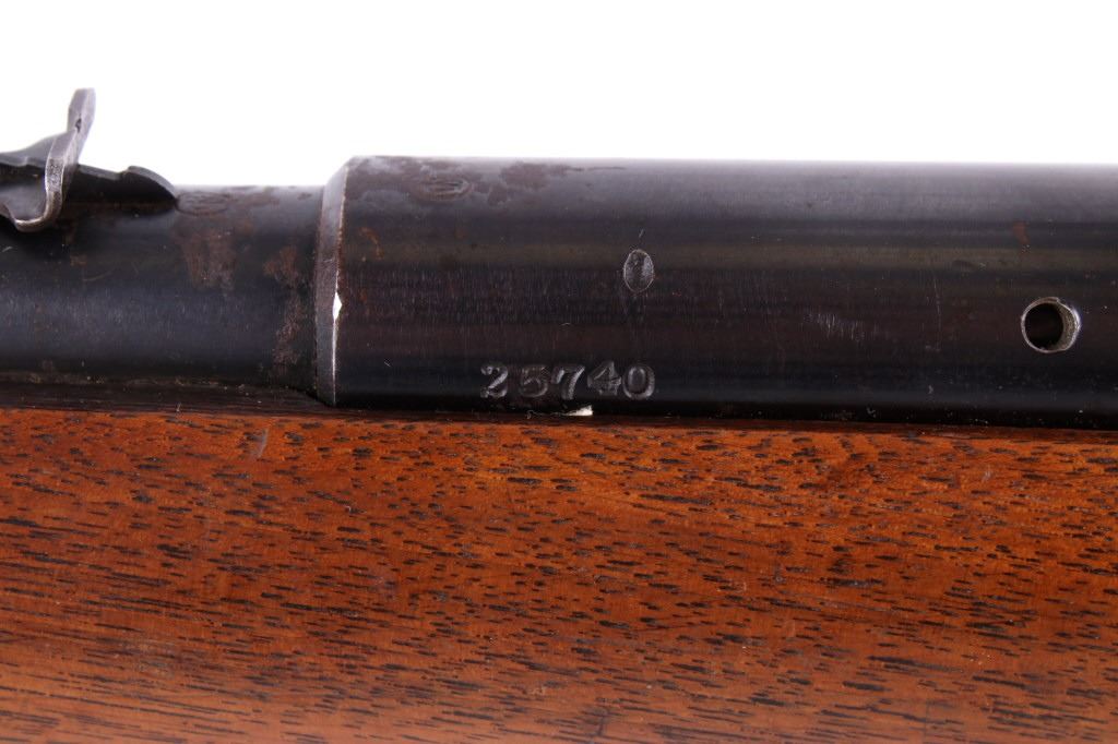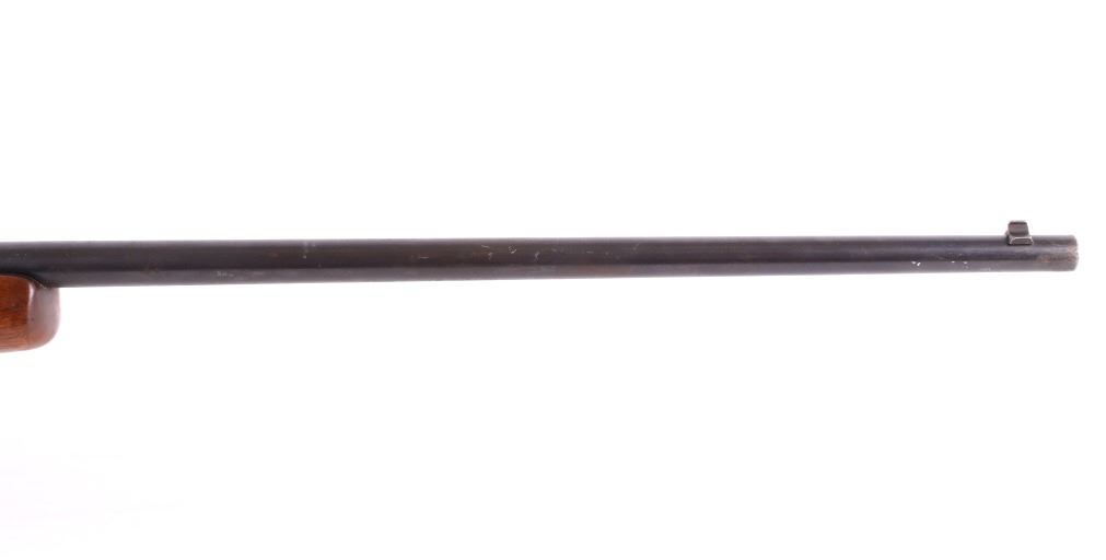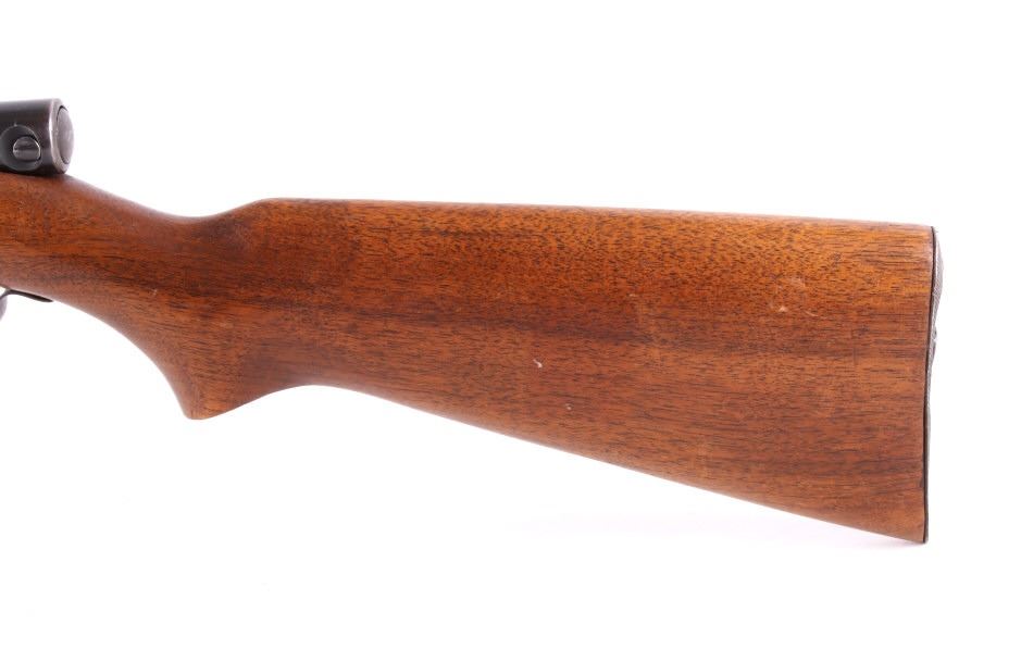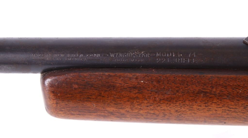 This is a Winchester Model 74 semi-automatic rifle chambered in the .22 long caliber. The rifle has a blue'd steel round 24" barrel and receiver with a solid walnut hardwood stock and a butt stock fed magazine. The left side of the barrel is marked "Winchester Repeating Arms Co. New Haven, Conn. / Model 74 .22 L.Rifle". The Winchester rifle is in fair mechanical condition however the handle on the bolt assembly is broken. It measures 43.75" long overall. This rifle was manufactured in 1939. Serial number is 25740. This firearm requires a Curio & Relic FFL, an FFL Transfer or a NICS Background Check.