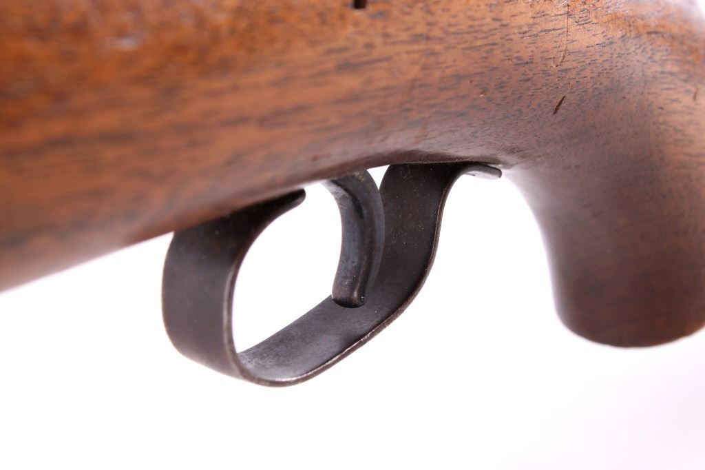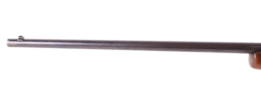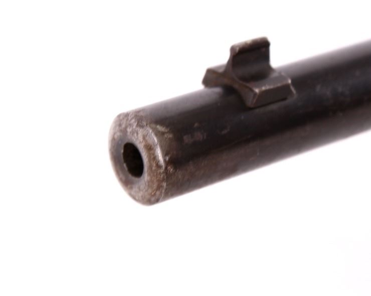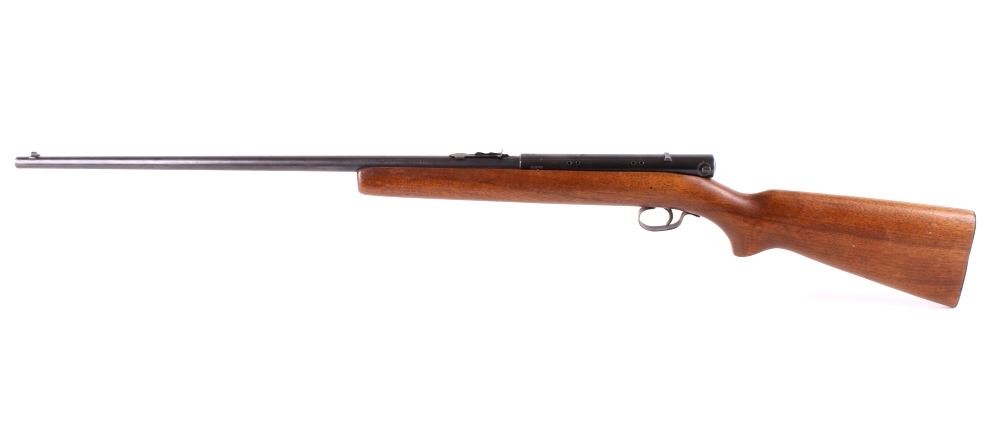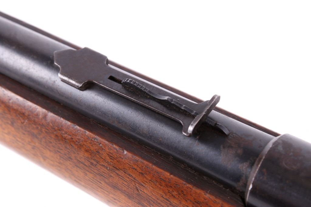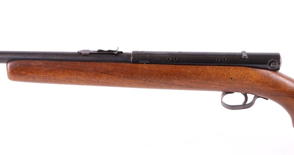 This is a Winchester Model 74 semi-automatic rifle chambered in the .22 long caliber. The rifle has a blue'd steel round 24" barrel and receiver with a solid walnut hardwood stock and a butt stock fed magazine. The left side of the barrel is marked "Winchester Repeating Arms Co. New Haven, Conn. / Model 74 .22 L.Rifle". The Winchester rifle is in fair mechanical condition however the handle on the bolt assembly is broken. It measures 43.75" long overall. This rifle was manufactured in 1939. Serial number is 25740. This firearm requires a Curio & Relic FFL, an FFL Transfer or a NICS Background Check.