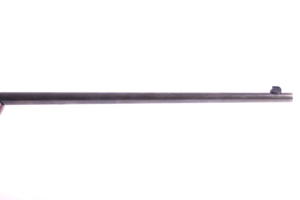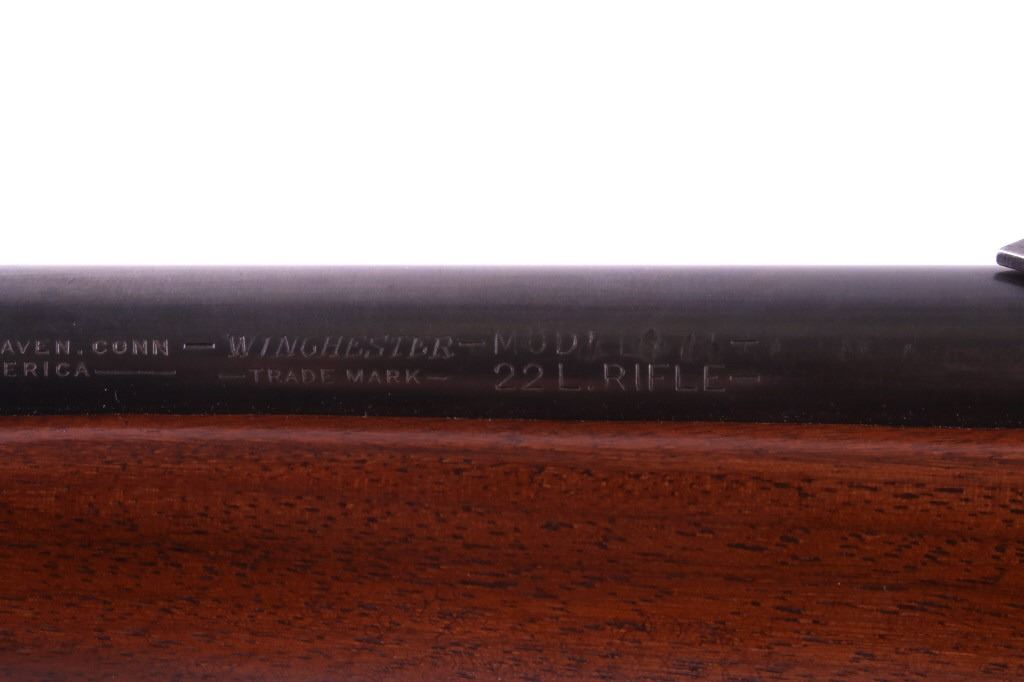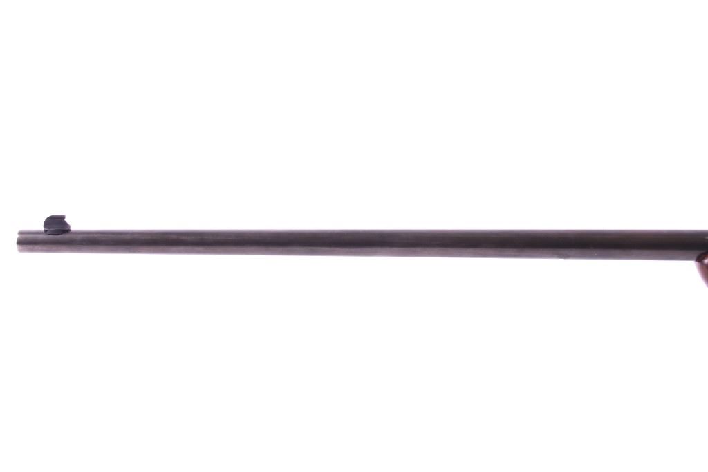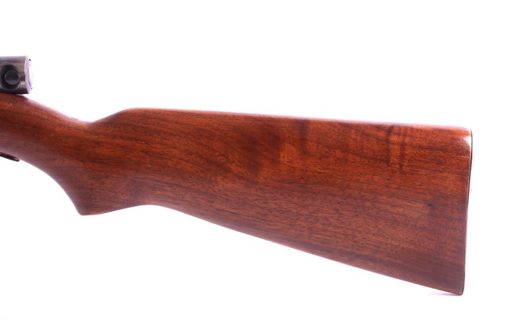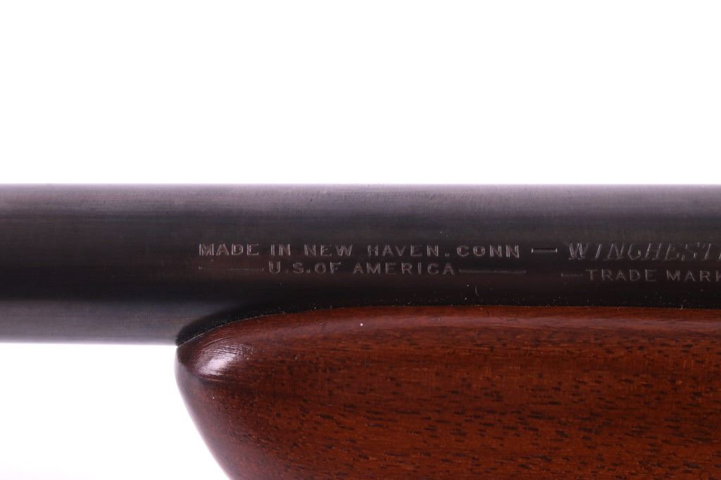 This is a Winchester Model 74 semi-automatic rifle chambered in the .22 short caliber. The rifle has a blued steel round 23.5" barrel and receiver with a solid walnut hardwood stock and a butt stock fed magazine. The left side of the barrel is marked "Winchester Repeating Arms Co. New Haven, Conn. / Model 74 .22 Short". The Winchester rifle is in good condition. It measures 43.75" long overall. Serial number is 100741. This firearm requires a Curio & Relic FFL, an FFL Transfer or a NICS Background Check.