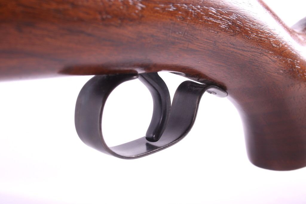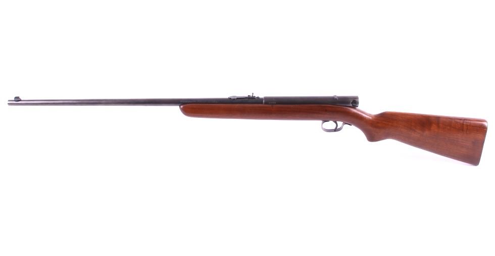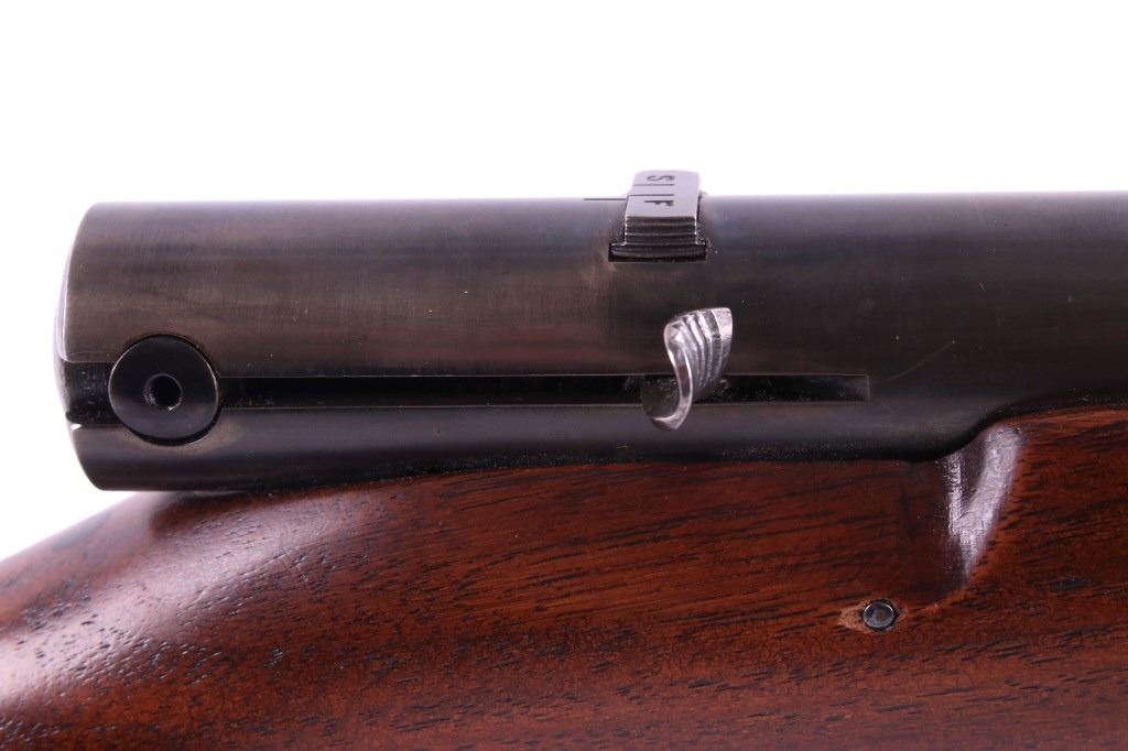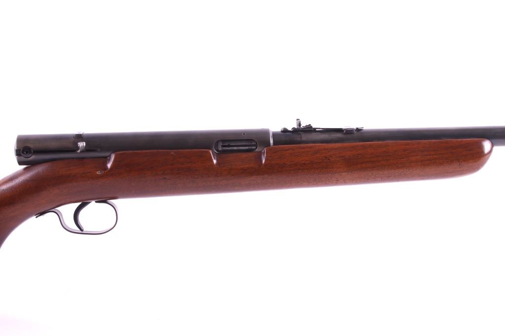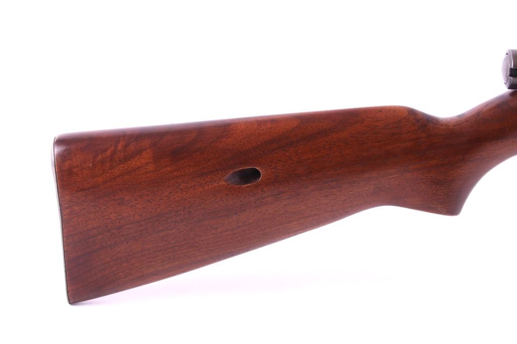 This is a Winchester Model 74 semi-automatic rifle chambered in the .22 short caliber. The rifle has a blued steel round 23.5" barrel and receiver with a solid walnut hardwood stock and a butt stock fed magazine. The left side of the barrel is marked "Winchester Repeating Arms Co. New Haven, Conn. / Model 74 .22 Short". The Winchester rifle is in good condition. It measures 43.75" long overall. Serial number is 100741. This firearm requires a Curio & Relic FFL, an FFL Transfer or a NICS Background Check.