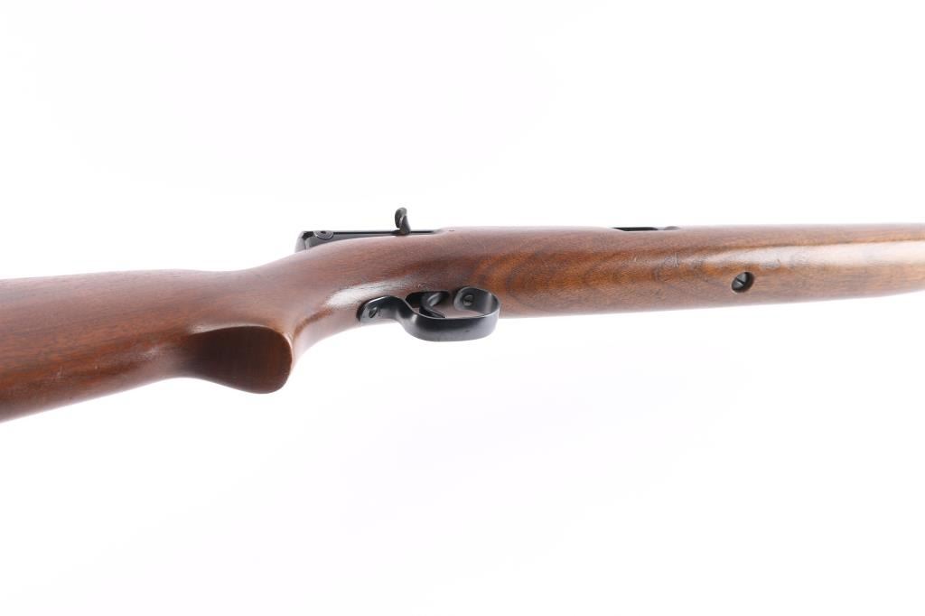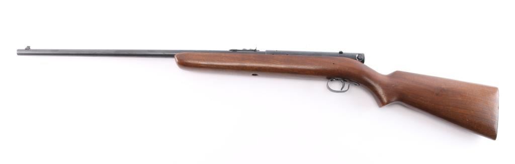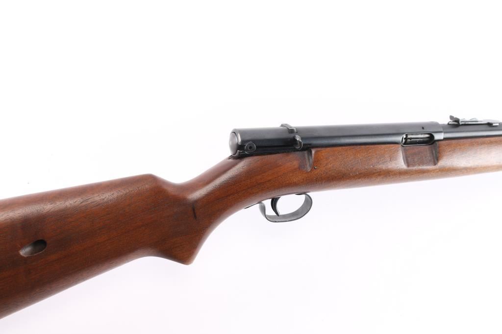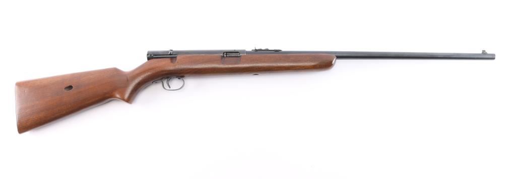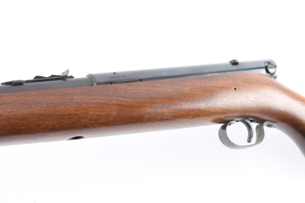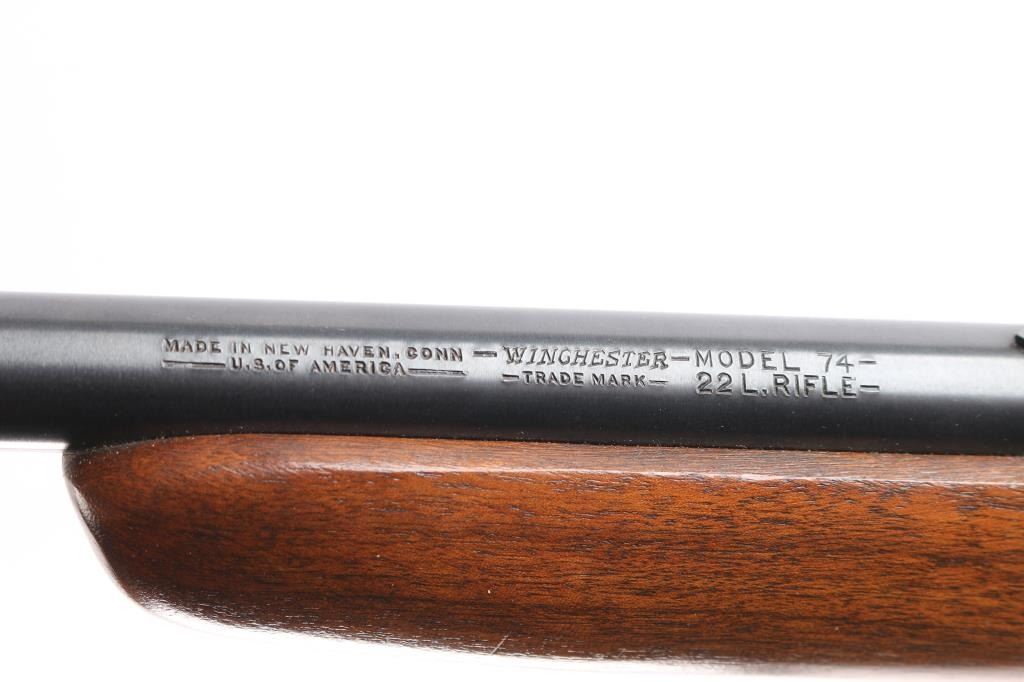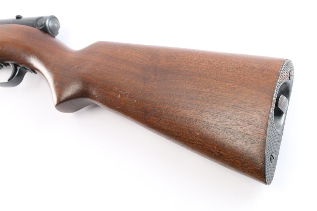 Vintage semiautomatic rimfire rifle. Features 22" barrel, sporting sights in dovetails, manual safety on top of receiver, tube magazine in butt, smooth walnut stock with checkered steel buttplate. Bore is excellent. Overall appears almost like new, with 95% dark blued finish showing few blemishes and small areas of slight discoloration. Markings are crisp with sharp edges. Stock is excellent condition with a few small dings, has a smooth even varnish finish.