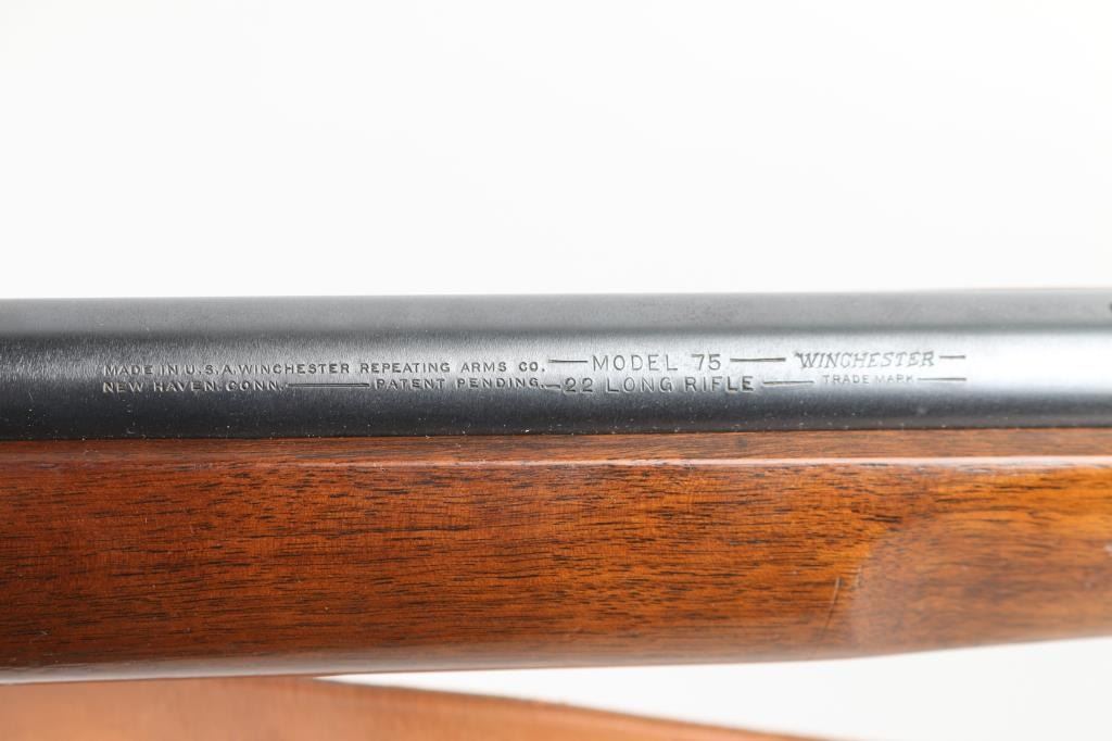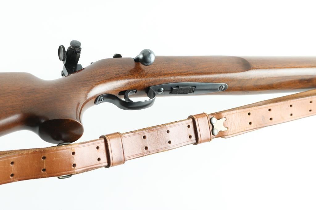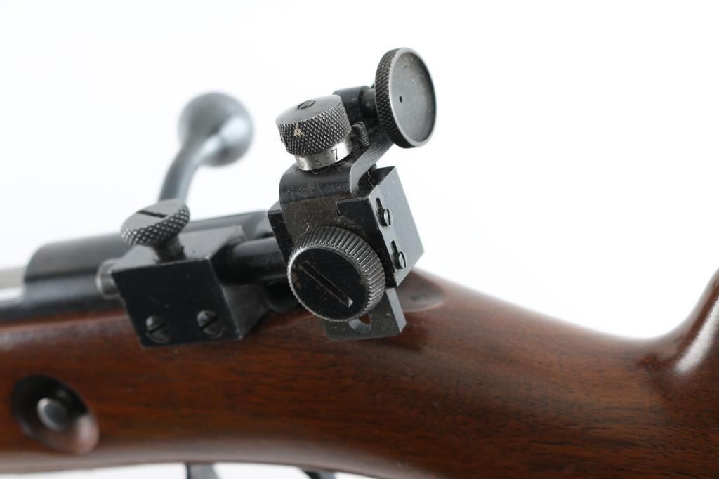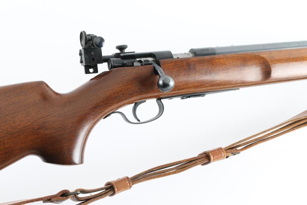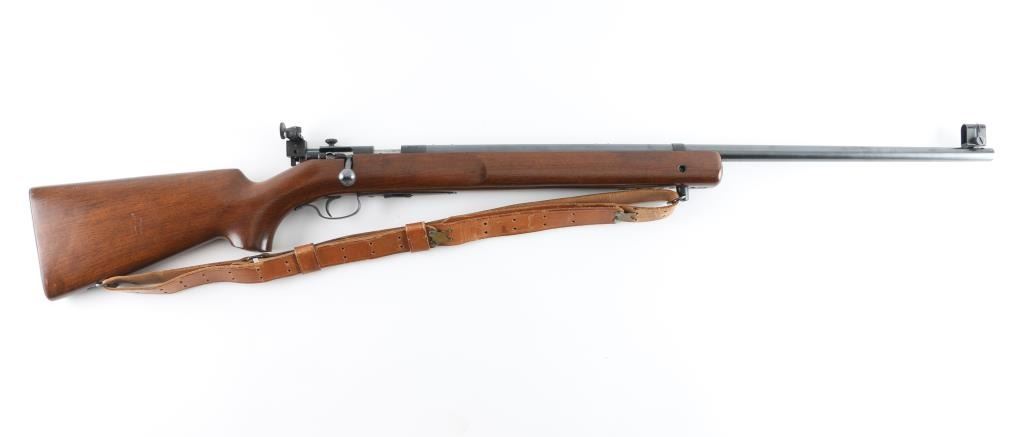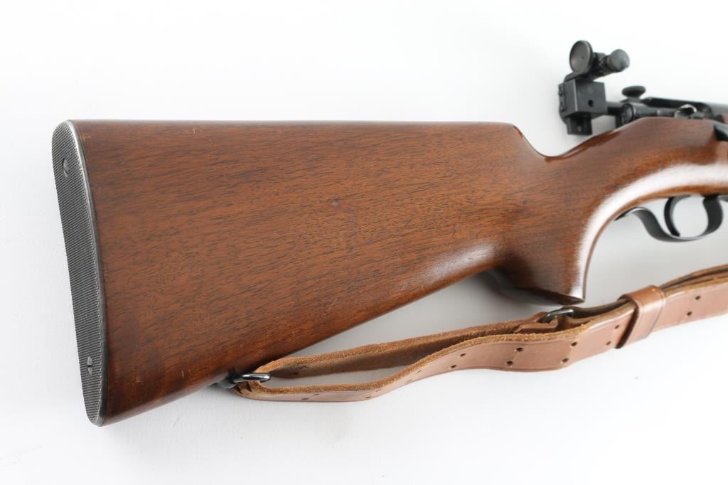 Bolt action rimfire target rifle manufactured circa 1938 (first year of production). Features blued finish, smooth wood stock with semi beavertail forend & curved grip, checkered steel buttplate, 28" barrel, hooded globe front sight, receiver mounted rear micrometer peep sight, detachable 5 rd magazine with release button in left side of stock, manual safety, sling swivels, multiple positions for mounting forward swivel to act as a hand stop. Bore is very good condition. Retains 90% reblued finish, few sanding marks under finish, slight edge losses, few spots of patina. Stock is very good condition with dents & scratches. Markings are crisp, even depth. Includes (1) magazine & fair condition leather target sling. Condition is NRA Very Good++ (reblued) *** C&R Firearm ***
