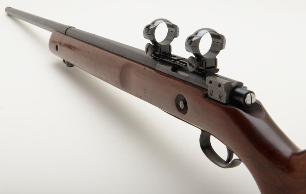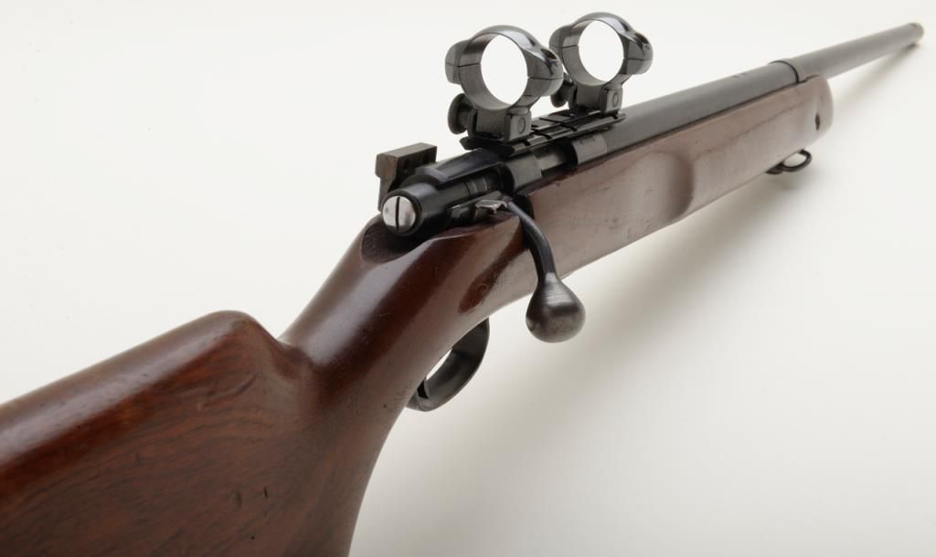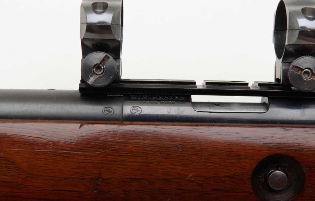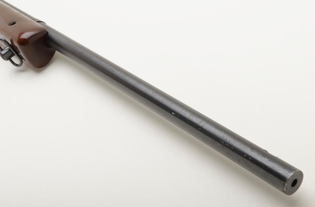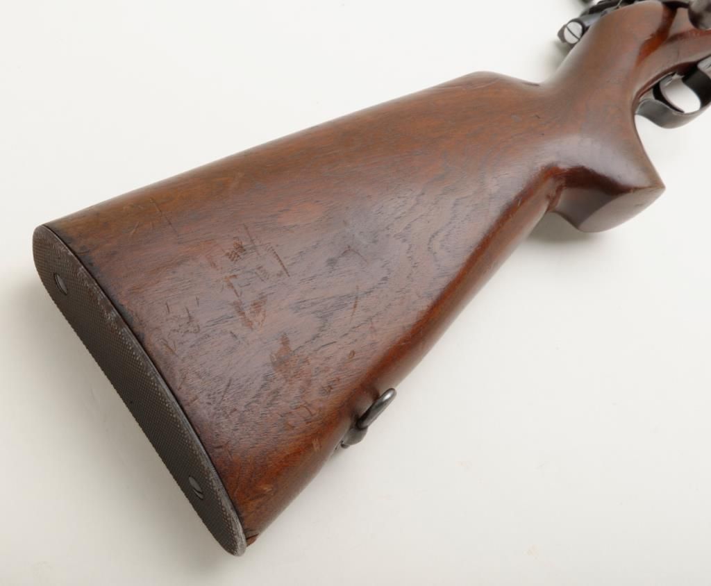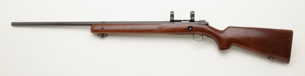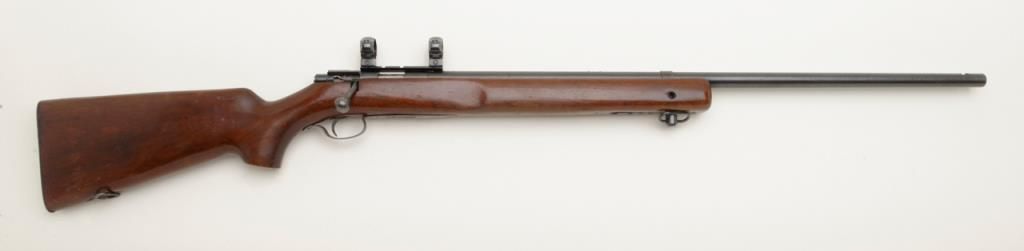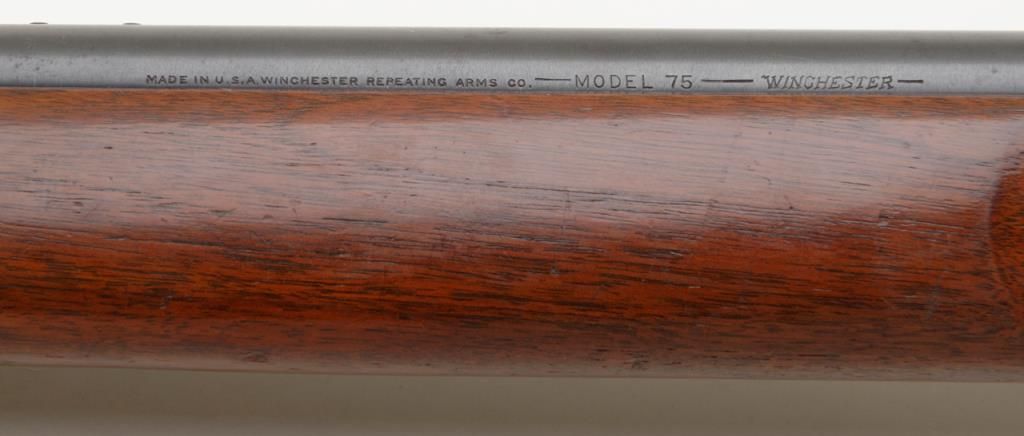 Winchester Model 75 in .22 caliber target rifle in very good plus original condition, serial number 45791. The rifle shows 75% to 85% original blue finish and an extra set of tap holes in the barrel which are plugged with screws for target type scope. The action is mounted with a scope mount and rings ready to accept a scope. The front sight has been removed. The stock is very good with some minor scratches, mars and etc. There is a mount for iron sight in the left rear the frame which shows considerable original case color and there is no sight for this mount included. The action is good and the bore is fine. The clip is missing. Est.: $200-$400