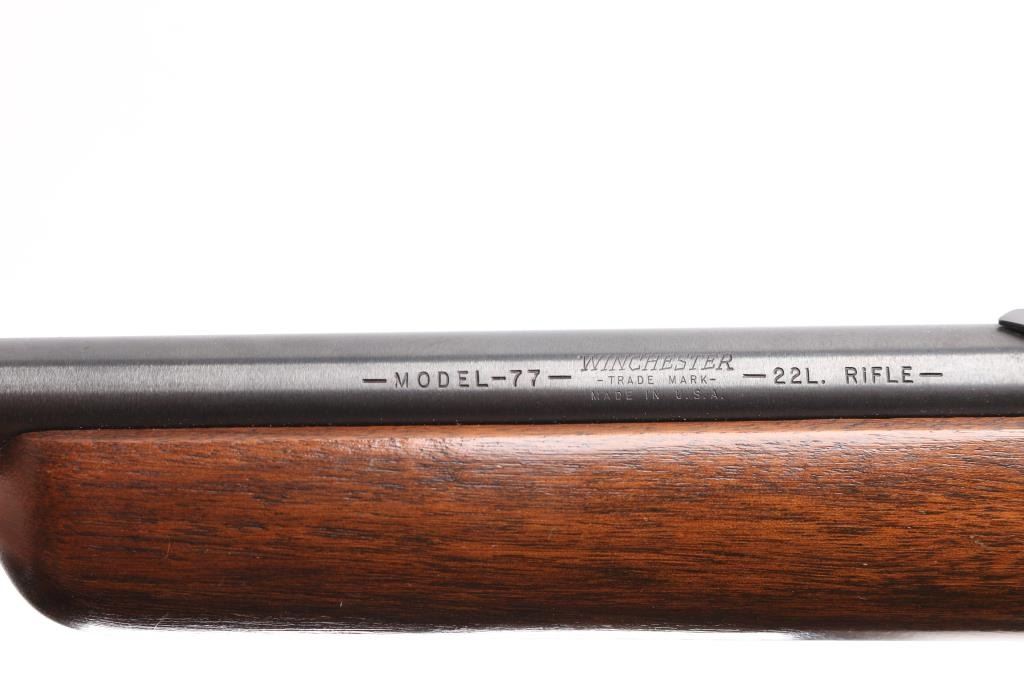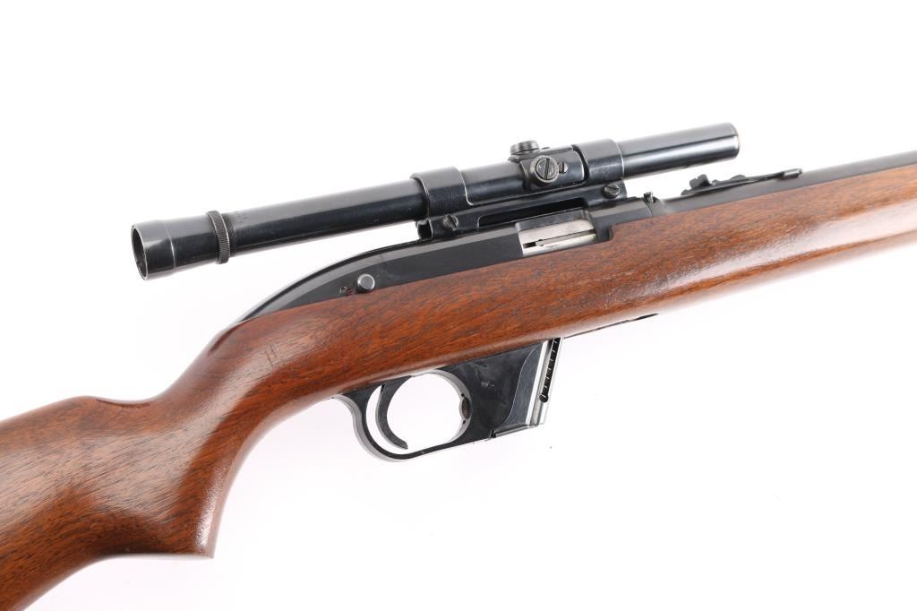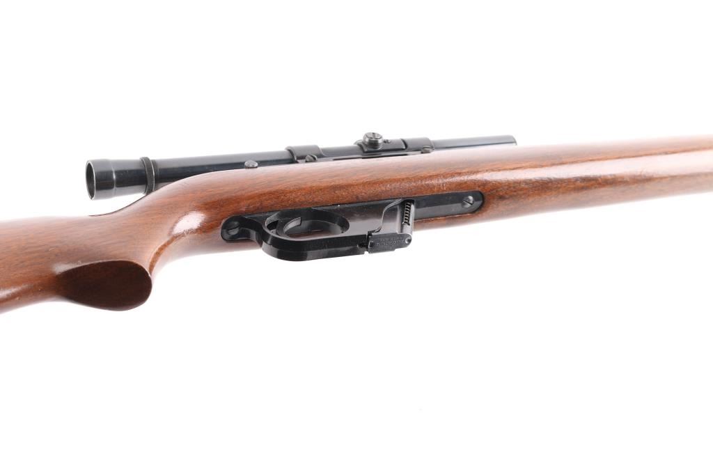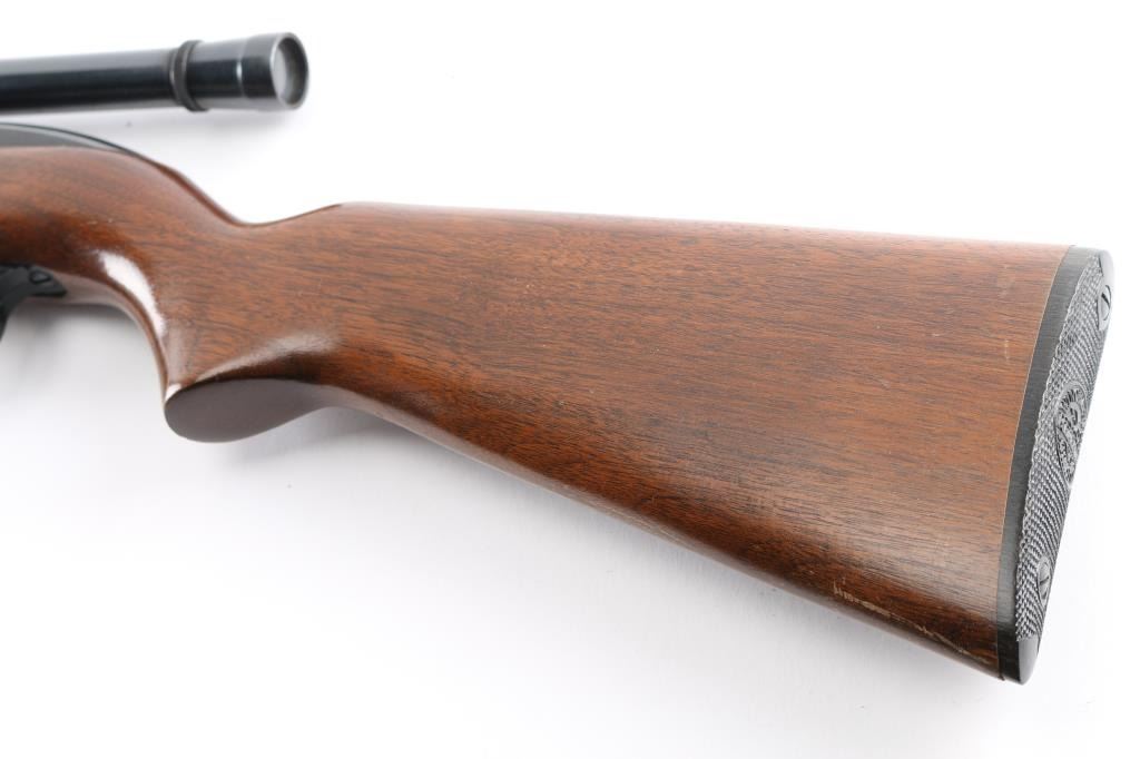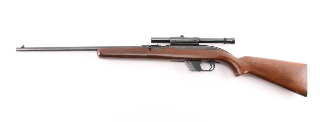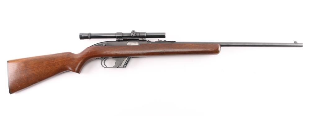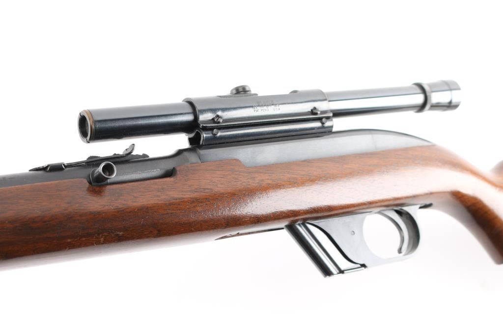 Vintage magazine fed semi-automatic rimfire rifle chambered in .22 Long Rifle, manufactured circa 1955-1962. Features a blued finish, 22" barrel, dovetailed bead top blade front sight, elevation adjustable rear sporting sight, smooth trigger, polymer trigger guard and mag well with safety inside front of guard, manual safety on the right side of the receiver, steel receiver with integral cuts for scope rings, left side charging handle, manual bolt hold open, and smooth walnut semi-pistol grip shoulder stock with factory buttplate. Mounts a Weaver B4 scope with fine crosshairs. Bore is pristine. Retains 95% finish with some patina and scratches under barrel near muzzle. Scope is very good clean condition, clear view. Wood stock is very good with scratches. Includes one magazine.