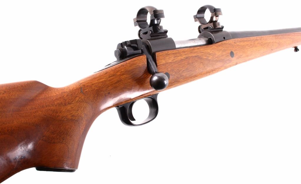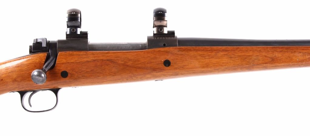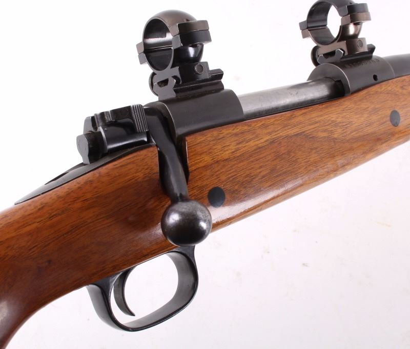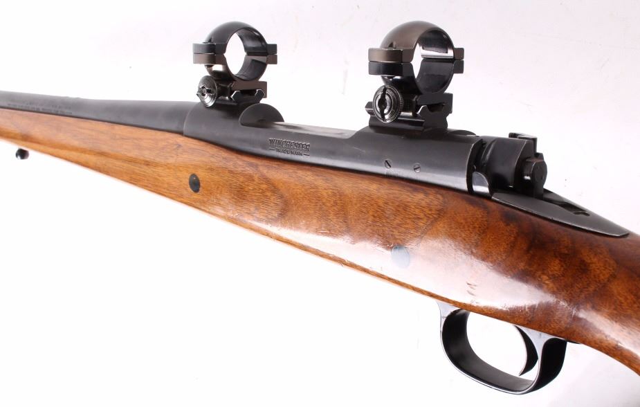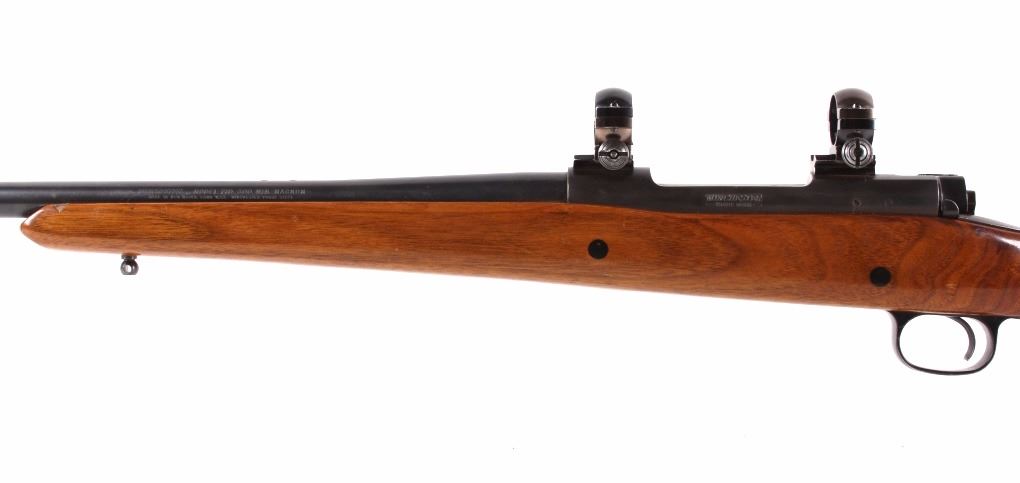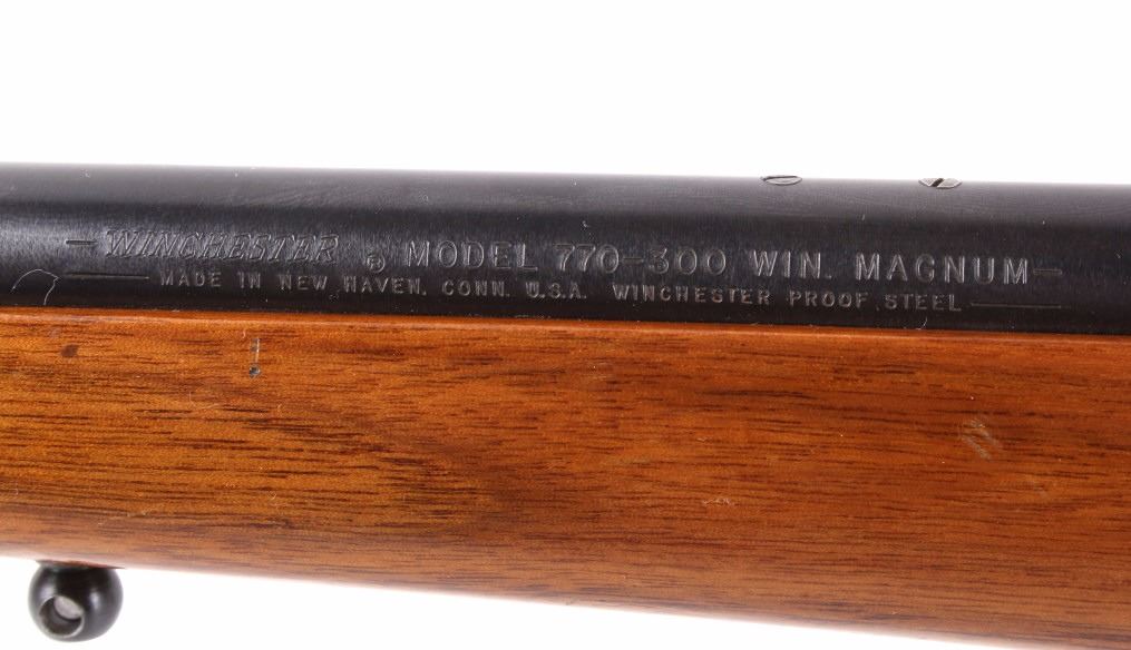Available for sale is a Winchester model 770 .300 Winchester Magnum bolt action rifle. The rifle features a Walnut monte carlo stock, blued steel finish, 24" barrel, and scope rings. The Winchester 770 was produced as a economy version of the model 70, it lacked a hinged floorplate or fore-end tip to keep cost down. In terms of numbers this is a rare Winchester for they were only produced from 1969 to 1971. The rifle is in good condition, with little wear to the bluing, but does have handling wear on the stock. It functions like new. It is marked on the barrel " Winchester Model 770 - 300 Win. Magnum Made in New Haven. Conn. U.S.A Winchester proof steel." and on the receiver Winchester trade mark. Modern rifle. FFL transfer or NICS background check required. Serial number is G1005963. Overall length is 44 1/2" L