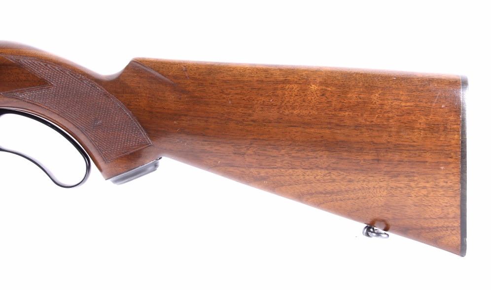 This lot features a exceptional example of a Winchester Model 88 .308 Win lever action rifle with scope rings. The rifle features a blued steel finish, 21 1/2" round barrel, one piece walnut stock, 4 round magazine, and iron sights. Introduced in 1955 for the then new .308 Winchester cartridge, the hammerless Winchester Model 88 was entirely different and technically more advanced than any previous Winchester lever action rifle. In fact, its combination of modern features has never been equaled by any other lever action rifle. This rifle is in good condition, the bluing is in very good condition with little to no wear. The stock is in good condition with some handling marks. This rifle was made in 1961. Curio & Relics rifle. FFL transfer or NICS background check required. Serial number is 120445. Overall length is 42 1/2"
