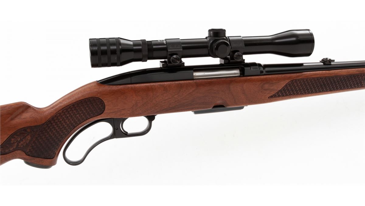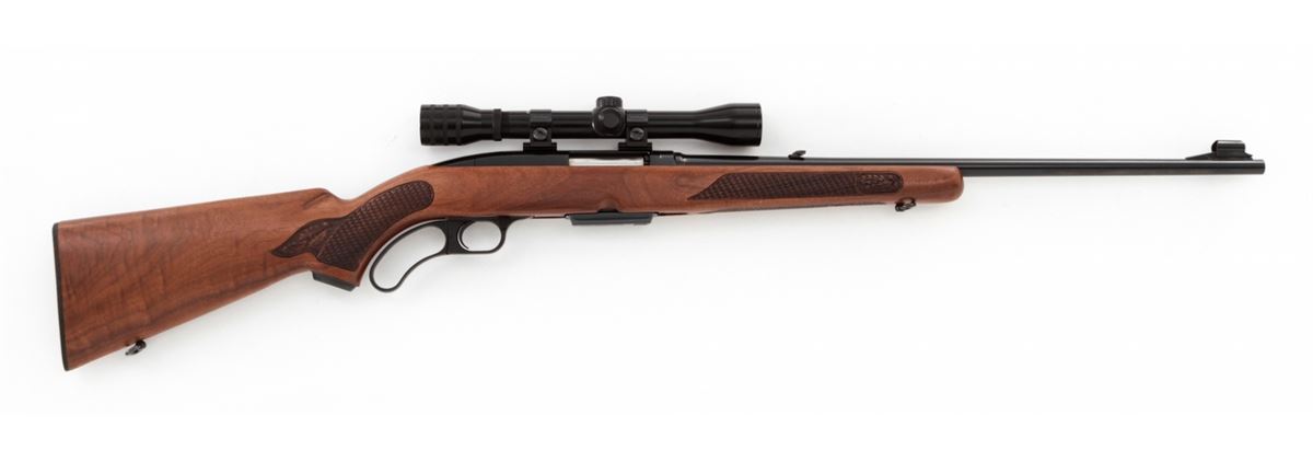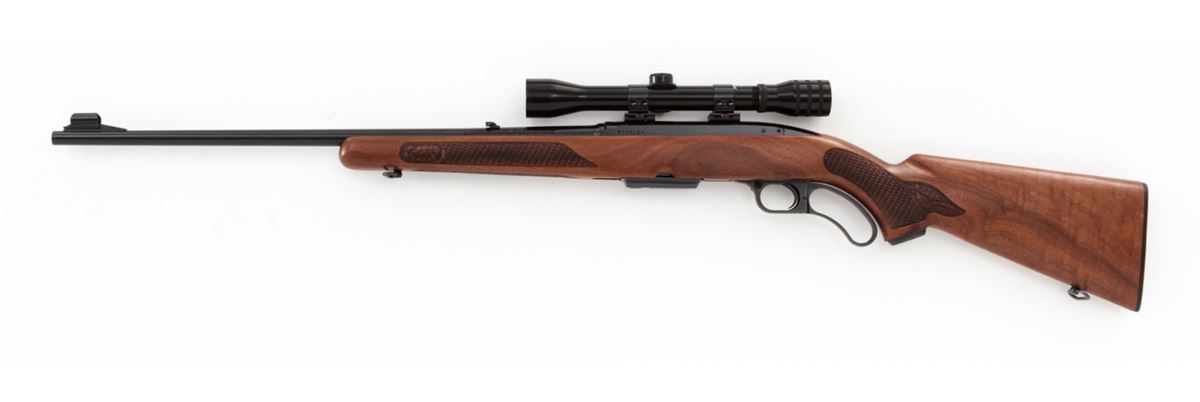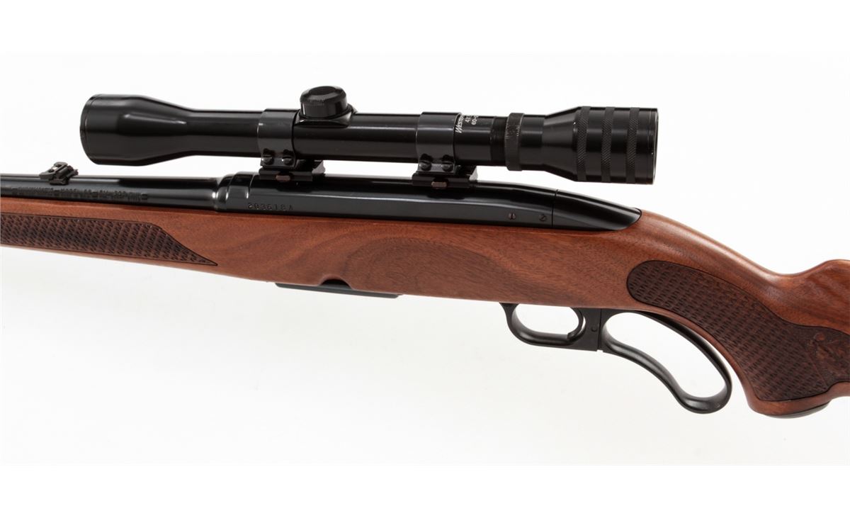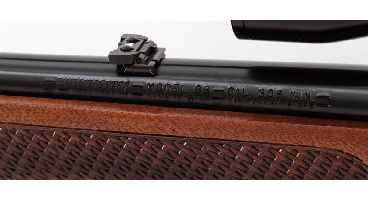 Winchester Model 88 Lever Action Rifle, #203618, .308 cal., 22'' barrel, blue finish, pressed checkered walnut stock. Topped with Westernfield 4x33 scope on Weaver rings and mounts. Mfg'd 1967. Condition is excellent showing little use. Est.: $500-$700. (Modern)