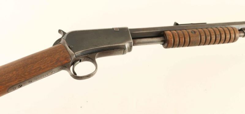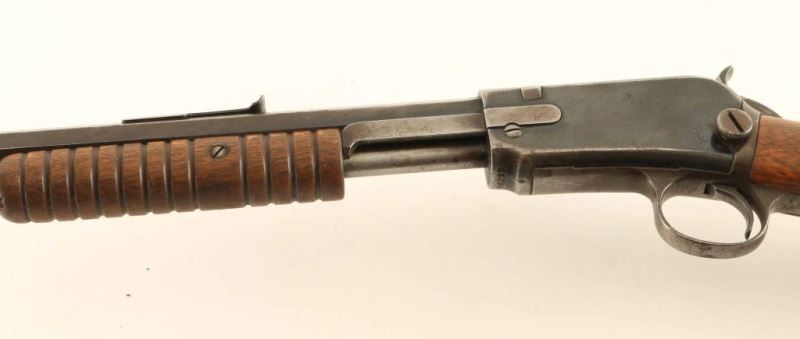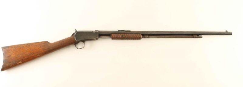 Vintage tube fed slide action repeating rifle chambered in 22LR. Features a blued finish, 24" octagon barrel, dovetailed blade front sight with bead top, adjustable rear sporting sight, 3/4 length tube magazine, take down receiver, smooth trigger, knurled hammer spur, grooved walnut slide handle, and straight grip shoulder stock with crescent metal buttplate. Rifle exhibits approximately 50% of its blued refinish showing heavy wear with some scattered surface rust. Action is sound, bore is excellent and the wood stocks are good to very good with finish loss. NRA Good ***Modern Firearm***