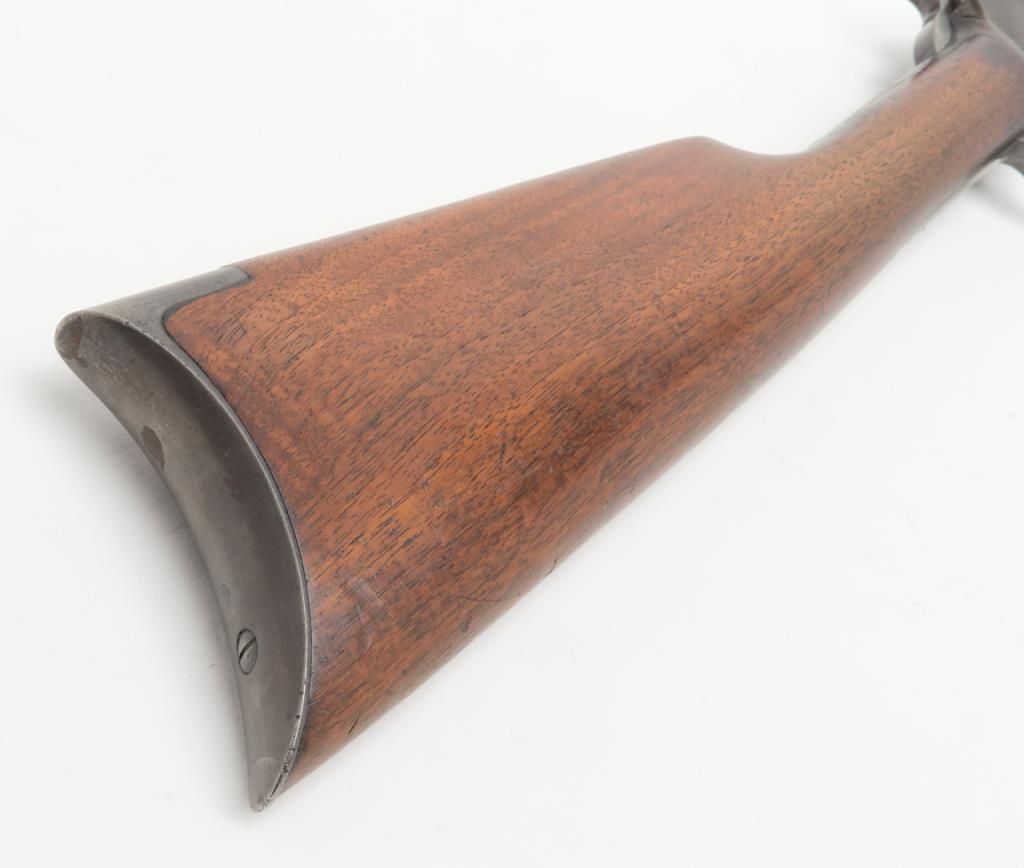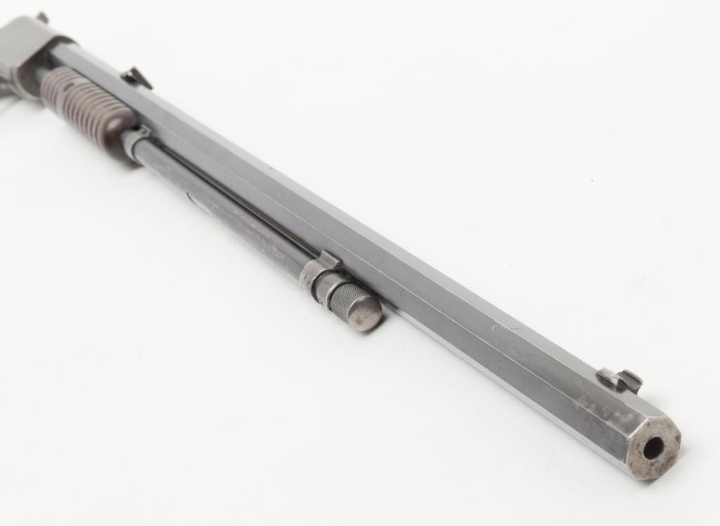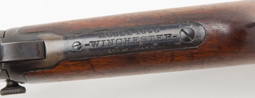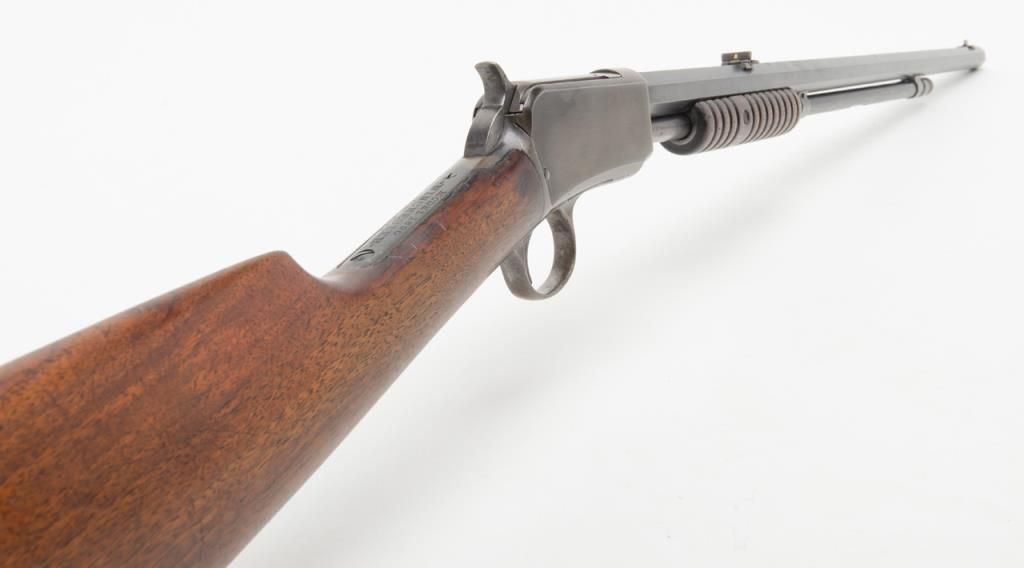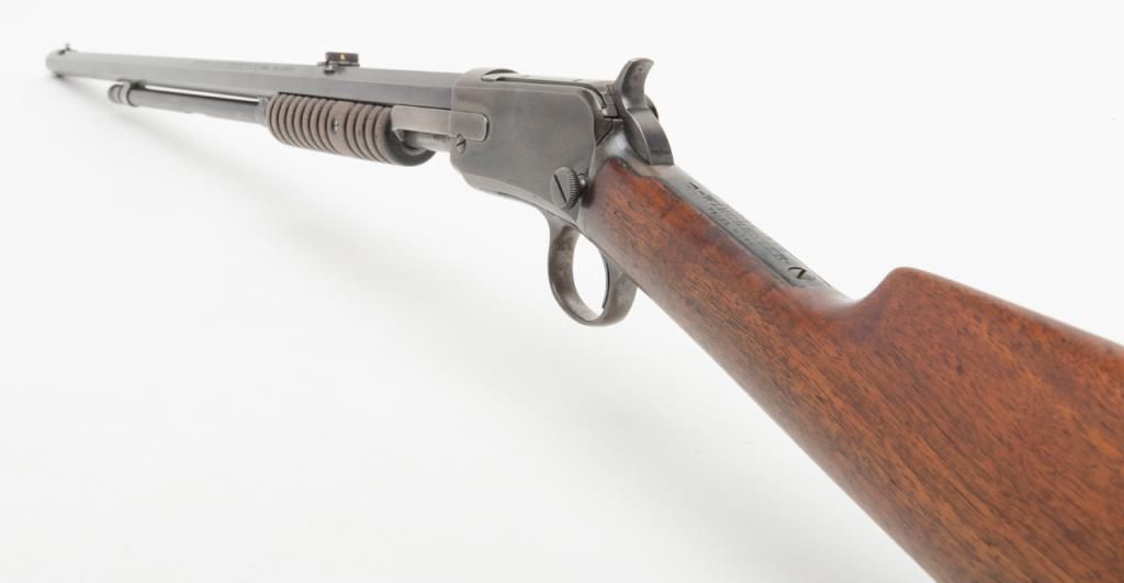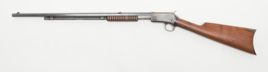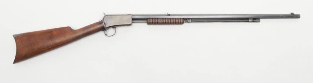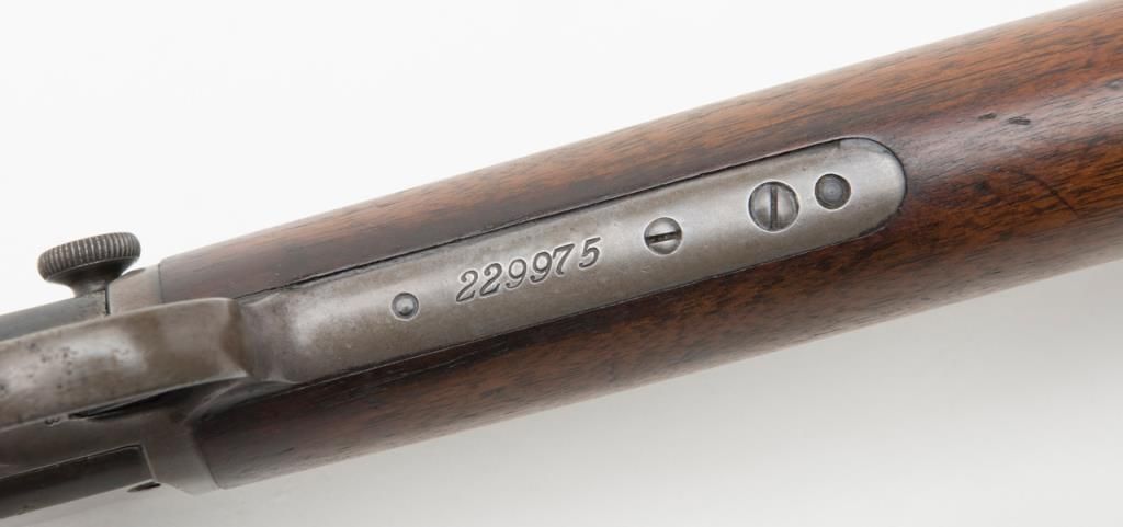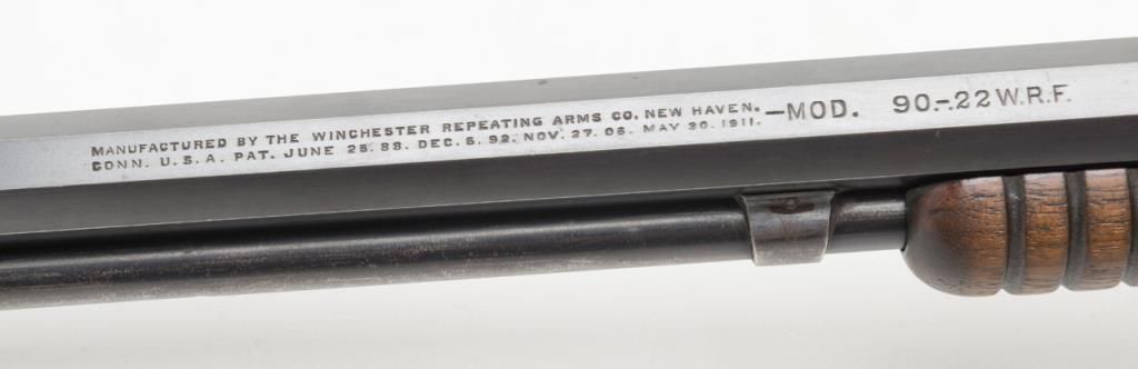 Winchester Model 90 pump action takedown rifle, .22 WRF caliber, Serial #229975. The rifle is in overall very good to nearly fine condition with a 24” octagonal barrel. The barrel retains the majority of its blued finish with some flaking ofblue on the magazine tube. The action shows a significant amount of muted blue with the trigger guard having gone to a grey patina. The smooth wood stocks are in overall very good condition showing small mars consistent with use. The stock ends with a metal, crescent butt plate. The bore is very good, the action crisp and markings sharp. (C+R). Est.: $600-$1,200