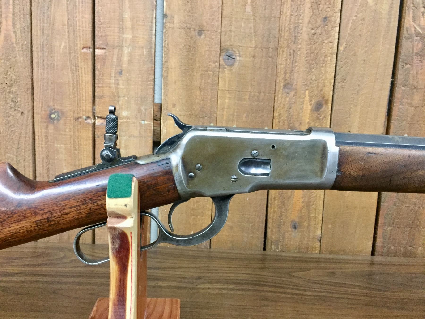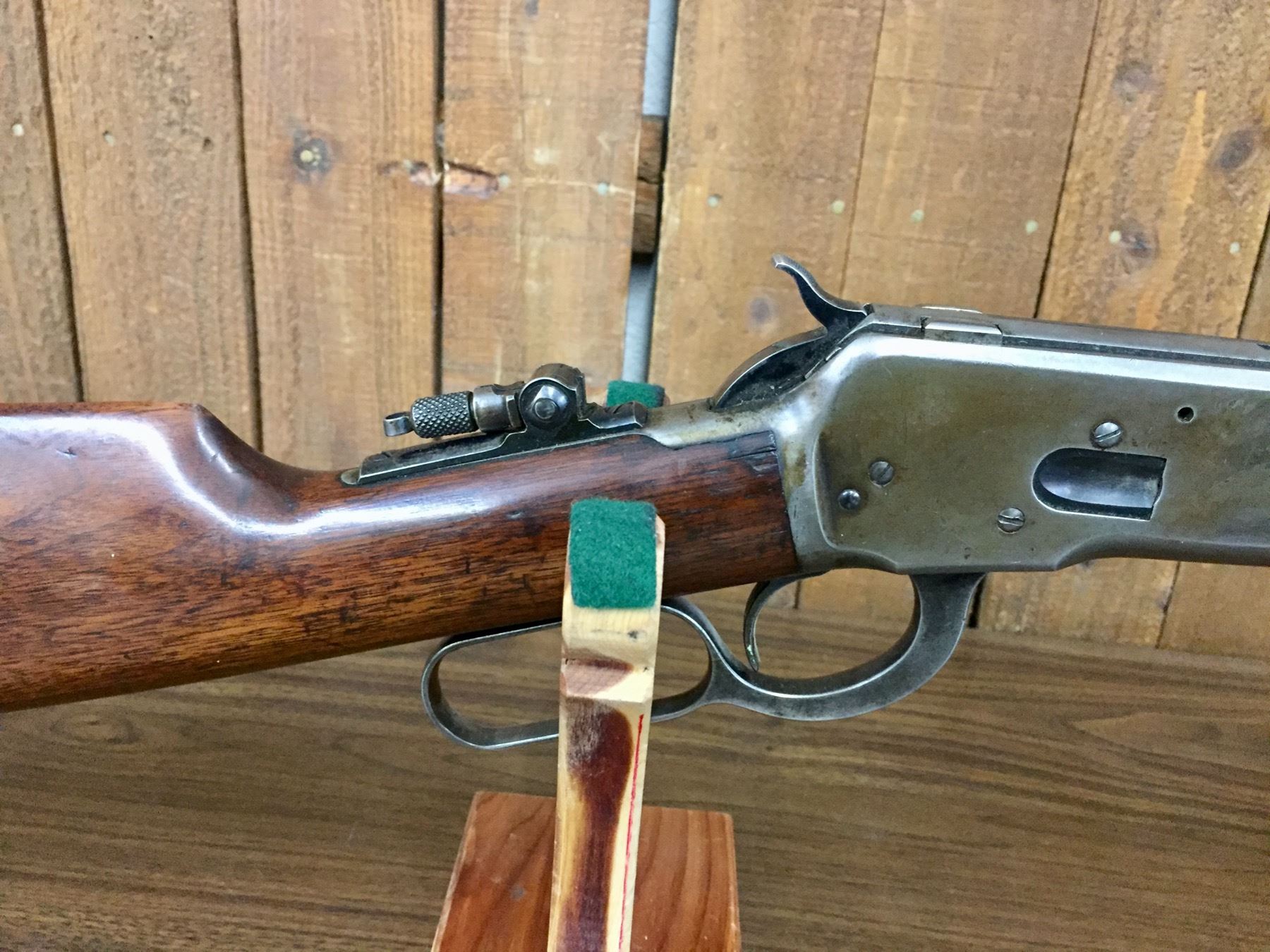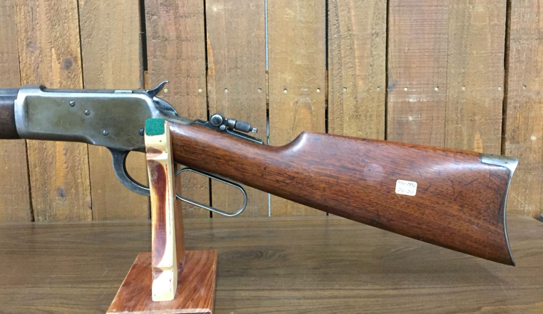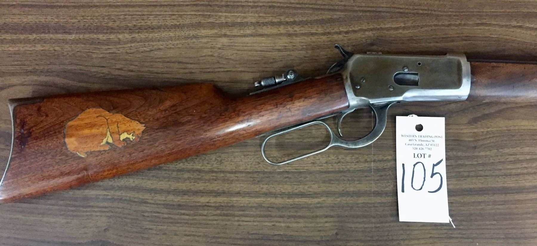 Description: Presented for sale in this lot is a Winchester, Model 92 in .25-20 WCF caliber. This lever action rifle has a Lyman sight on the tang and a front peep sight. The original walnut stock has been inlaid with a cat on the left side and the forearm has inlaid initials. It has a 24†octagon barrel and a full magazine. Maker: Winchester. Approx. Age: 1923. Serial No. 920822. Size: Barrel measures 24†with an overall length of 47-1/2â€. Condition: Pretty good for its age, normal wear and some dings expected. Please look closely at the pictures - they are an important part of our description. Shipping: There will be a $15 handling / packaging fee for shipping this lot. The actual cost of postage will be added on top of that. *****This firearm REQUIRES an FFL Transfer*****