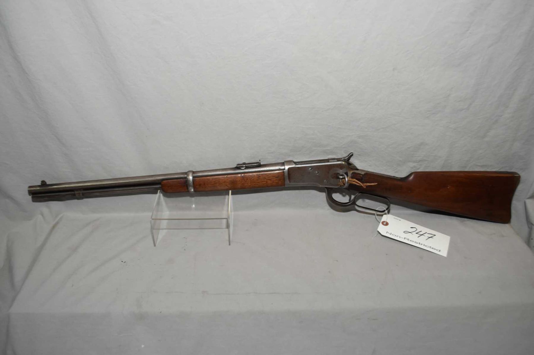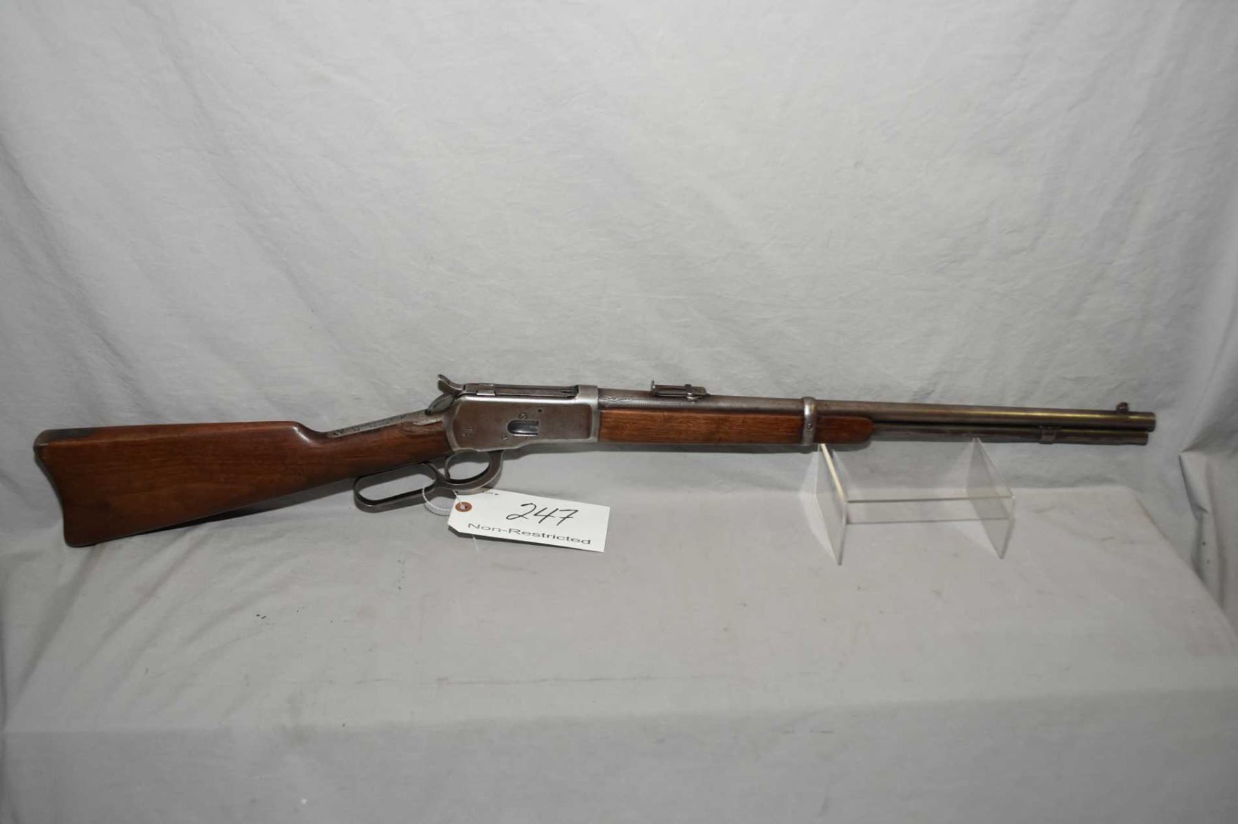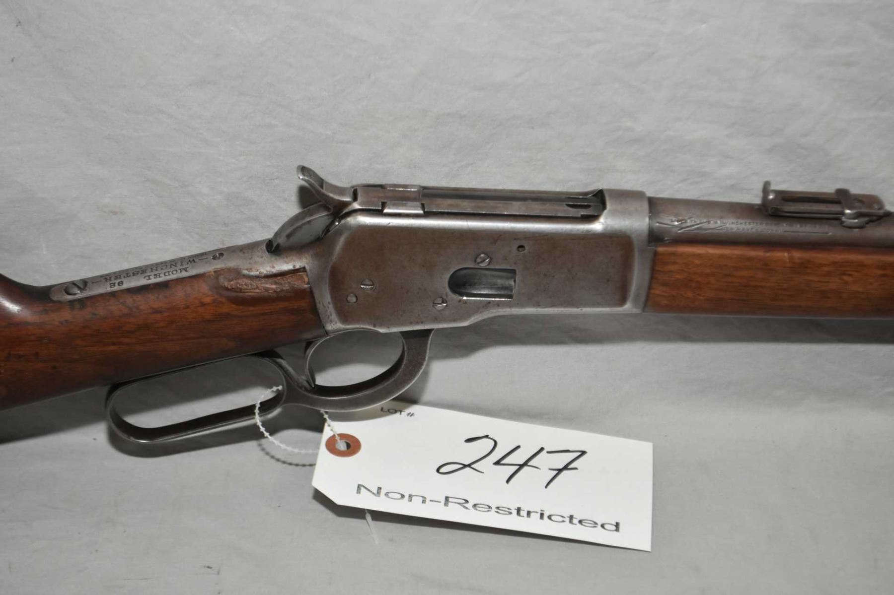 Winchester Model 92 .25 - 20 WCF Cal Lever Action Saddle Ring Carbine w/ 20 " round barrel full mag [ fading blue finish turning brown with some marks on barrel and receiver, dinged mag tube, Number 6 carved in forewood, also few marks to wood, cracked and partially repaired by upper tang, metal carbine butt plate, Circa 1926 ] Ser # 959163