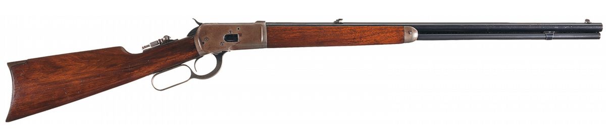Manufactured in 1924. Blade front sight and adjustable folding leaf rear sight (replacement) on a barrel marked with the two line address on the right side and Winchester legend on the left side. The upper tang is marked with the three line Winchester Model 92 trade mark and has a peep sight. The Winchester factory oval proof is stamped on top of the barrel and receiver at the breech. Full length magazine and smooth forearm and straight grip stock with forend cap and crescent buttplate.