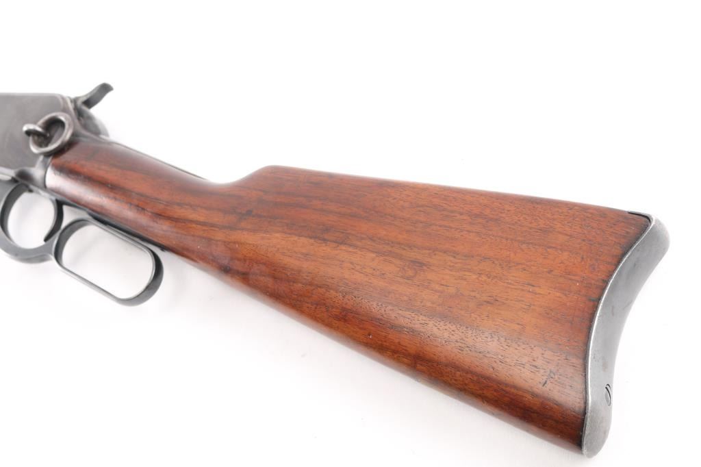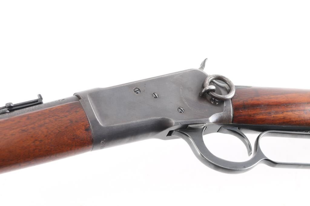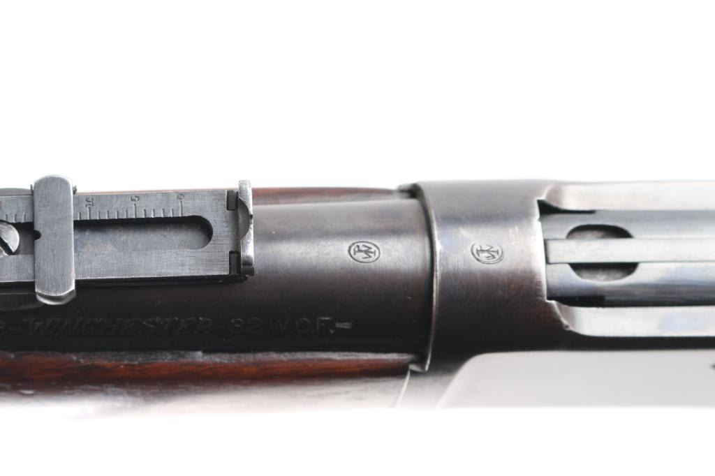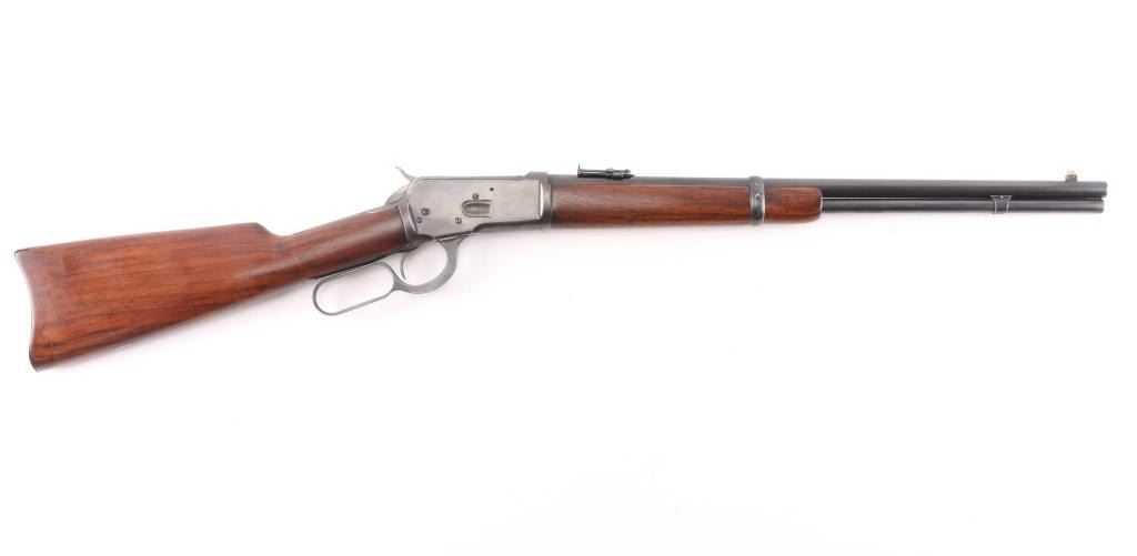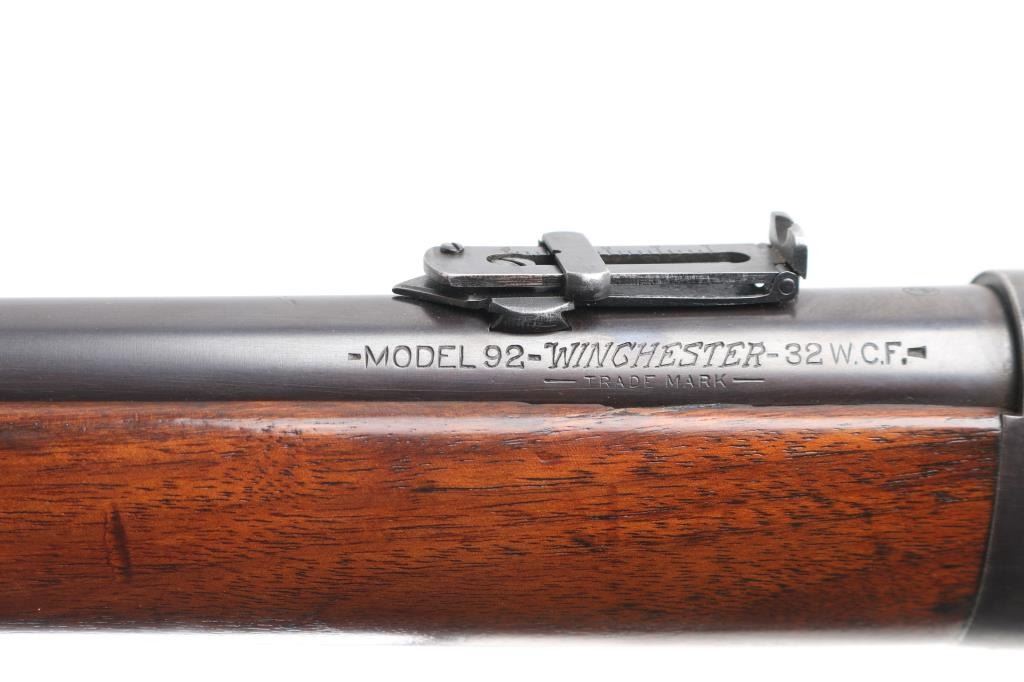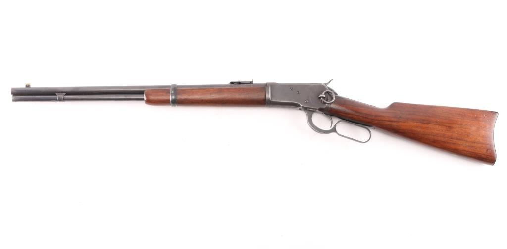 SRC Vintage lever action repeating rifle chambered in .32-20 Winchester, manufactured circa 1924. Features a blued refinish, 20" round barrel, single barrel band, full-length tube magazine, pinned blade front sight, flip-up ladder style rear sight graduated to 2,000 yards, smooth trigger, knurled hammer spur, saddle ring, smooth walnut forend, straight grip shoulder stock with metal carbine buttplate. The underside of the receiver is stamped “26”. Rifle retains approximately 80% of its thinned blued refinish showing handling/edge wear, minor scratches and circular scratches from ring. Action is smooth, the bore is overall good, bright with good rifling, light frosting in the grooves and a couple of areas of light pitting, the markings are good and the wood stocks are sound/good with minimal blemishes, a plastic wood filled hole on the underside of the buttstock from a previous sling swivel install and a couple of similar repairs to the wrist below the tang.Condition is NRA Good. C&R Firearm.