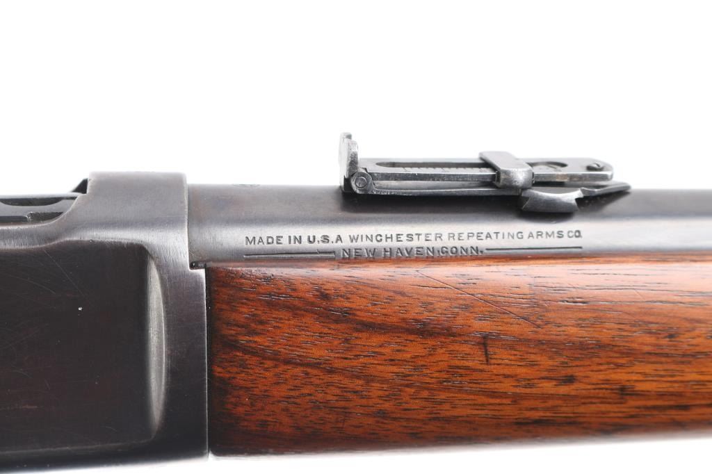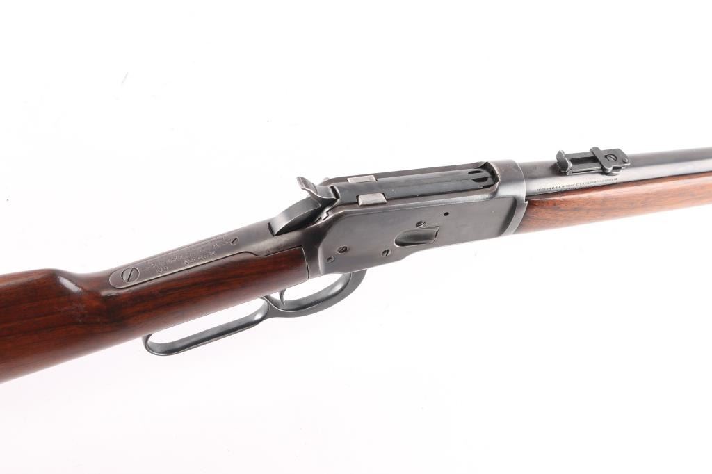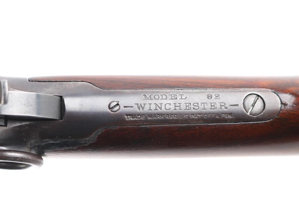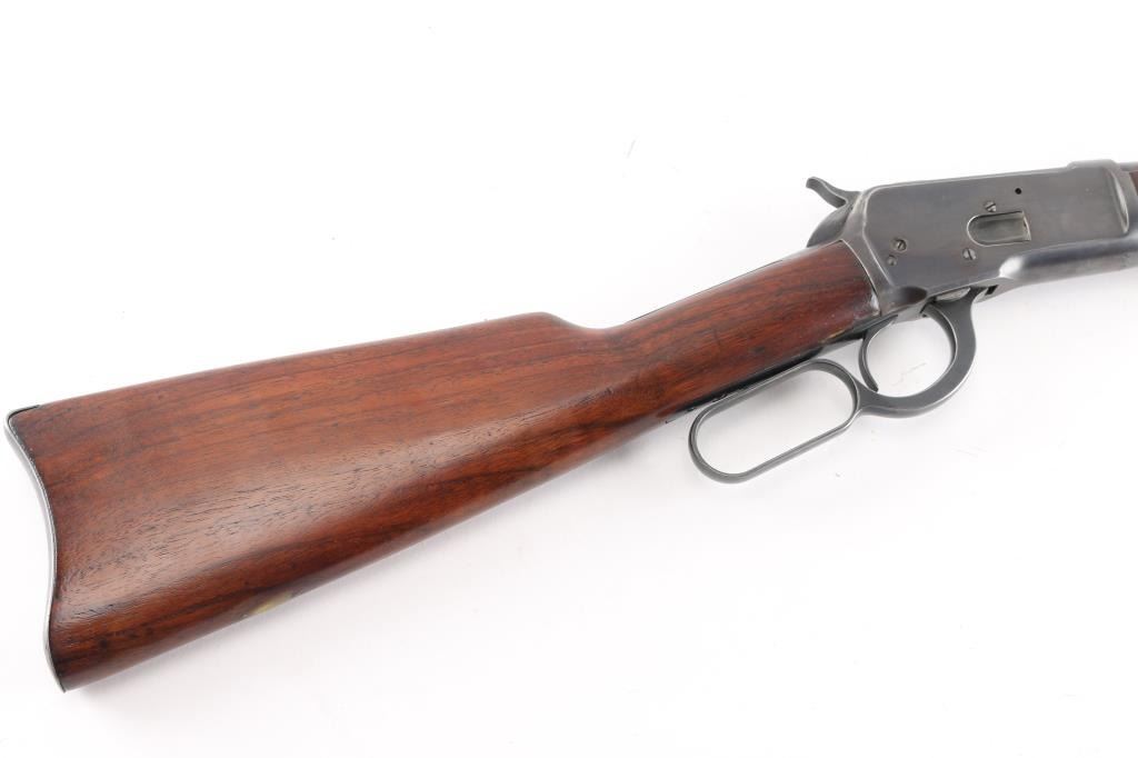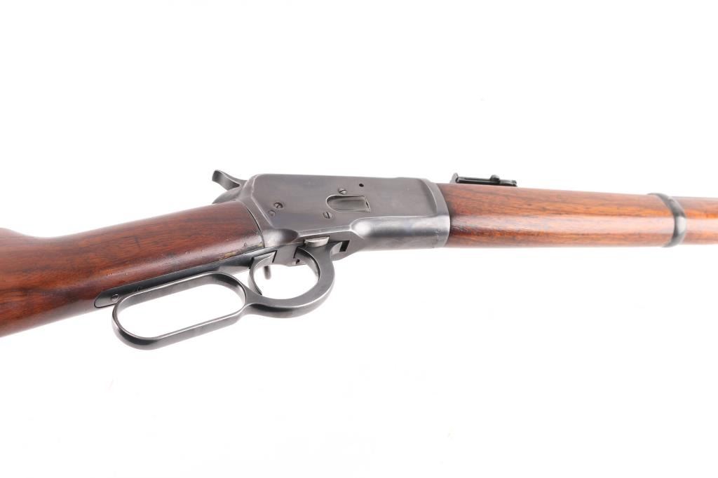 SRC Vintage lever action repeating rifle chambered in .32-20 Winchester, manufactured circa 1924. Features a blued refinish, 20" round barrel, single barrel band, full-length tube magazine, pinned blade front sight, flip-up ladder style rear sight graduated to 2,000 yards, smooth trigger, knurled hammer spur, saddle ring, smooth walnut forend, straight grip shoulder stock with metal carbine buttplate. The underside of the receiver is stamped “26”. Rifle retains approximately 80% of its thinned blued refinish showing handling/edge wear, minor scratches and circular scratches from ring. Action is smooth, the bore is overall good, bright with good rifling, light frosting in the grooves and a couple of areas of light pitting, the markings are good and the wood stocks are sound/good with minimal blemishes, a plastic wood filled hole on the underside of the buttstock from a previous sling swivel install and a couple of similar repairs to the wrist below the tang.Condition is NRA Good. C&R Firearm.