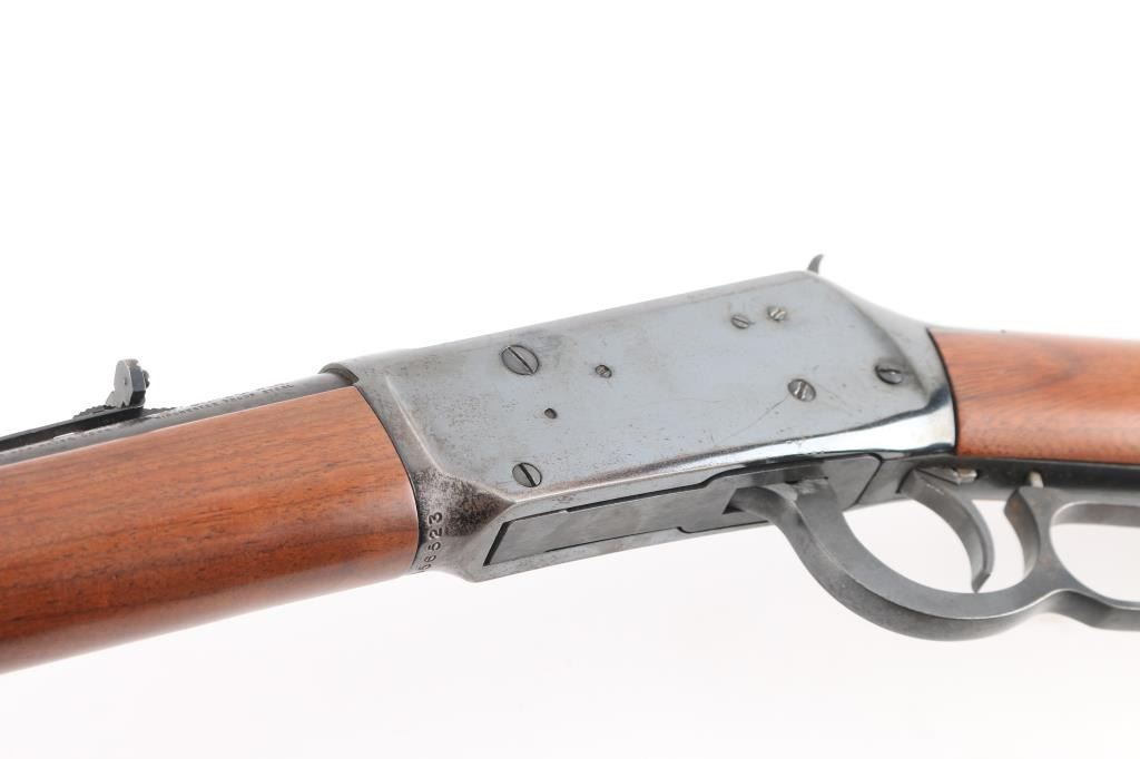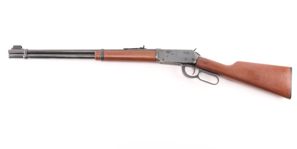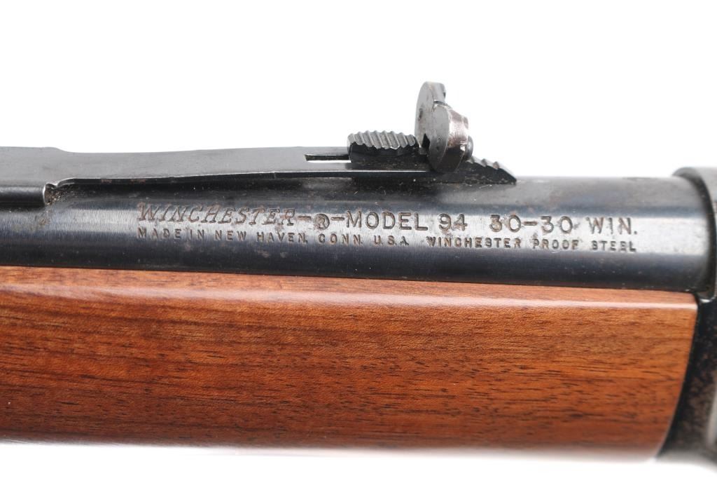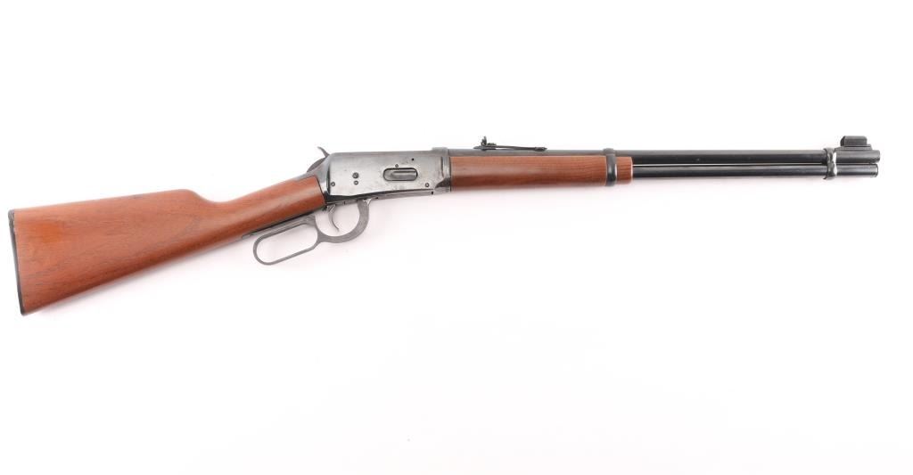 Eastern Carbine. Vintage lever action repeating rifle chambered in .30-30 Winchester. Manufactured 1970. Features a blued finish, 20" barrel, full-length tube magazine, hooded, ramped, blade/bead front sight , adjustable rear buckhorn sight. Smooth trigger, serrated hammer spur, steel receiver, smooth walnut forend and straight wrist shoulder stock with factory black plastic buttplate. Left receiver drilled/tapped for sights/optics. Bore is overall good/bright, rifling, light frosting in the grooves. Retains about 85% blue finish with handling wear mostly on the bottom of receiver, scratches/edge wear and scattered light pitting on the receiver. Wood is near excellent/sound with a couple of minor scratches. Markings are crisp. Action is smooth. NRA Condition-Good. C&R Firearm.