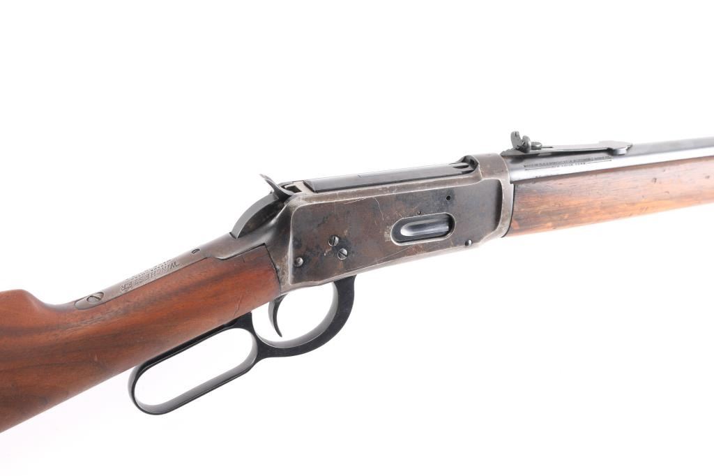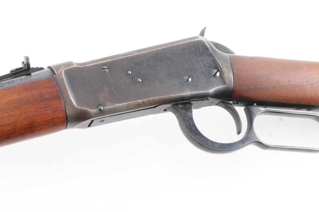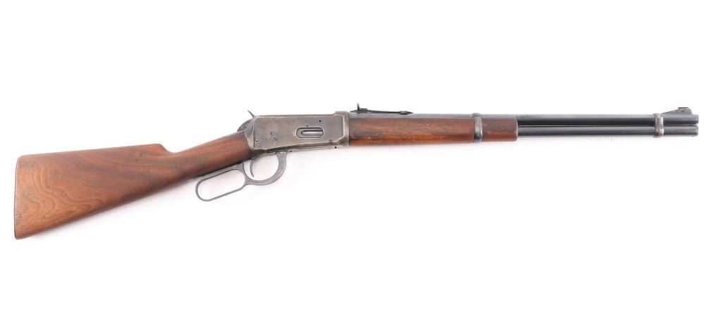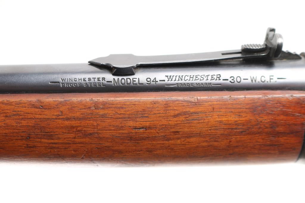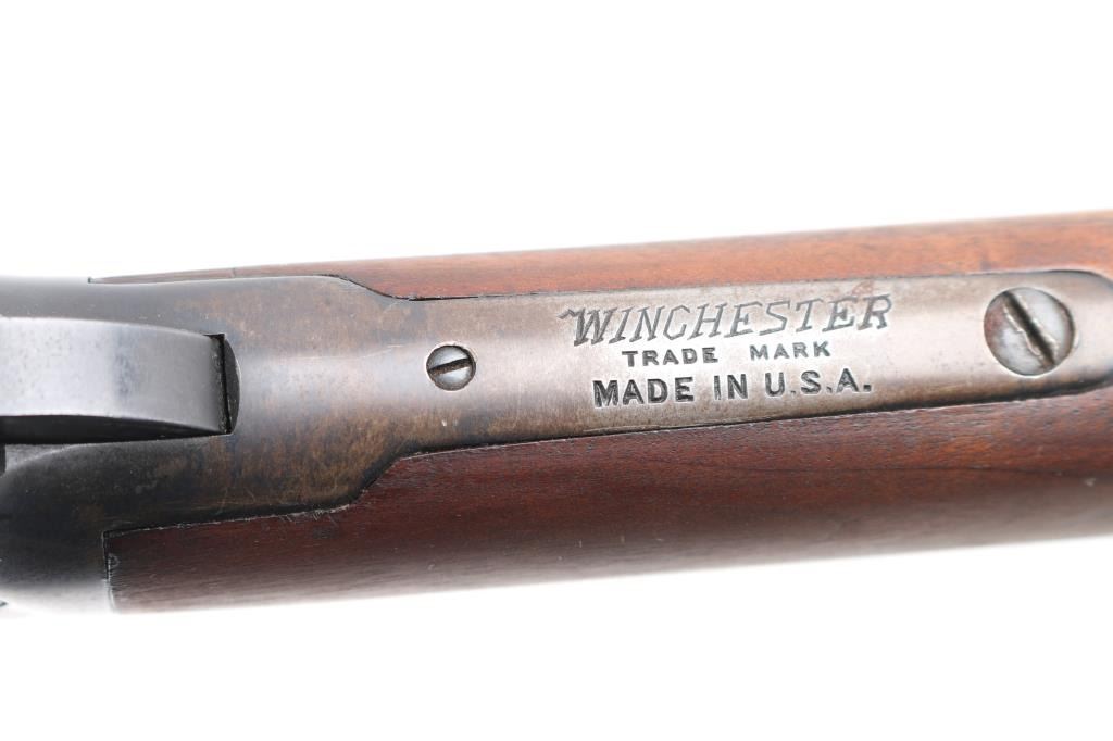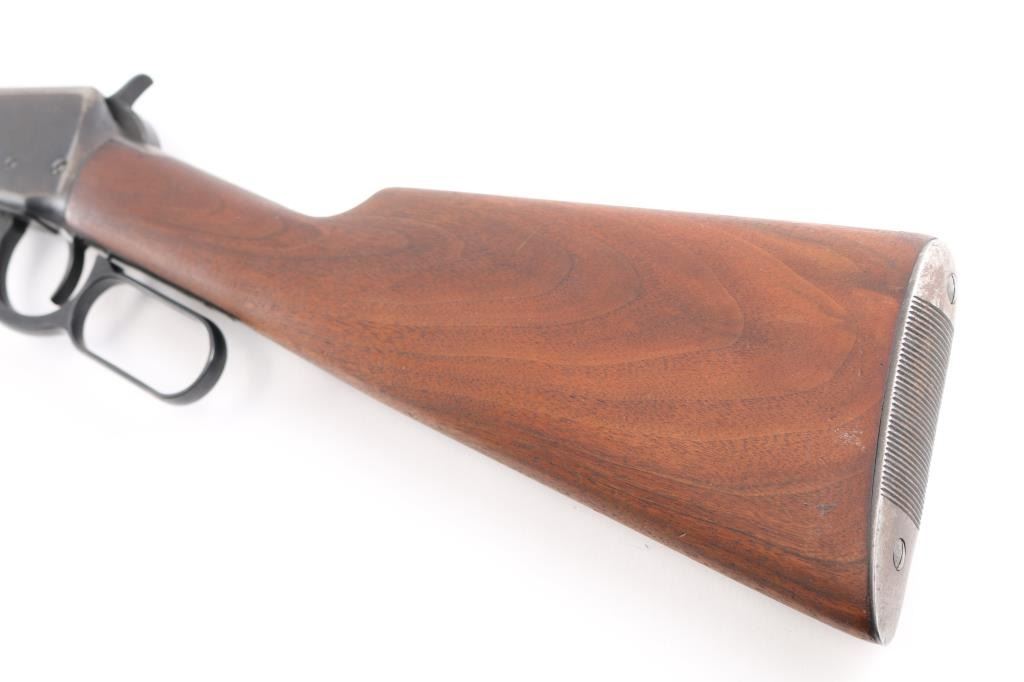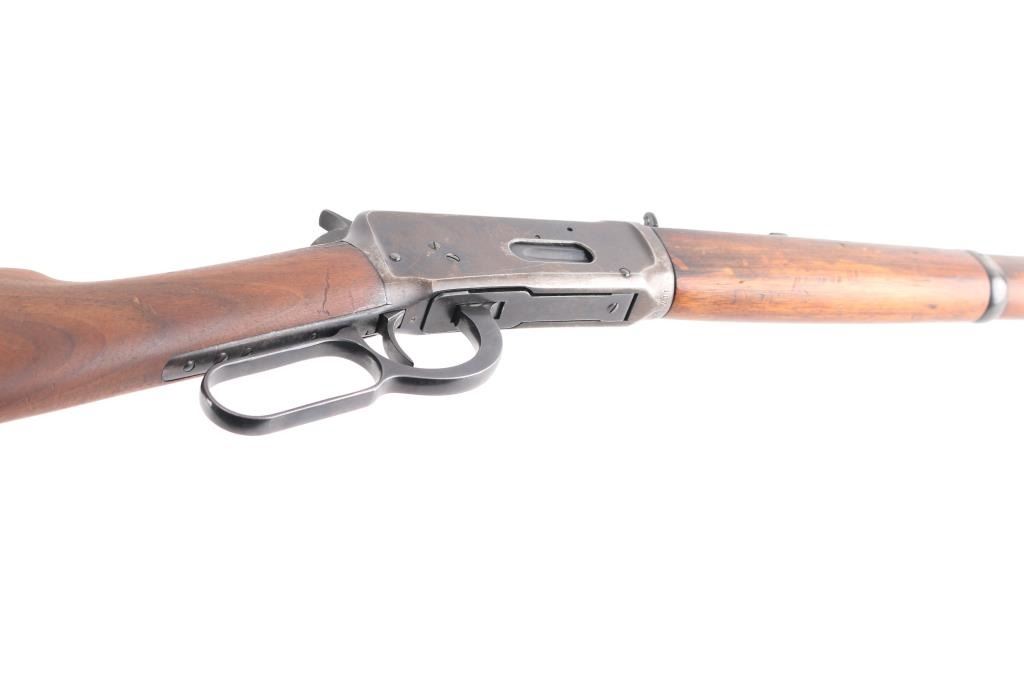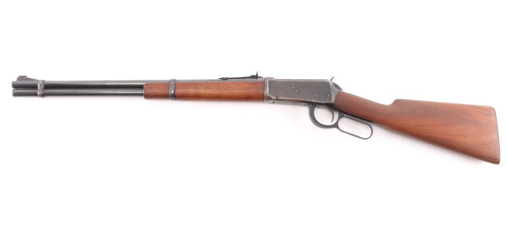 'Pre-64 Eastern Carbine' Lever action repeating rifle manufactured in New Haven, CT circa 1938. Chambered for 30-30 Features a blued finish, 20" tapered barrel, full-length tube magazine, ramped bead/blade front sight, semi-buckhorn rear sight, smooth trigger, serrated hammer spur, two barrel bands, smooth walnut forend and straight grip shoulder stock with serrated steel buttplate. Bore is excellent/bright condition. Retains 70% finish with edge losses, scratches,handling wear, mostly on the receiver. Areas of minor pitting on the receiver. Wood is very good condition with minor dents & scuffs, some handling loss on the forearm.. Action is smooth.