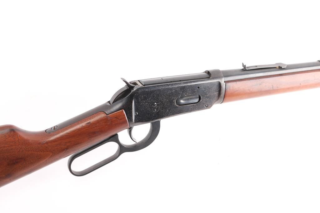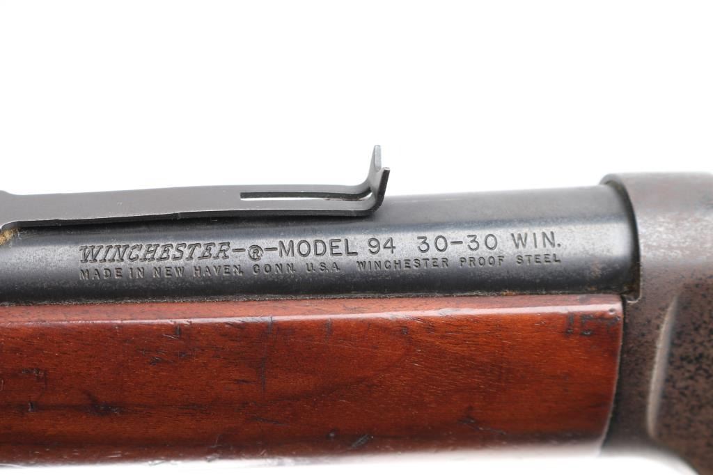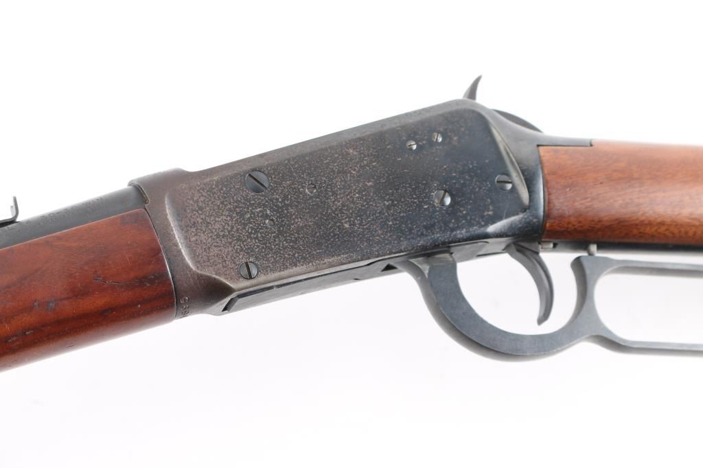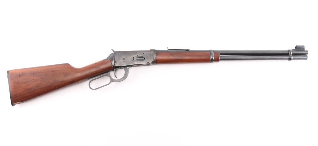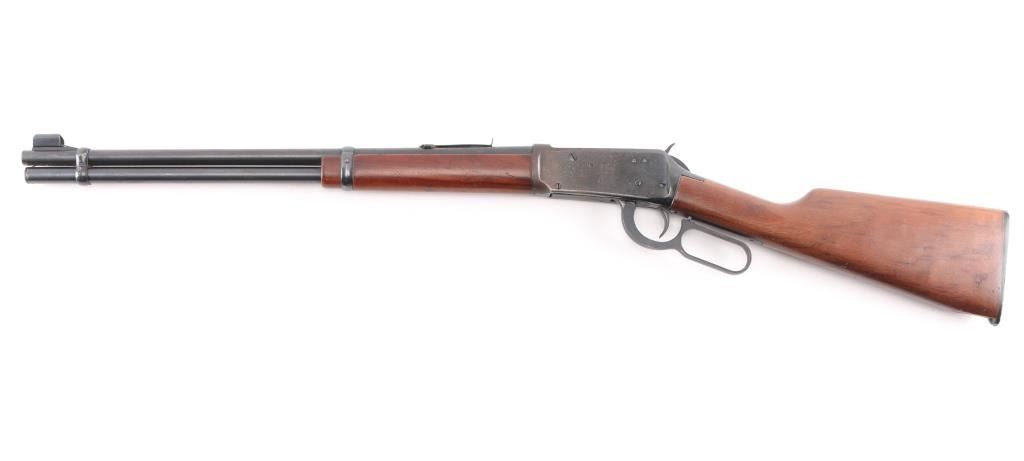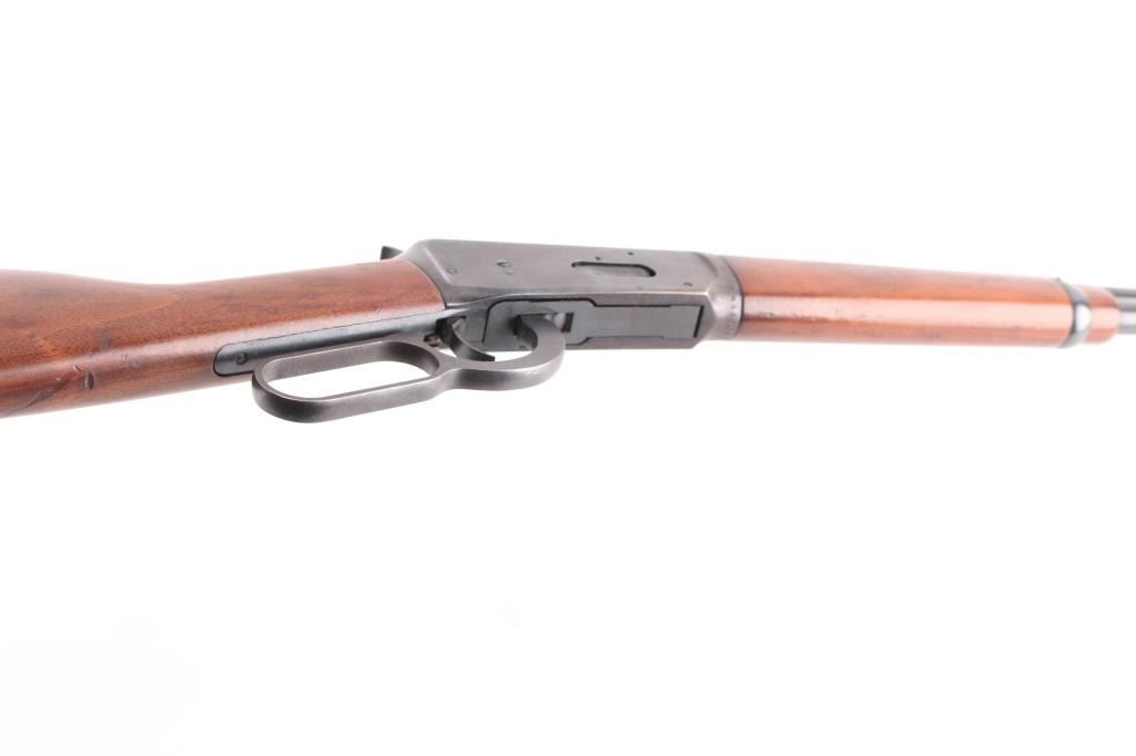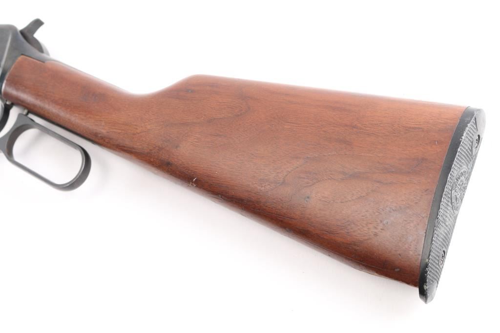 'Eastern Carbine' American made lever action repeating rifle chambered in .30-30 Winchester, manufactured circa 1978. Features a blued finish, 20" tapered barrel, full-length tube magazine, hooded, ramped blade front sight with bead top, adjustable rear sporting sight, two barrel bands, smooth trigger with beveled edges, serrated hammer spur, factory drilled & tapped receiver for a side mounted sight, smooth wood forend, and straight grip shoulder stock with factory black synthetic buttplate. Rifle exhibits approximately 75% of it's original finish showing freckled losses/pitting on the receiver and tangs. Action is smooth, the bore is excellent/bright, and the wood stocks are overall good/sound with a 1 3/4 chip out of the toe. Action is smooth. The rear sight is missing the elevator.