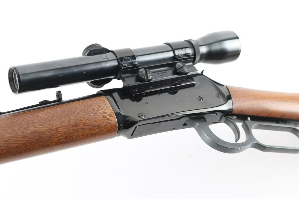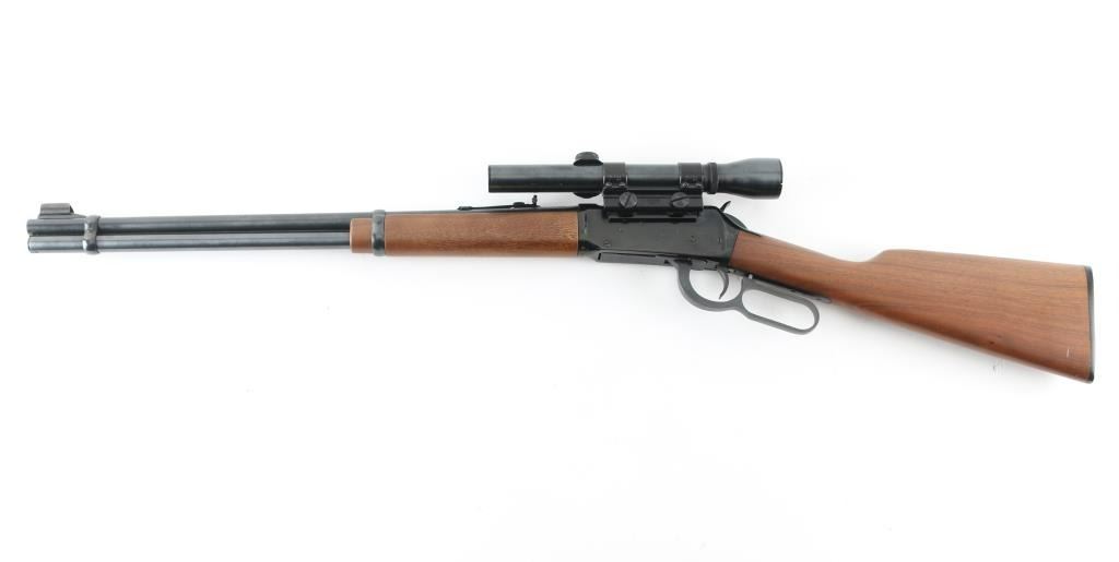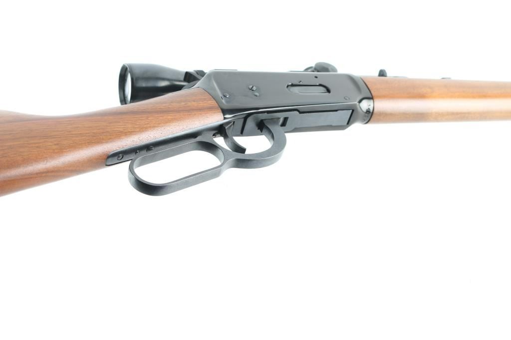 Lever action rifle manufactured circa 1971. Features blued finish, smooth wood stock and forend, factory plastic buttplate, hooded blade front sight with polymer top bead, sporting rear sight , 20" barrel with full length magazine tube underneath. Bore is excellent/bright. Retains 99% blue finish. Wood is near excellent with a small dent, and scratch on the right buttstock. Action is smooth/tight. left side receiver mounted weaver K2.5-C3 .scope, with Weaver base, and rings. Clear optics. A really nice conditioned 94 for being over 50 years old. NRA condition-Excellent. C&R Firearm
