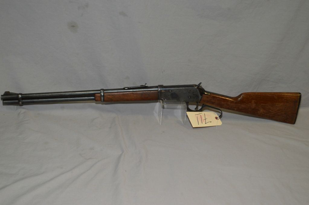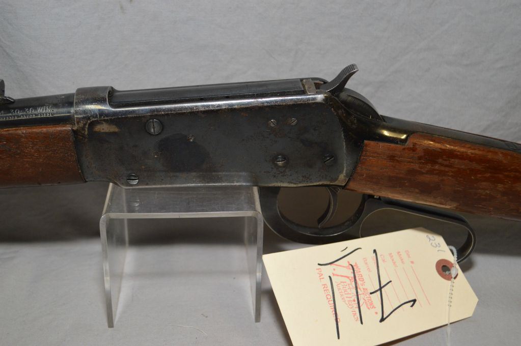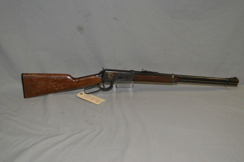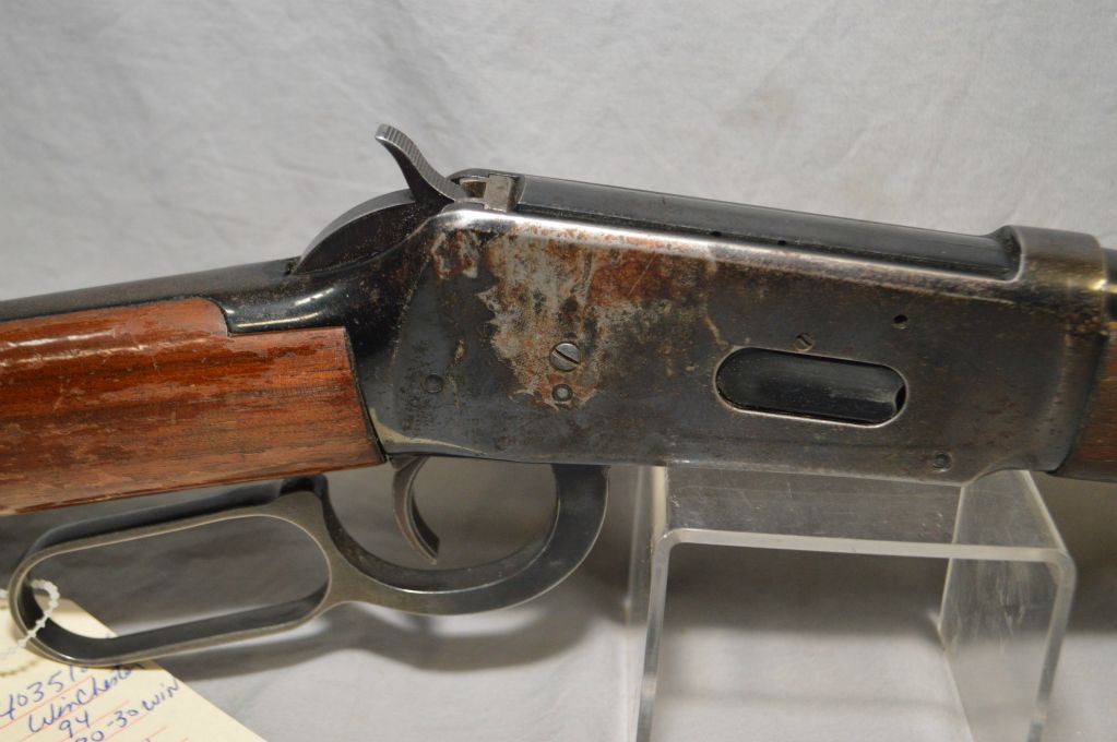 Winchester Model 94, 30-30 Win cal. lever action, tube fed rifle with 20" barrel [ Fading blue finish with some surface rust, barrel sights, walnut stock with flaking varnish, Winchester repeating arms plastic butt plate] Serial: 4035125