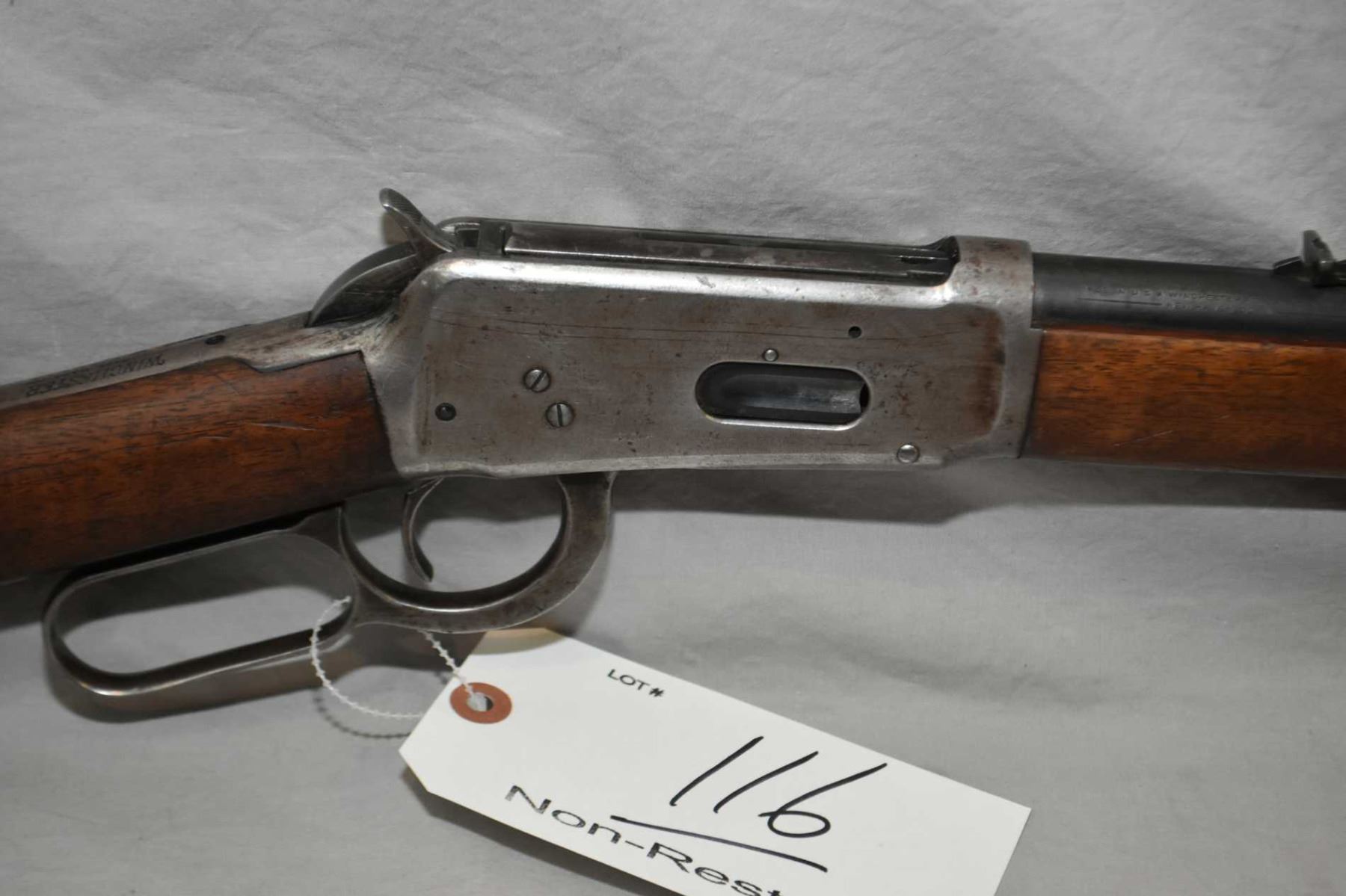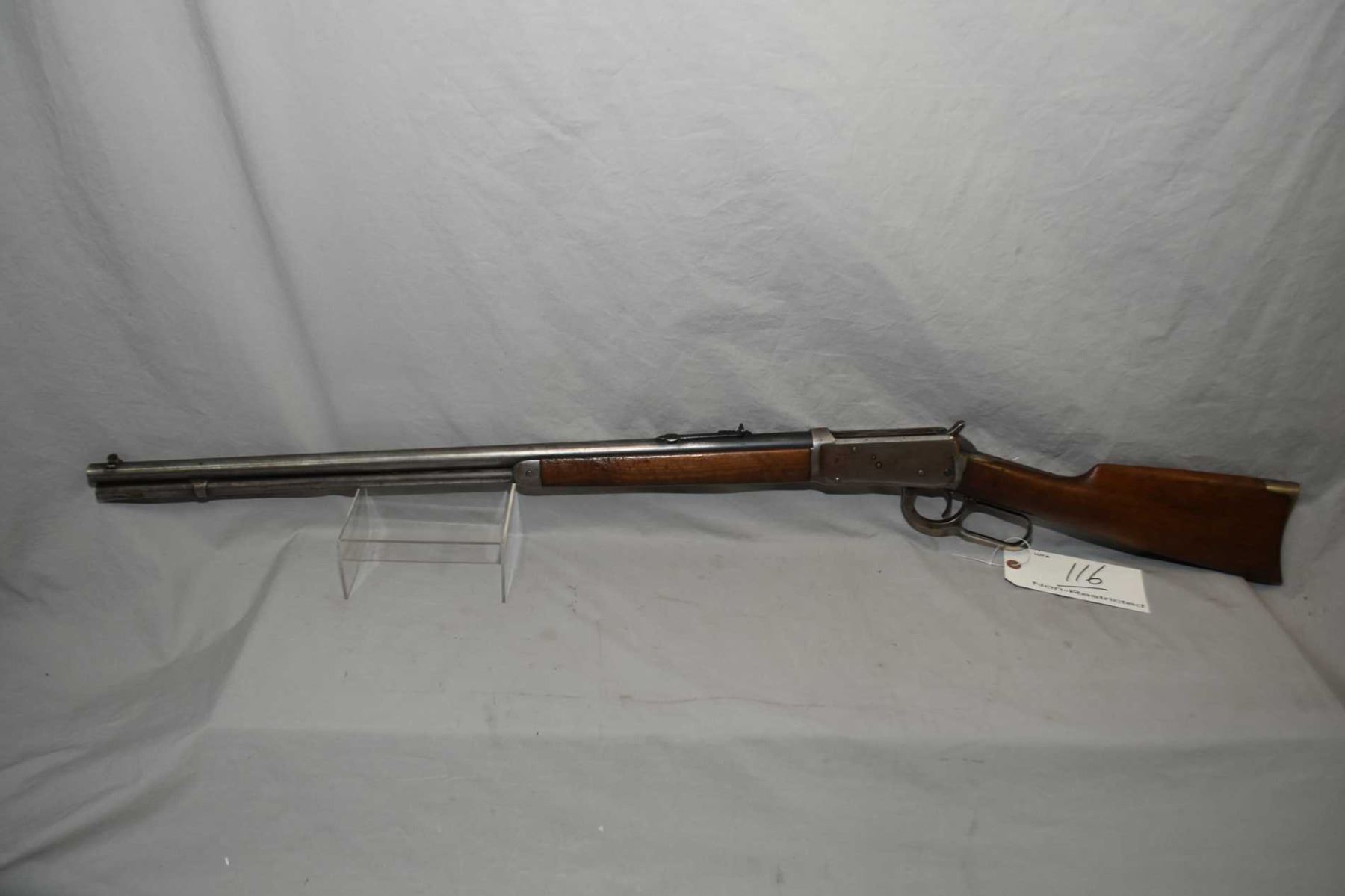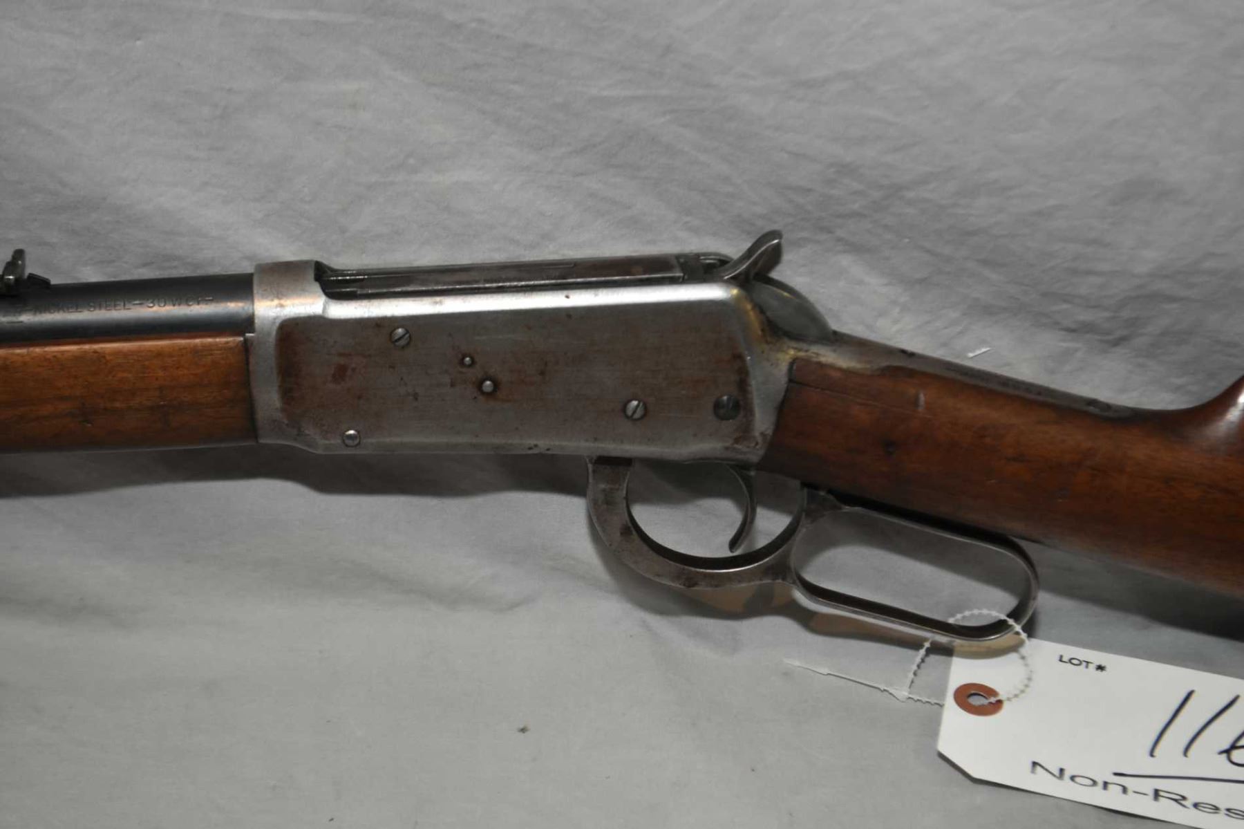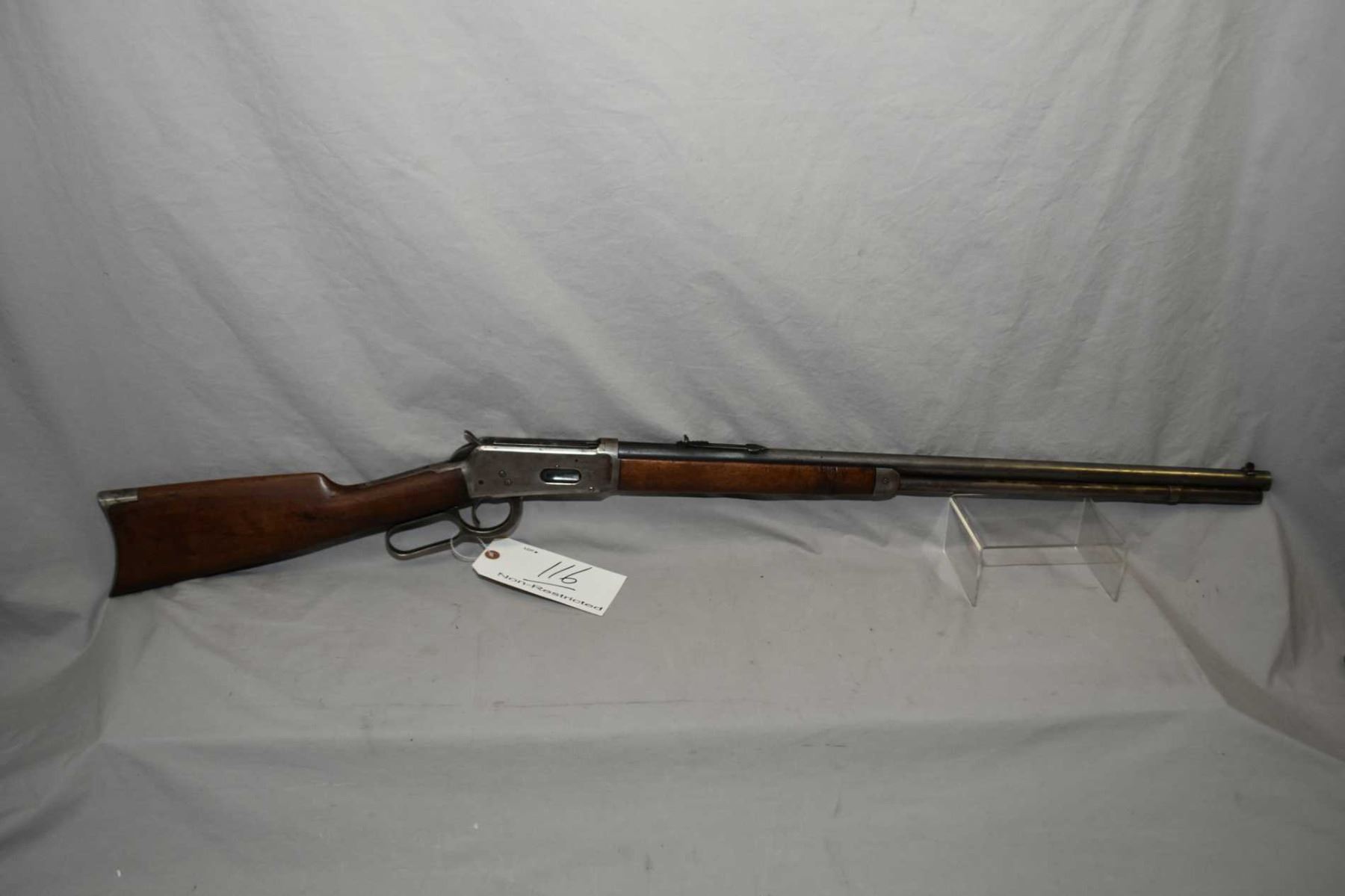 Winchester Model 94 .30 WCF Cal Lever Action Rifle w 26" round barrel full mag [ fading blue finish turning grey in some areas, barrel sights, wood has slight cracks behind receiver on left side, gouges on forewood right side, metal crescent butt plate, Circa 1927 ] Ser # 1020493