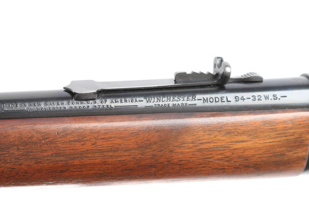 Pre-64 Eastern Carbine' Vintage lever action repeating rifle chambered in .32 Winchester Special, manufactured in New Haven, CT circa 1949. Features a blued finish, 20" tapered barrel, full-length tube magazine, hooded ramped blade/bead front sight, adjustable sporting rear sight, smooth trigger, serrated hammer spur, steel receiver, two barrel bands, smooth walnut forend and straight grip shoulder stock with knurled metal buttplate. Bore is excellent/bright. Retains 95% original blue finish with some slight edge wear/scratches. Wood is very good/sound with scratches/dings mostly on the shoulder stock, action is smooth. Winchester markings are crisp/clear. The lower barrel band screw slot is broken,