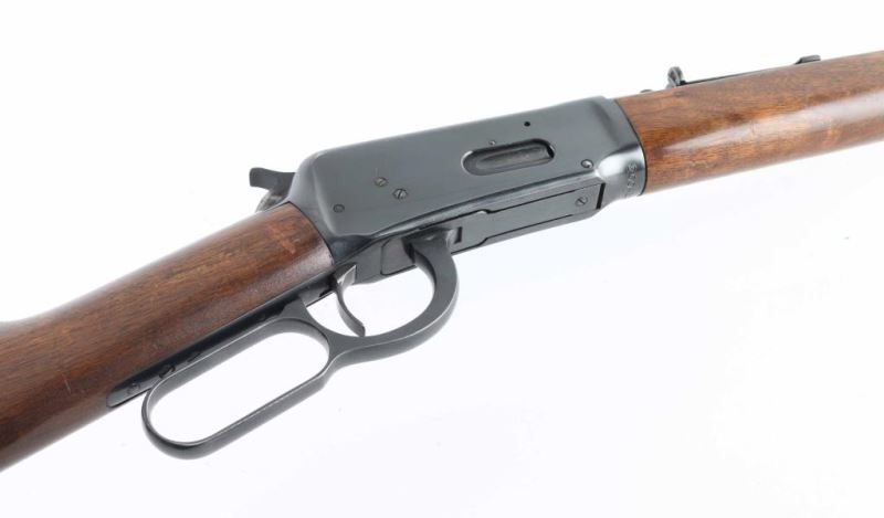 Rifle. Lever-Action. Manufactured 1954. Carbine configuration. 20" round barrel with hooded, ramped, post/bead front, and u-notch rear sights. Winchester markings stamped on barrel. No tang markings. Barrel/receiver proofed. Action is crisp/tight. Bore appears excellent/bright. Blued metal finish is about 85%, with edge wear, rubs, and minor scratches. Walnut stock/forearm are very good with minor scratches/rubs. Checker steel buttplate. NRA Condition-Very Good. Modern Firearm.