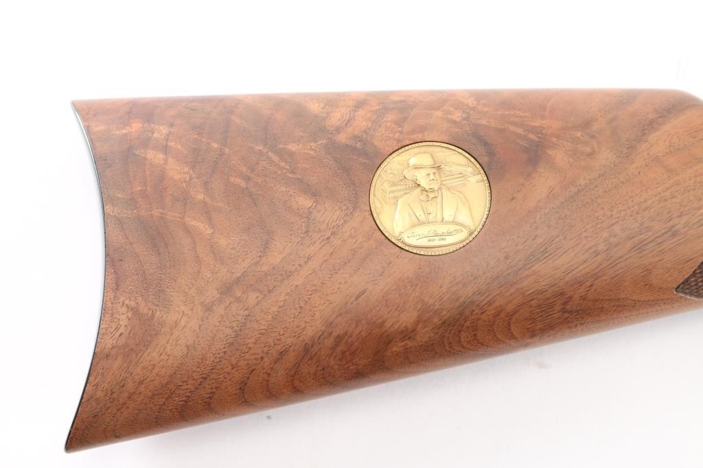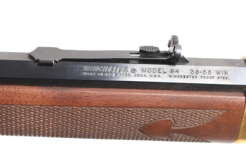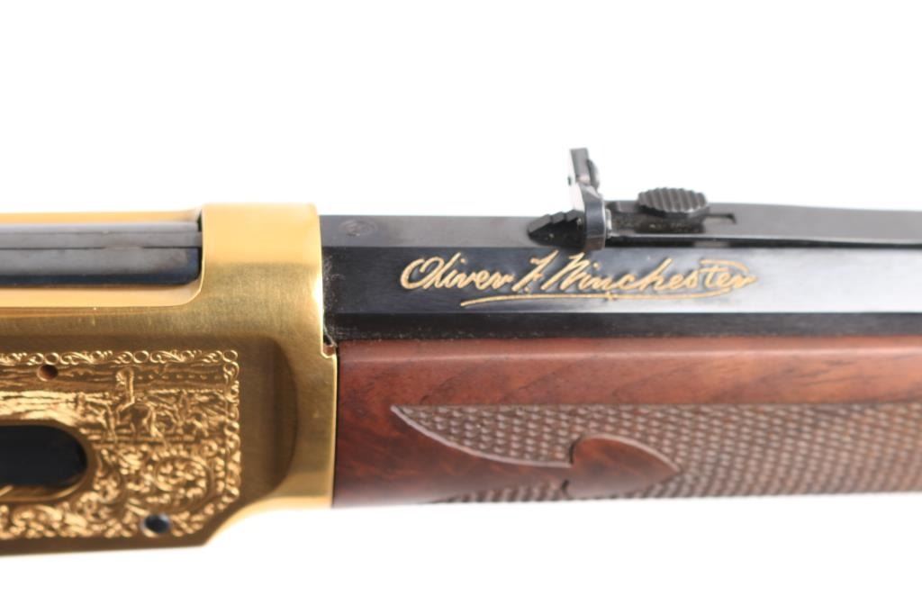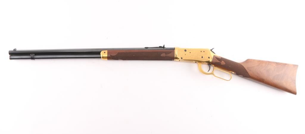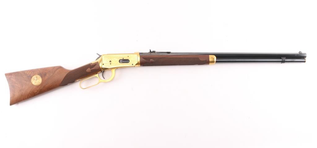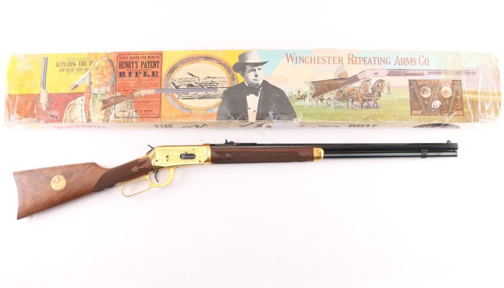 Commemorative lever action repeating rifle celebrating the company's founder, chambered in .38-55 Winchester. One of only 19,999 produced, circa 1980. Features a blued 24" octagon barrel, full-length tube magazine, dovetailed blade front sight, adjustable rear sporting sight, brass colored receiver with elaborated roll-stamp engraving, Oliver F. Winchester signature in gold on the right rear barrel flat, smooth trigger with beveled edge, serrated hammer spur, grip safety, fancy checkered walnut forend with gold colored metal cap, and straight grip shoulder stock with inlayed commemorative medallion on the right side & curved metal buttplate. Includes the original cardboard sleeve & styrofoam inserts with matching label. Rifle exhibits approximately 99% of it's original finish showing a few handling marks. Action is smooth, the bore is pristine and wood stocks are fine. The packaging is fair.