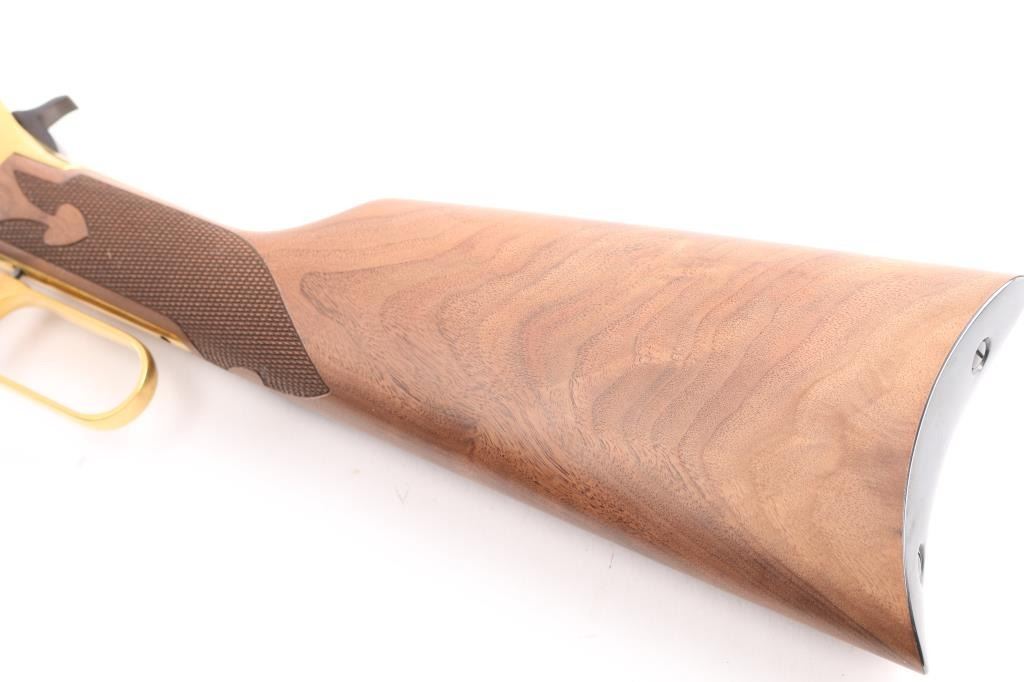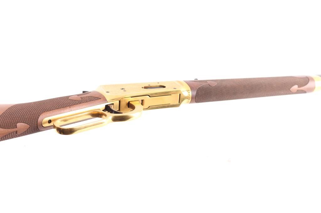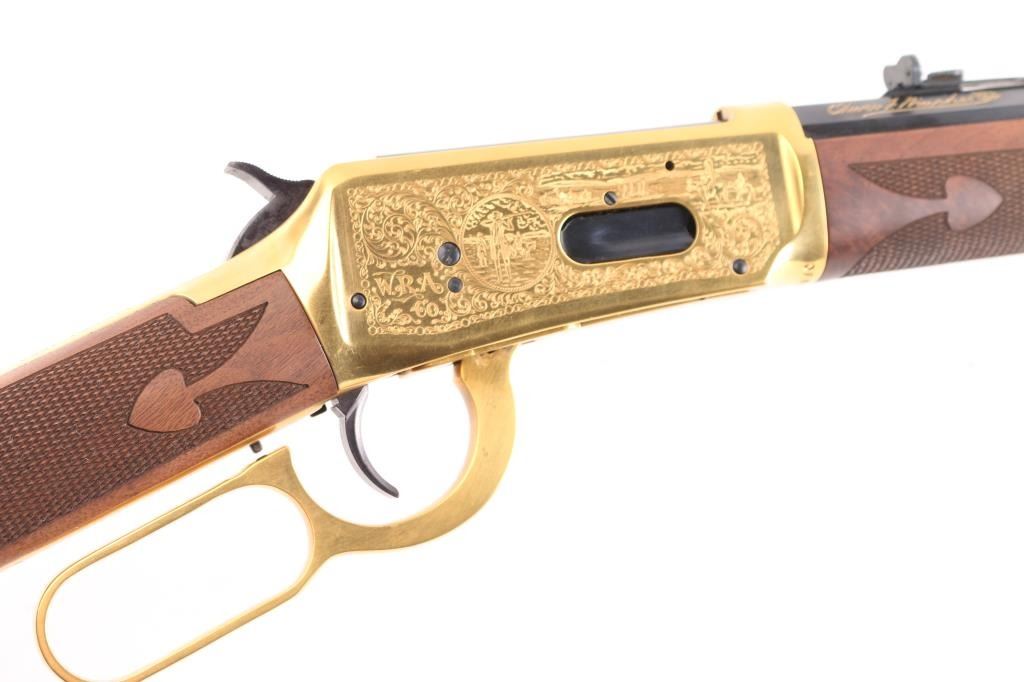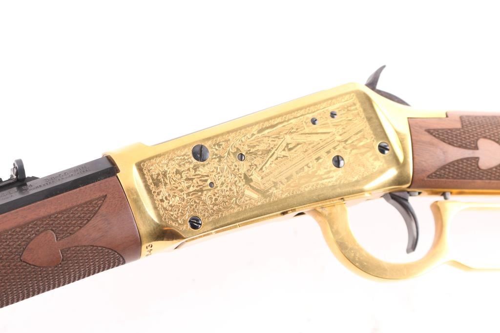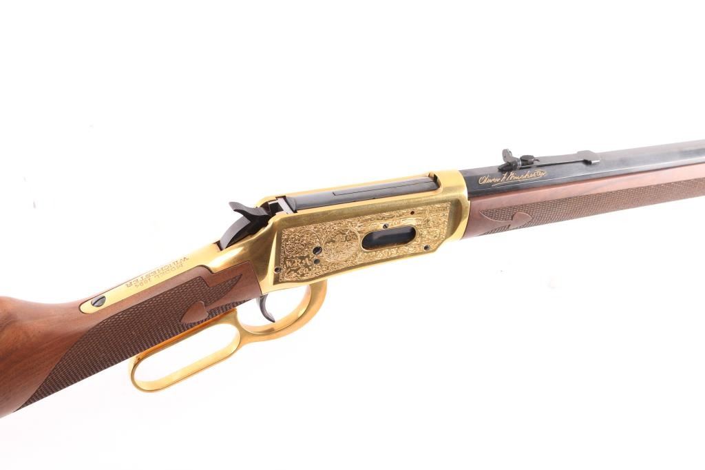 Commemorative lever action repeating rifle celebrating the company's founder, chambered in .38-55 Winchester. One of only 19,999 produced, circa 1980. Features a blued 24" octagon barrel, full-length tube magazine, dovetailed blade front sight, adjustable rear sporting sight, brass colored receiver with elaborated roll-stamp engraving, Oliver F. Winchester signature in gold on the right rear barrel flat, smooth trigger with beveled edge, serrated hammer spur, grip safety, fancy checkered walnut forend with gold colored metal cap, and straight grip shoulder stock with inlayed commemorative medallion on the right side & curved metal buttplate. Includes the original cardboard sleeve & styrofoam inserts with matching label. Rifle exhibits approximately 99% of it's original finish showing a few handling marks. Action is smooth, the bore is pristine and wood stocks are fine. The packaging is fair.