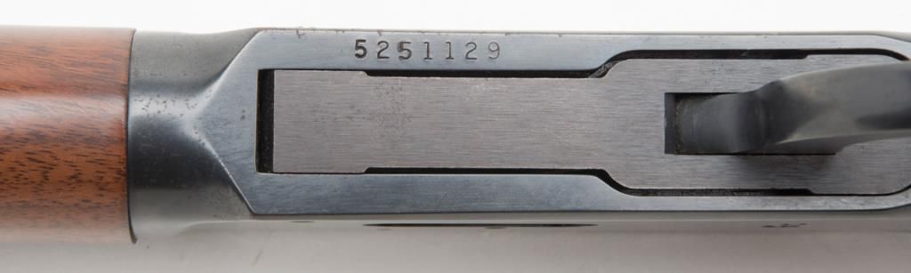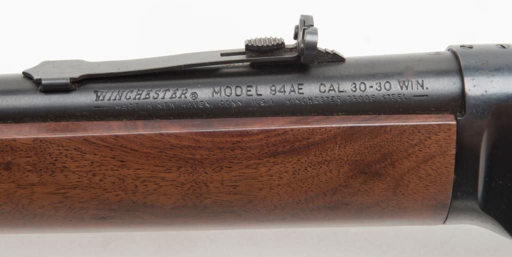 Winchester Model 94 AE lever action rifle, 30-30 Winchester caliber, Serial #5251129. The rifle is in overall excellent condition with a 20” blued barrel. The barrel, magazine and action all retain nearly all of the blued finish. The smooth wood stocks are in overall very good condition with small mars and compressions consistent with storage. The bore is very good, the action crisp and markings sharp. (Modern/PPT). Est.: $275-$425.