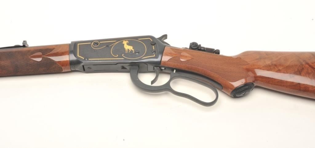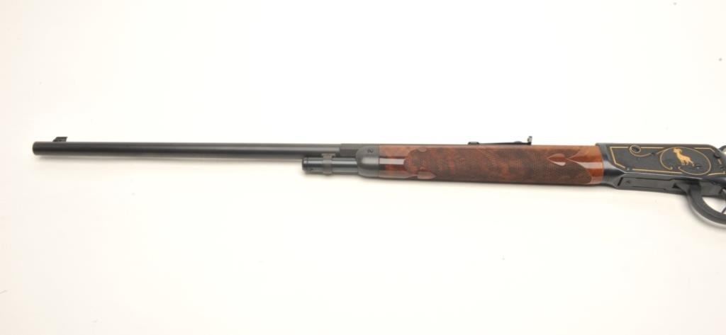 Winchester Model 94 Centennial High Grade lever action rifle, engraved and gold accented receiver, .30 W.C.F. caliber, 26” half round/half octagon barrel, half magazine, deluxe checkered wood stocks, S/NCNL1050, with factory cardboard box and outer factory cardboard sleeve, in like new condition; beautiful graining to wood stocks. (Modern). Est.: $1,000-$2,000.