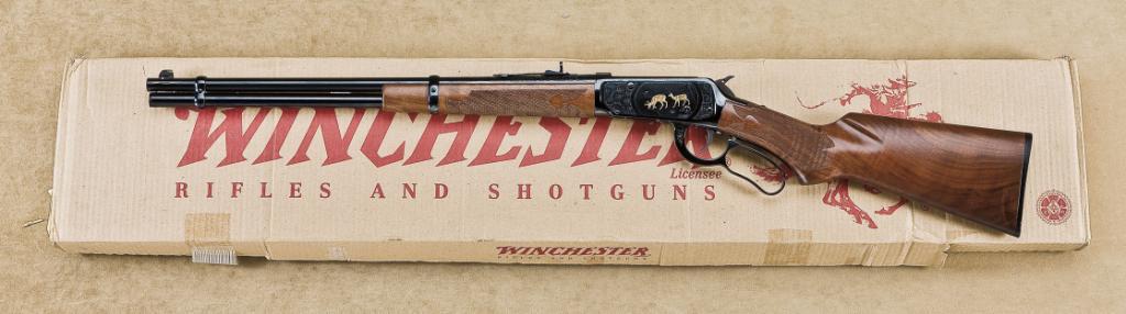 Winchester Model 94 Custom new Generation, serial #2NG027 (matching serial number to following lot). Factory letter from U.S.R.A. Custom Workshop confirms 30-30 cal., Hi-Lustre blue finish, 20” bbl., full mag, fancy American Walnut pistol grip stock with long nose forearm, satin finish, Win. Logo buttplate. 94 spade patter checkering style 8-18 lines per inch, engraved style 8 pattern with 24k gold Moose scene on right, 24k gold doe and buck on right with surrounding scroll engraving. Hand honed action, other deluxe features, 1 of 100 produced with Custom Shop proof and Win. Proof on barrel. Condition excellent to new in original box. Est. $4,000-6,000