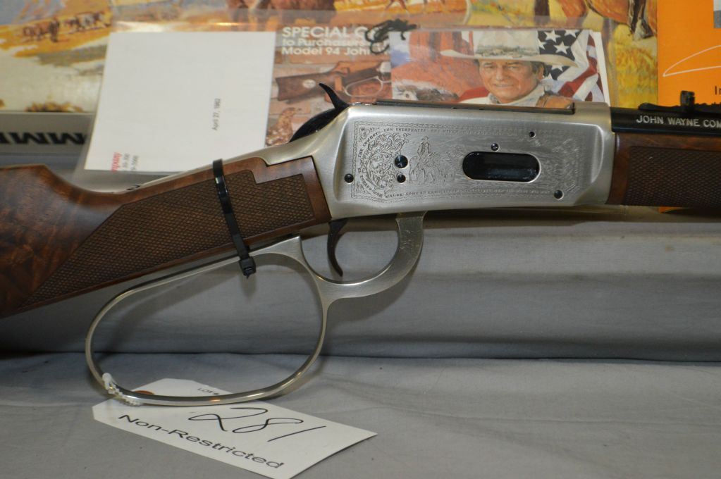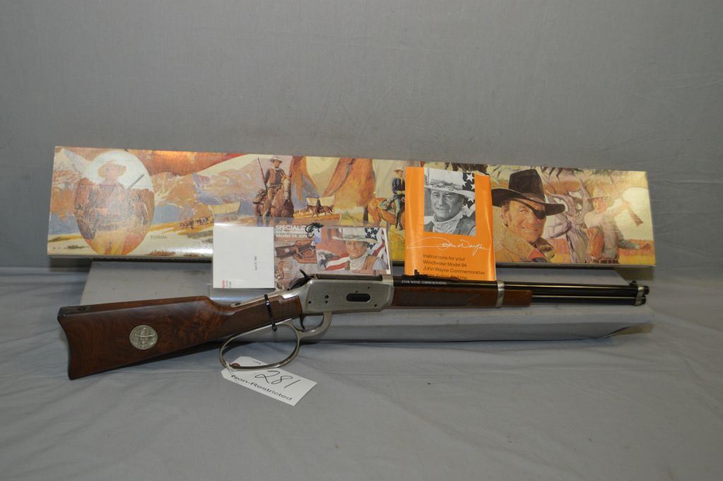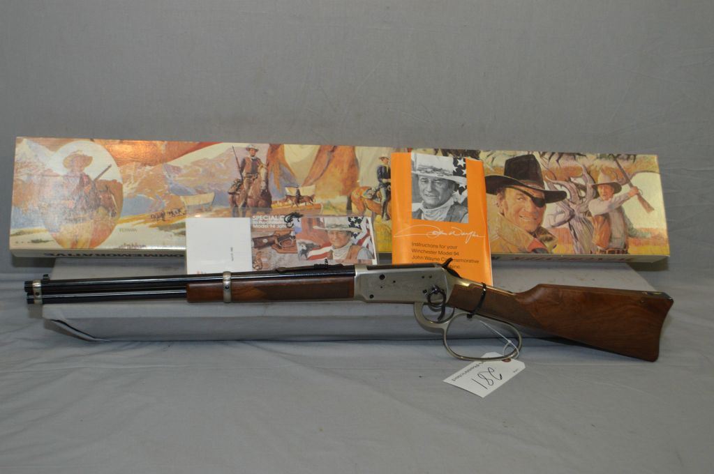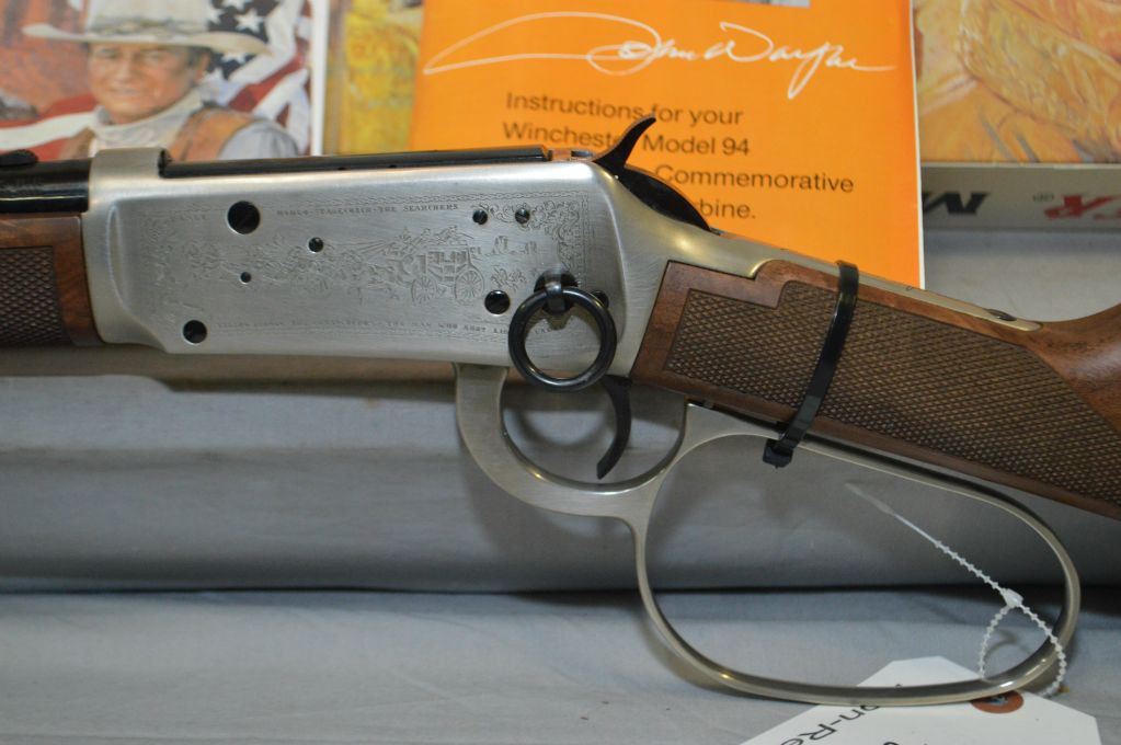 Winchester Model 94 John Wayne Commemorative .32 - 40 Cal Lever Action Saddle Ring Carbine w/ 18 1/2" bbl [ appears as new, unfired in original box w/booklet, paper work, etc. , blued finish, engraved receiver with various Movie Titles, large lever loop, with shipping carton ] Ser # CJW 69