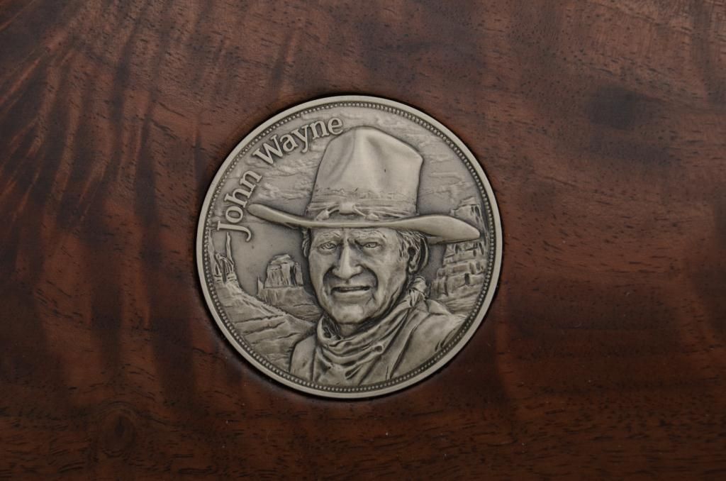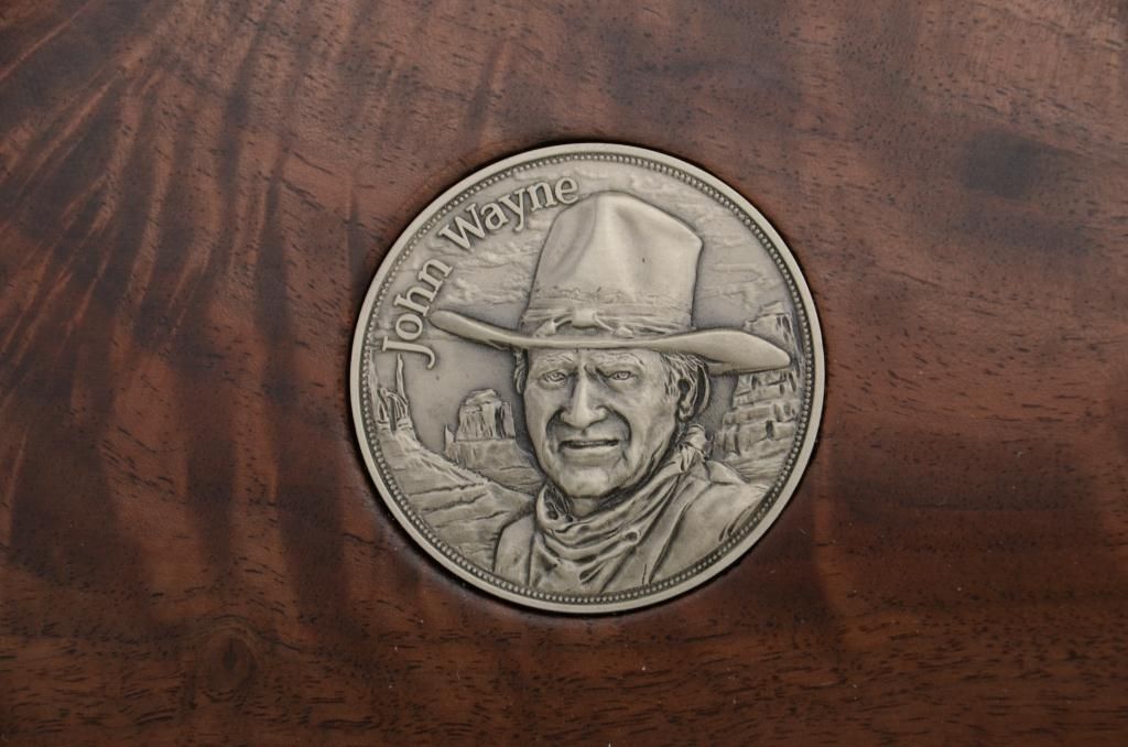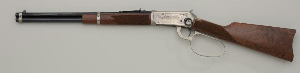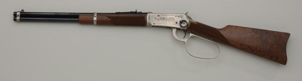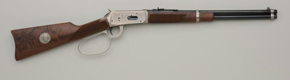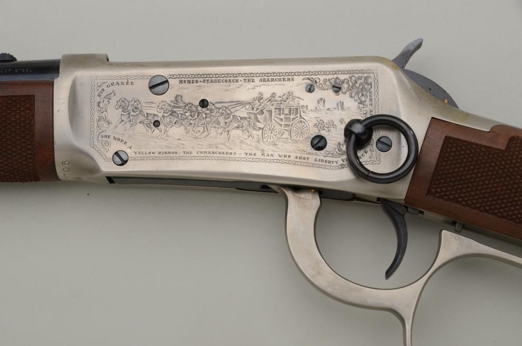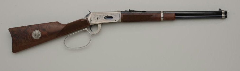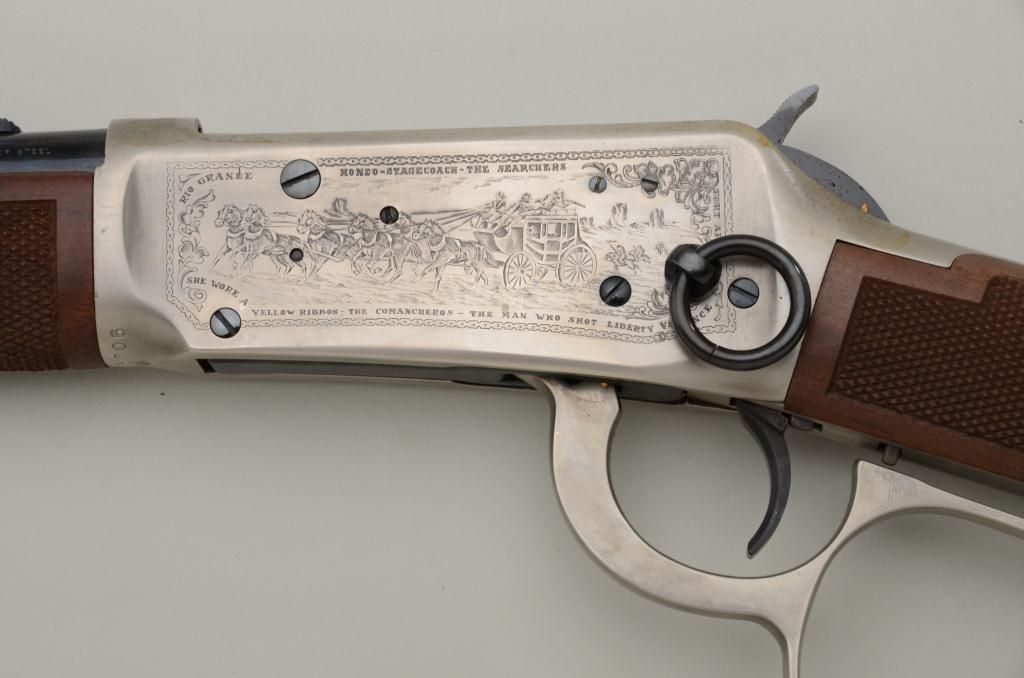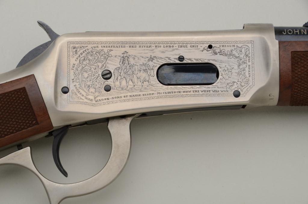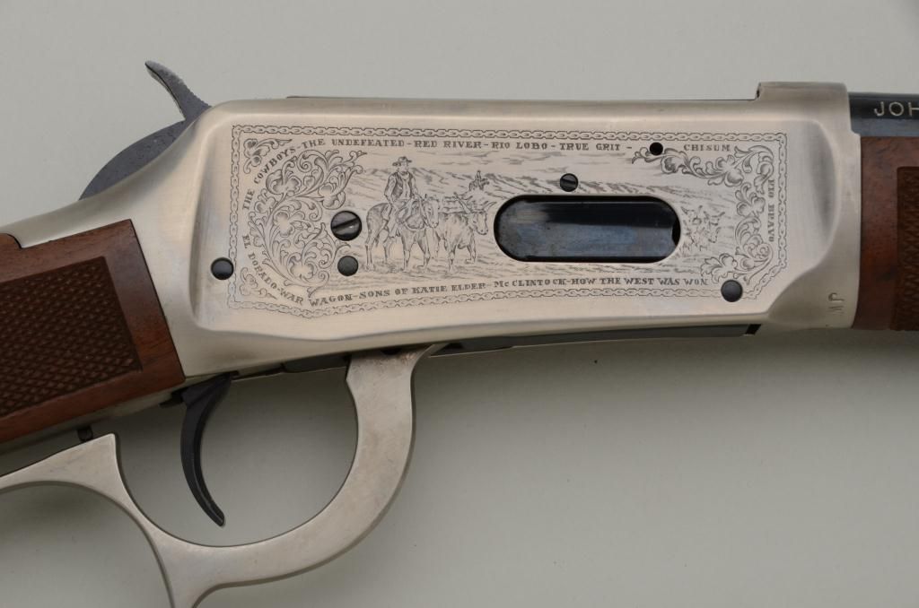 Winchester Model 94 John Wayne Commemorative SRC, .32-40 Win. cal., 18-1/2” barrel, blue finish to barrel and ornamented receiver with gun metal grey finish, checkered wood stocks, #JW 15706. This gun is in overallfine condition showing little use or handling, several minor storage spots of erosion, fine bore, action, markings and wood stocks with inlaid John Wayne medallion in right side of butt stock; accompanied withstyrofoam insert and Winchester cardboard sleeve; hanging tag also included. Est.: $500-$1,000.