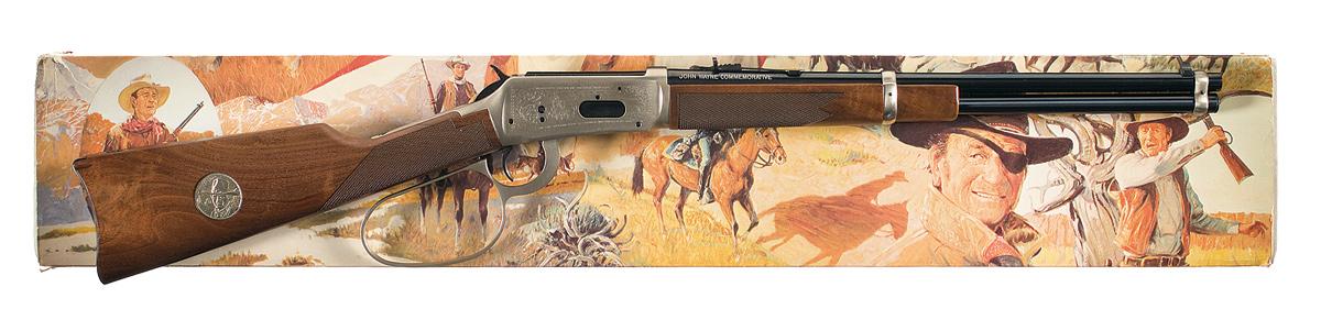 Standard markings and features of the John Wayne Large Loop Commemorative carbine. Complete with picture sleeve box numbered to gun, box of John Wayne commemorative cartridges and shipping box.