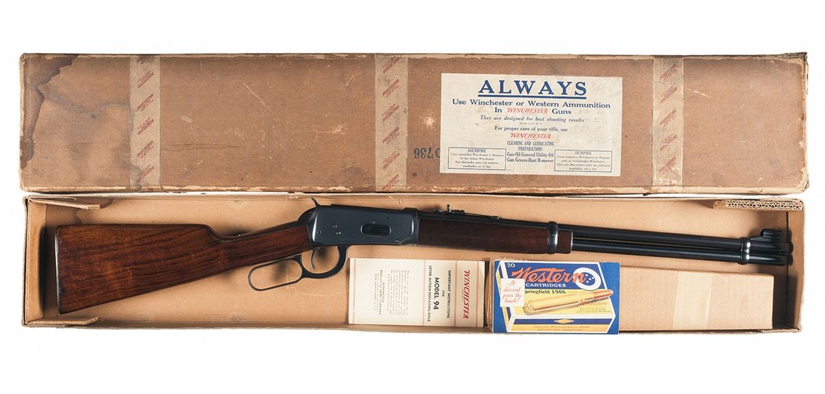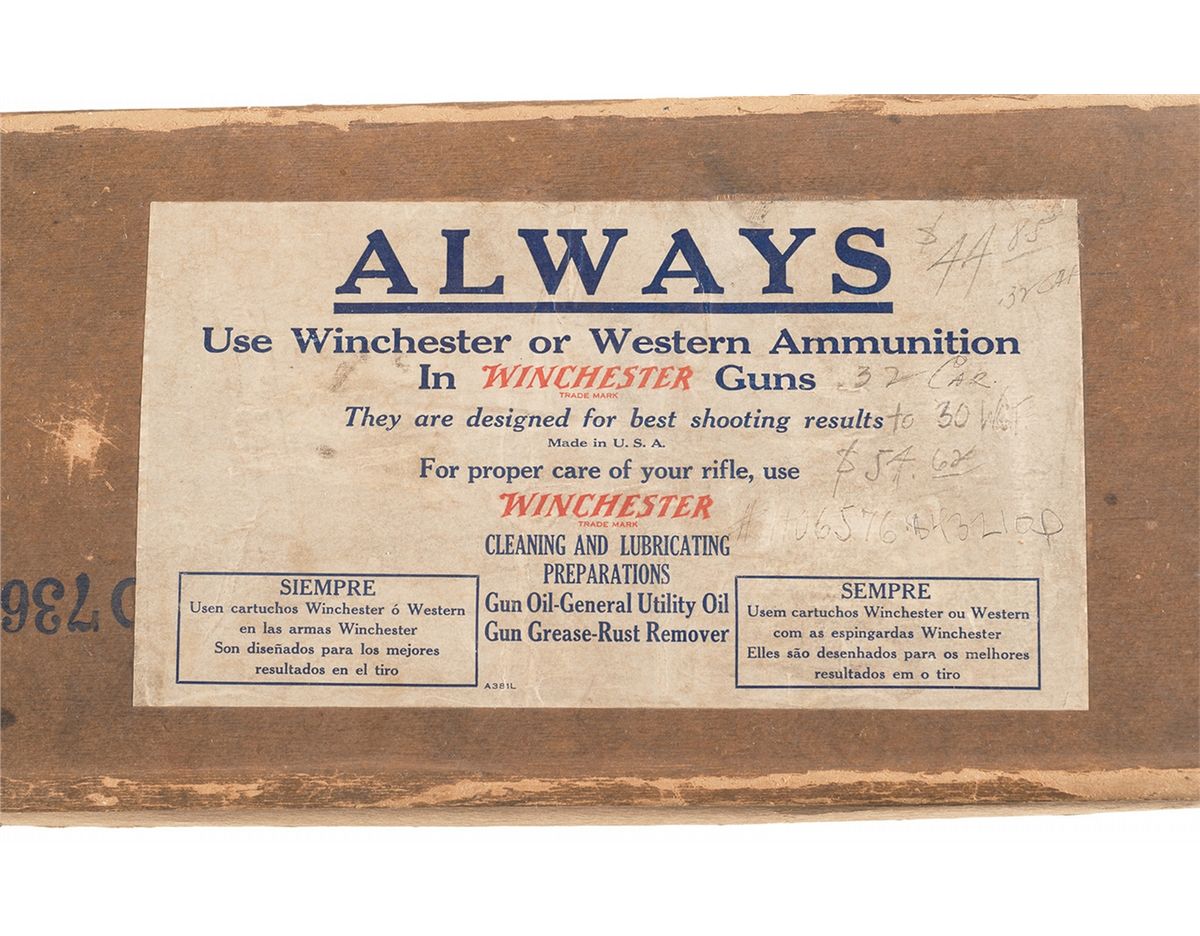 Manufactured in 1956. Hooded ramp front sight and elevation adjustable rear sight on a barrel marked with the Winchester legend on the left side. The Winchester factory oval proof is stamped on top of the barrel and receiver at the breech. All blue finish with a smooth walnut forearm and pistol grip stock with checkered steel buttplate. The original Winchester factory box is numbered to the gun, but with the caliber listed as 32 W.S. Also included are the instructions and Western cartridges advertisement.