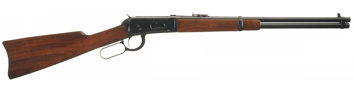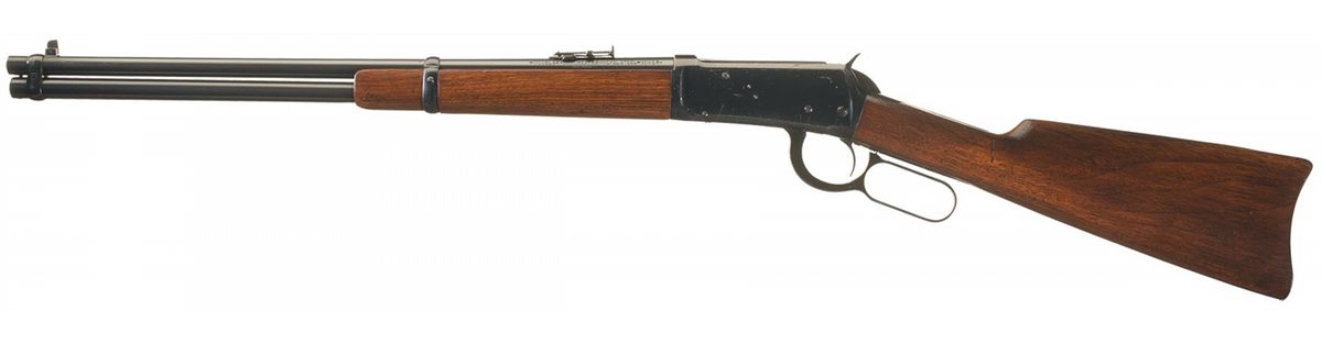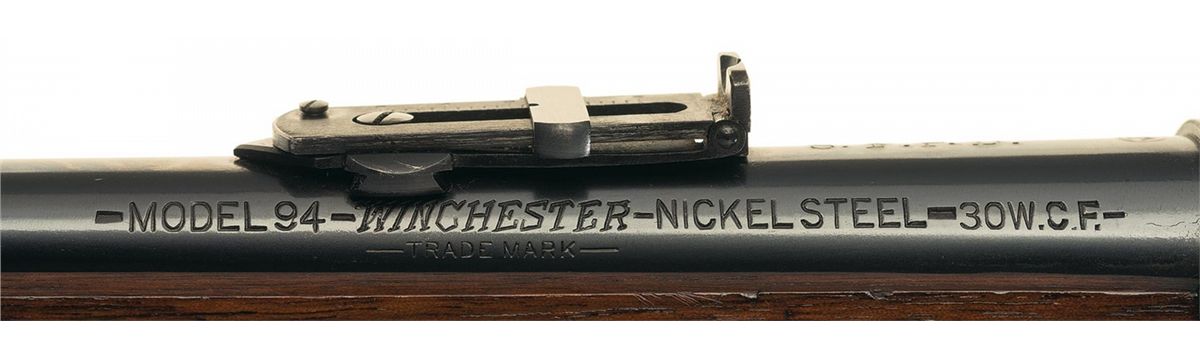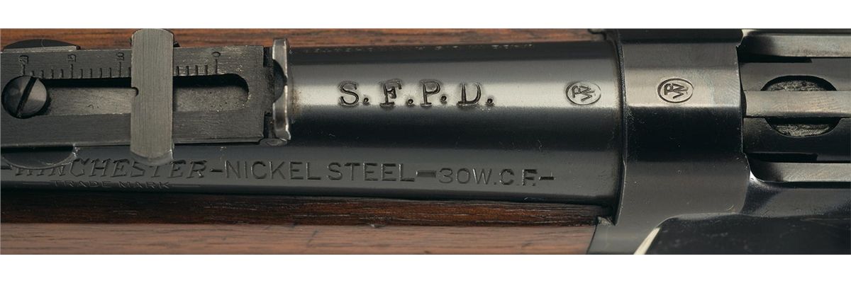 Manufactured in 1927. The carbine is equipped with a pinned blade front and a folding ladder rear sight. The barrel has the model, maker, "NICKEL STEEL" and caliber markings on the left rear, the two line New Haven address on the right rear and "S.F.P.D." (presumably the mark of the San Francisco, California Police Department) stamped on top behind the rear sight. The Winchester factory oval proof is stamped on top of the barrel and receiver at the breech. The upper tang has the three line trade mark information and the underside of the frame has the serial number. It features two barrel bands, full length magazine and all blue finish. Mounted with a smooth walnut forearm and straight grip stock with a carbine buttplate.
