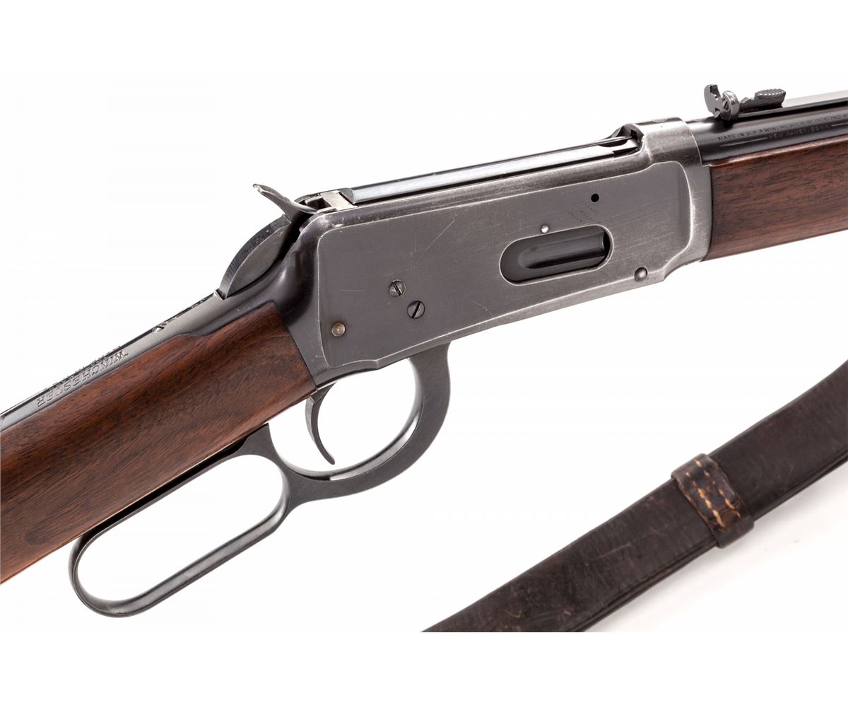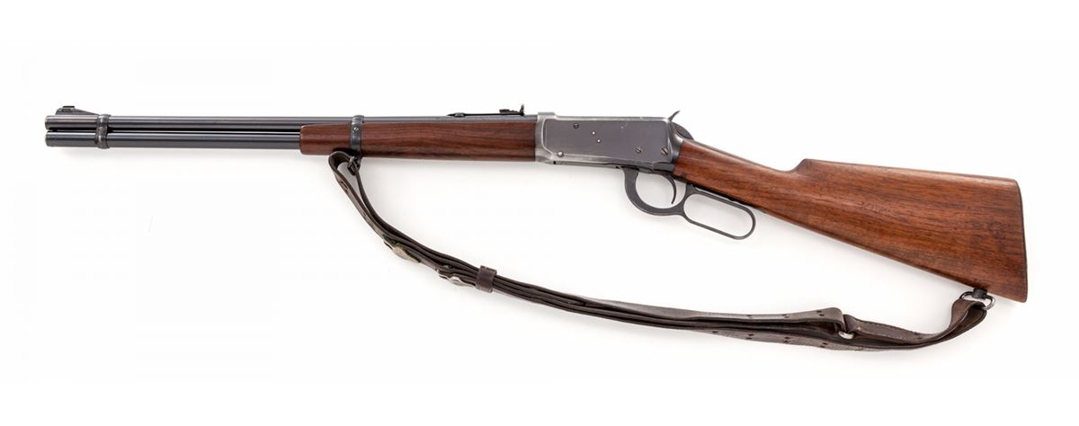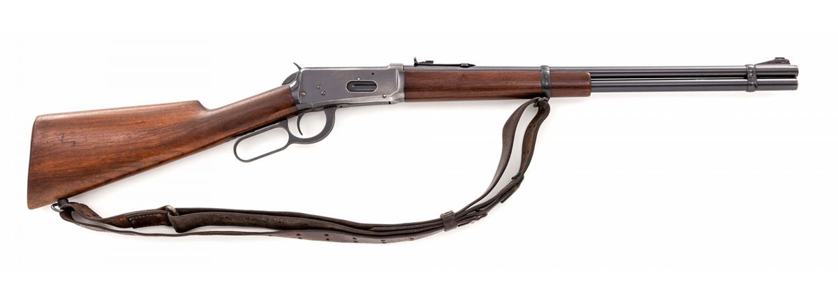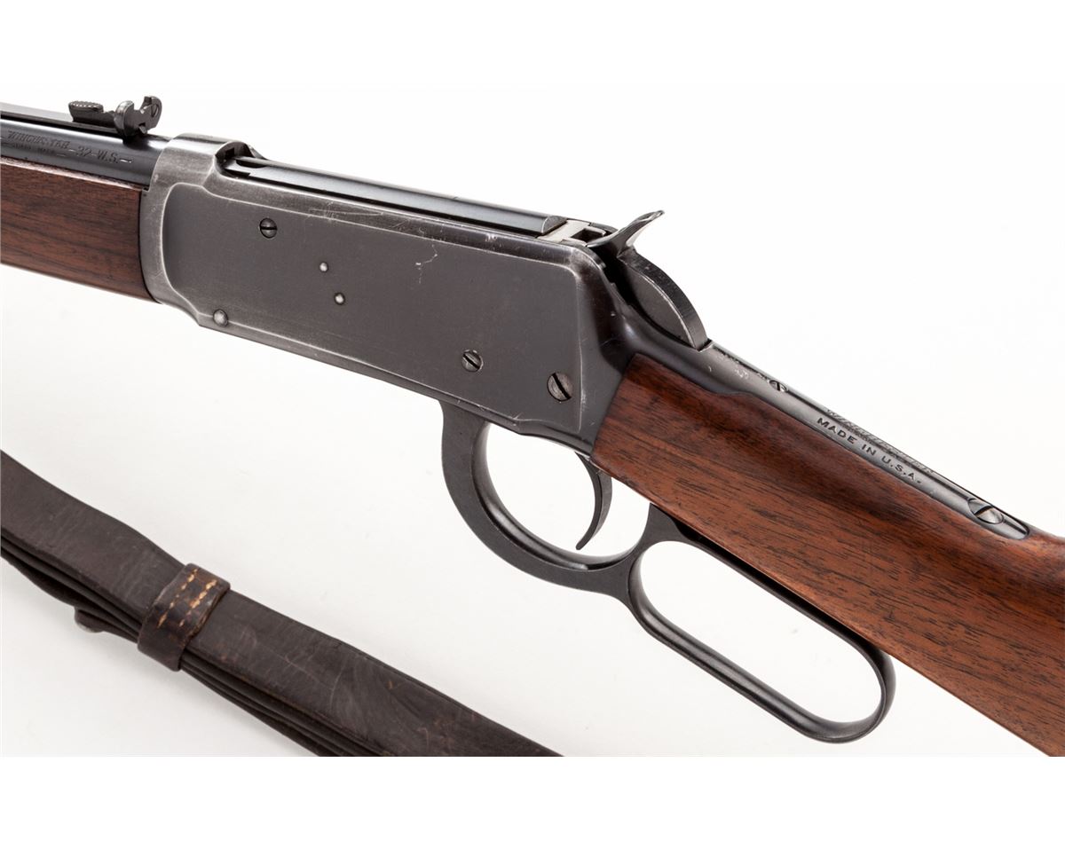Winchester Model 94 Lever Action Carbine, #1219980, .32 WS cal., 20'' barrel, blue finish, walnut stock, with sling swivels and U.S. M-1907 sling. Mfg'd 1942. Condition is excellent retaining approx. 96% original blue with thinning at balance point. Stock with light scuffs. Action is crisp, bore is bright. Est.: $800-$1,200. (C&R)