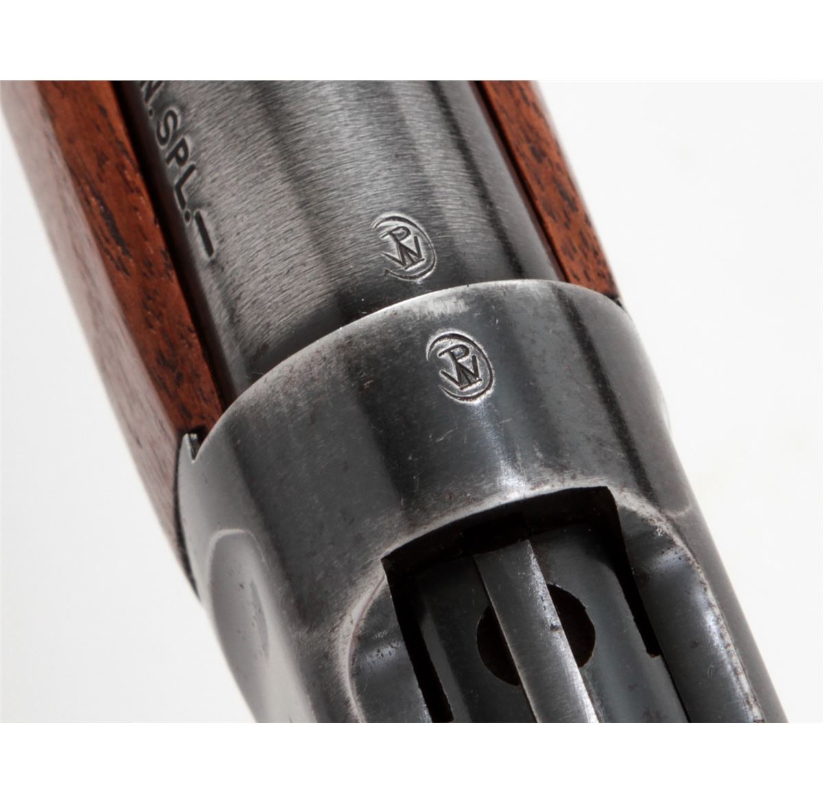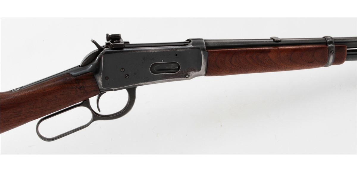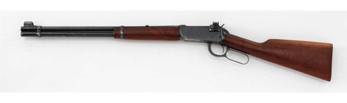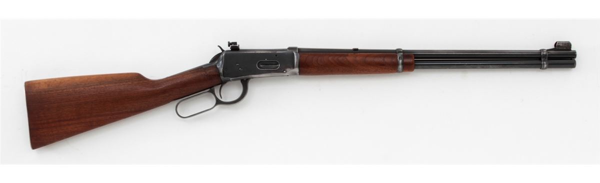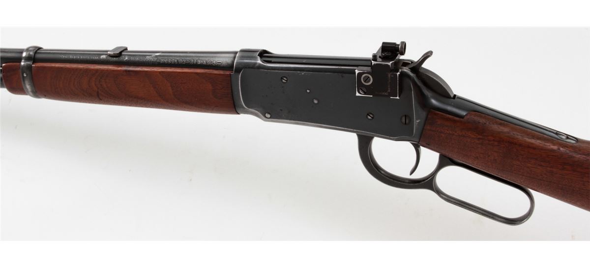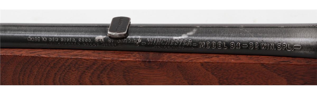 Winchester Model 94 Lever Action Carbine, #2078683, .32 Win. Spec. cal., 20'' barrel, blue finish, walnut stock and handguard. Mfg'd 1955. Rifle features Williams peep sight and dovetail blank at rear sight position. Condition is fine retaining approx. 94% blue with thinning at balance point and throughout length of barrel. Stock and forend show light scratches mostly to left side cheek area. Action remains crisp, bore is fine. Est.: $400-$600. (C&R)