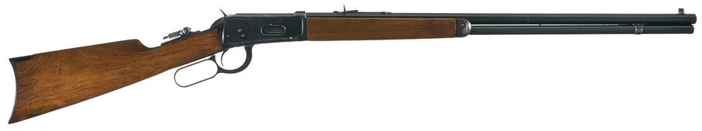 Manufactured in 1929. The left rear upper barrel flat is marked with the model, trade mark, nickel steel and caliber information, the opposite side is marked with the two line address, the top of the barrel and receiver at the breech is marked with the Winchester oval proof, the upper tang marking is covered by a tang sight and the serial number is on the bottom of the receiver. Dovetailed Lyman blade front sight with brass bead, adjustable buck horn rear sight marked "PAT. FEB. 22,27" on the base and Lyman short range tang mounted peep sight. All blue finish and mounted with a smooth walnut forearm with a steel end cap and straight grip stock with a crescent buttplate.