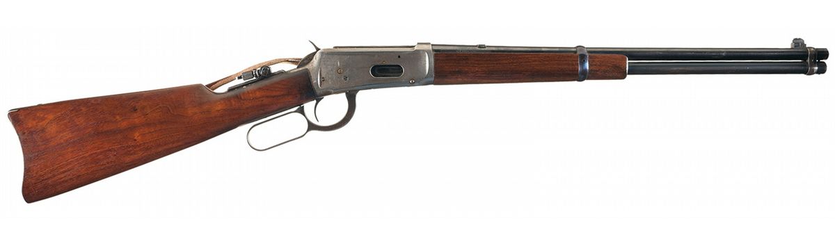 Manufactured in 1926. Pinned "94-C" marked Marble's blade front sight, filler block in the rear dovetail and a Lyman short range tang mounted peep sight. The left rear of the barrel is marked with the Model, Winchester trademark, nickel steel, caliber marking, and the Winchester oval proof is on top of the barrel and receiver at the breech. The upper tang marking is covered and the serial number is marked on the bottom of the receiver. Saddle ring and stud with a leather thong mounted on ring, all blue finish and mounted with a smooth walnut forearm and straight grip stock with a steel carbine buttplate.