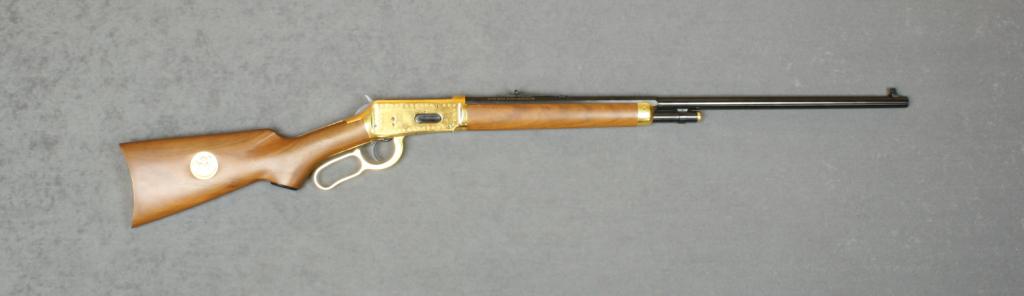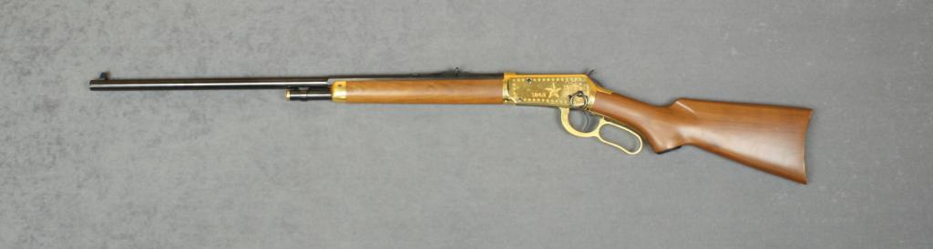 Winchester Model 94 Lone Star Commemorative  lever action rifle, .30-30 Win. cal., 26”  half round/half octagon barrel, half  magazine, blue and gold finish, wood stocks  with Lone Star Commemorative brass disc inlet in right side of butt stock, #LS39210. This  gun is in overall excellent condition showing  the majority of its original blue finish on  the barrel and loading tube with gold finish  to frame, lever, butt plate, fore end cap and loading tube cap; fine bore, action,  markings and wood. Est.:  $300-$500.